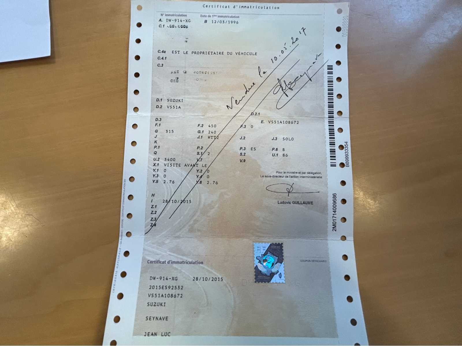Suzuki VX 800 motorfiets, voor het eerst op de weg gebracht op 12/03/1996, uitgerust met een 805 cc V-twin motor en cardan astransmissie. Het voertuig heeft 14,669 km op de kilometerteller (kilometerstand) getoond. De motor is in goede algemene staat gezien zijn leeftijd, met een nette presentatie. Belangrijkste kenmerken: Merk: Suzuki Model: VX 800 Jaar: 1996 Type: VS51A Chassisnummer: VS51A108672 Brandstof: Benzine Cilinderinhoud: 805 cm³ Vermogen: 41 kW Aandrijflijn: Cardan-as Kilometerstand: 14,669 km Status: Visueel schone motor Geen zichtbare lekkage Bekleding in goede staat Verf in goede algemene staat met normale gebruikstekenen Volledige uitlaat, leeftijdsadequate staat Banden in goede visuele staat Non Merk: Suzuki Model: VX 800 Type: VS51A Brandstof: Benzine Chassisnummer: VS51A108672 Cilinderinhoud: 800cc Datum eerste toelating: 1996 Vermogen (kW): 41kW Kleur: Rood Afgelezen kilometerstand: 14669km Transmissie: Gimbal Nationaliteit documenten: Frans Aantal sleutels: 1