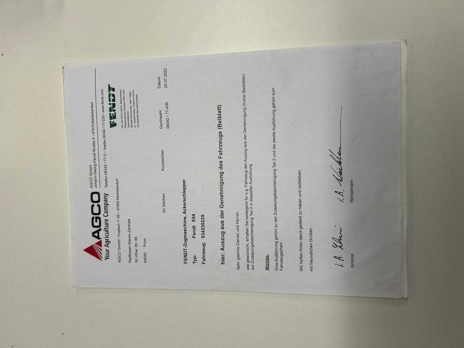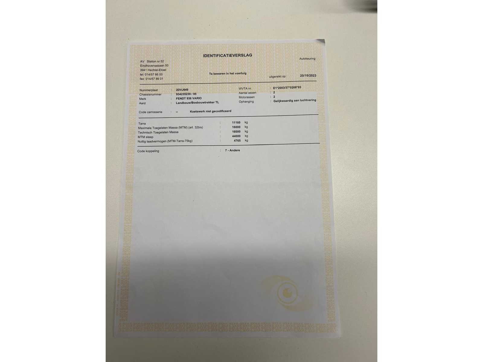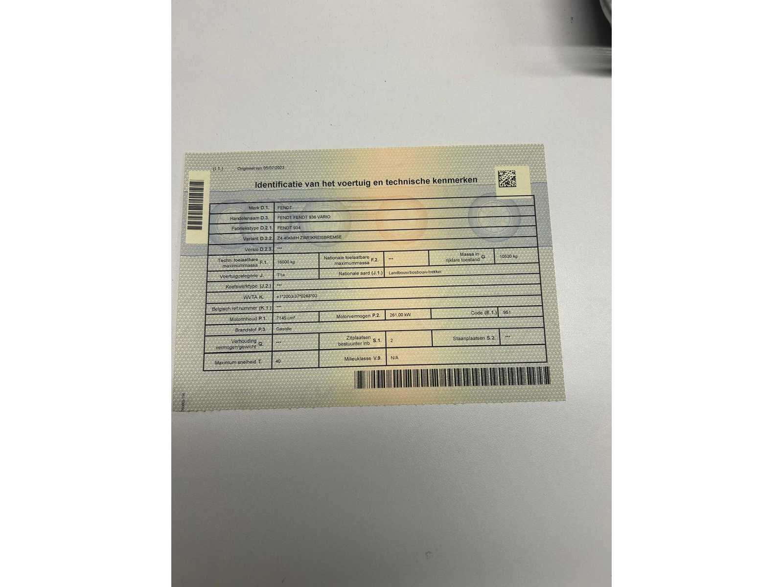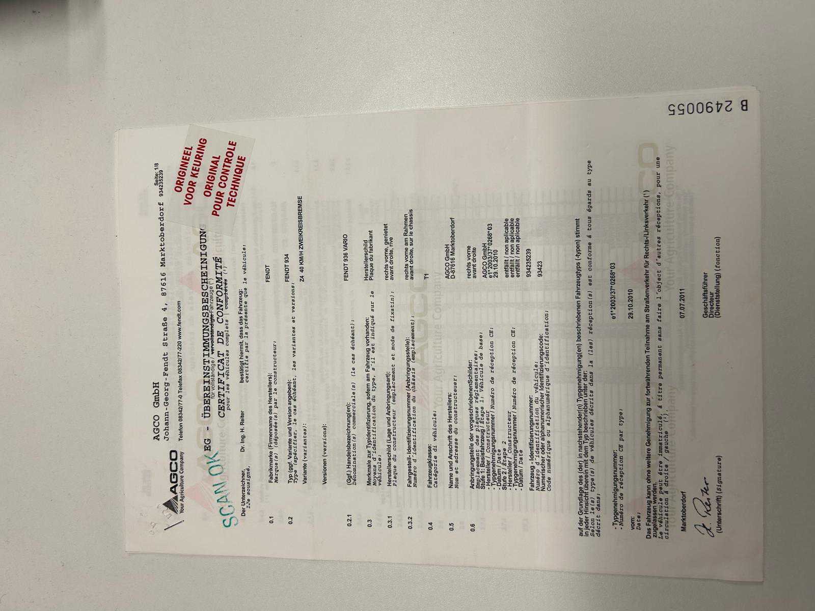 Aanwezige documenten: kentekenbewijs deel 1, identificatieverslag, gelijkvormigheidsattest. Nee Merk: Fendt Type: 936 Bouwjaar: 2011 Motorvermogen (kW): 261kW Afgelezen urenstand: 12340.7 Bandenmaat voor: 600/70 R34 Bandenmaat achter: 710/75 R 42 Eigen gewicht: 11160kg Chassisnummer: 934235239 Datum eerste toelating: 23/9/2011 Nationaliteit documenten: België