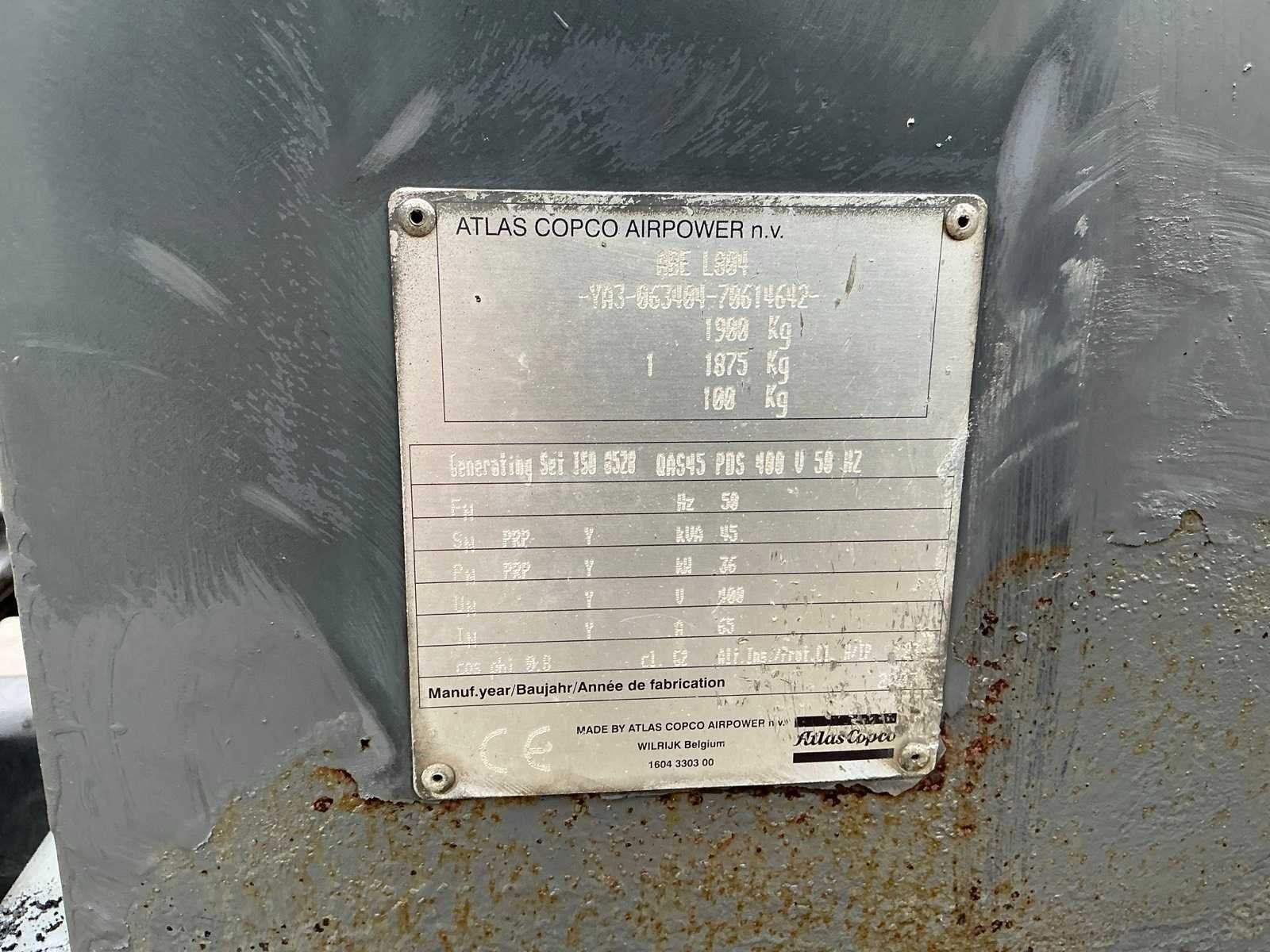 Nee Merk: Atlas Copco Type: 2244 Bouwjaar: 2007 Capaciteit.: 45kVA Diesel: true Afgelezen urenstand: 8906.3 Totale afmeting L: 4400mm Totale afmeting Breedte: 1600mm Totale afmeting Hoogte: 1820mm