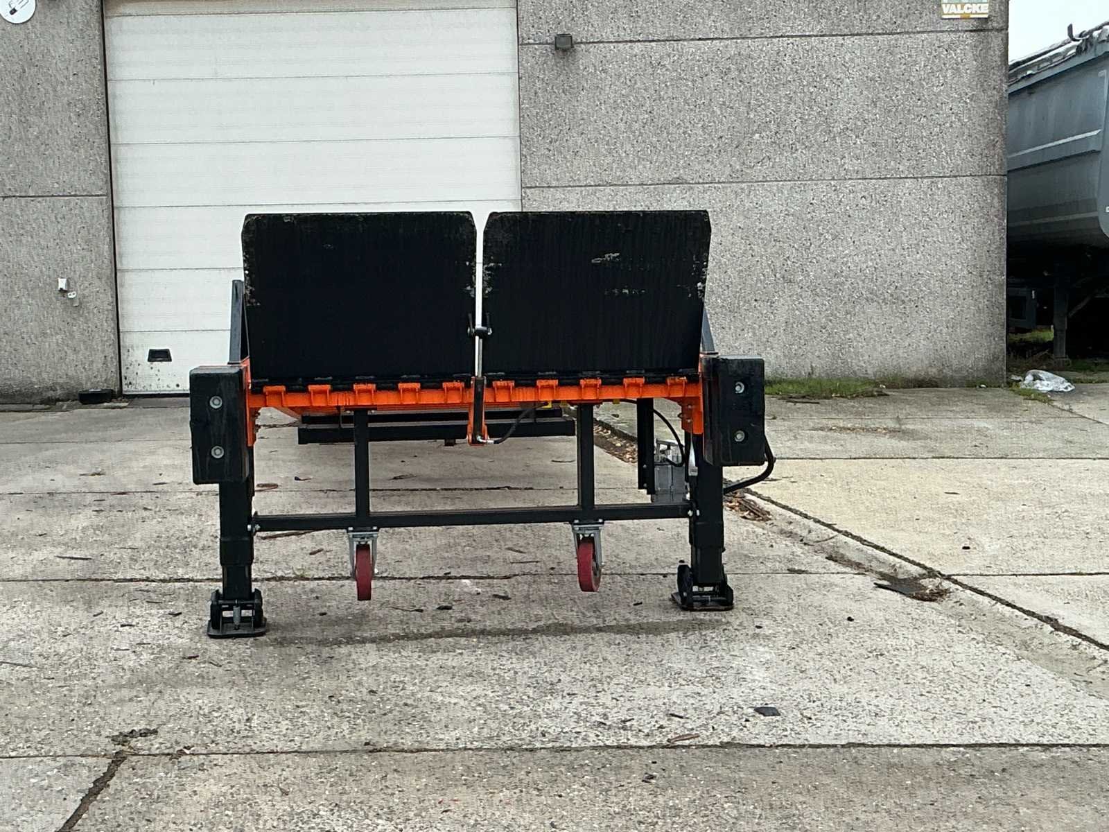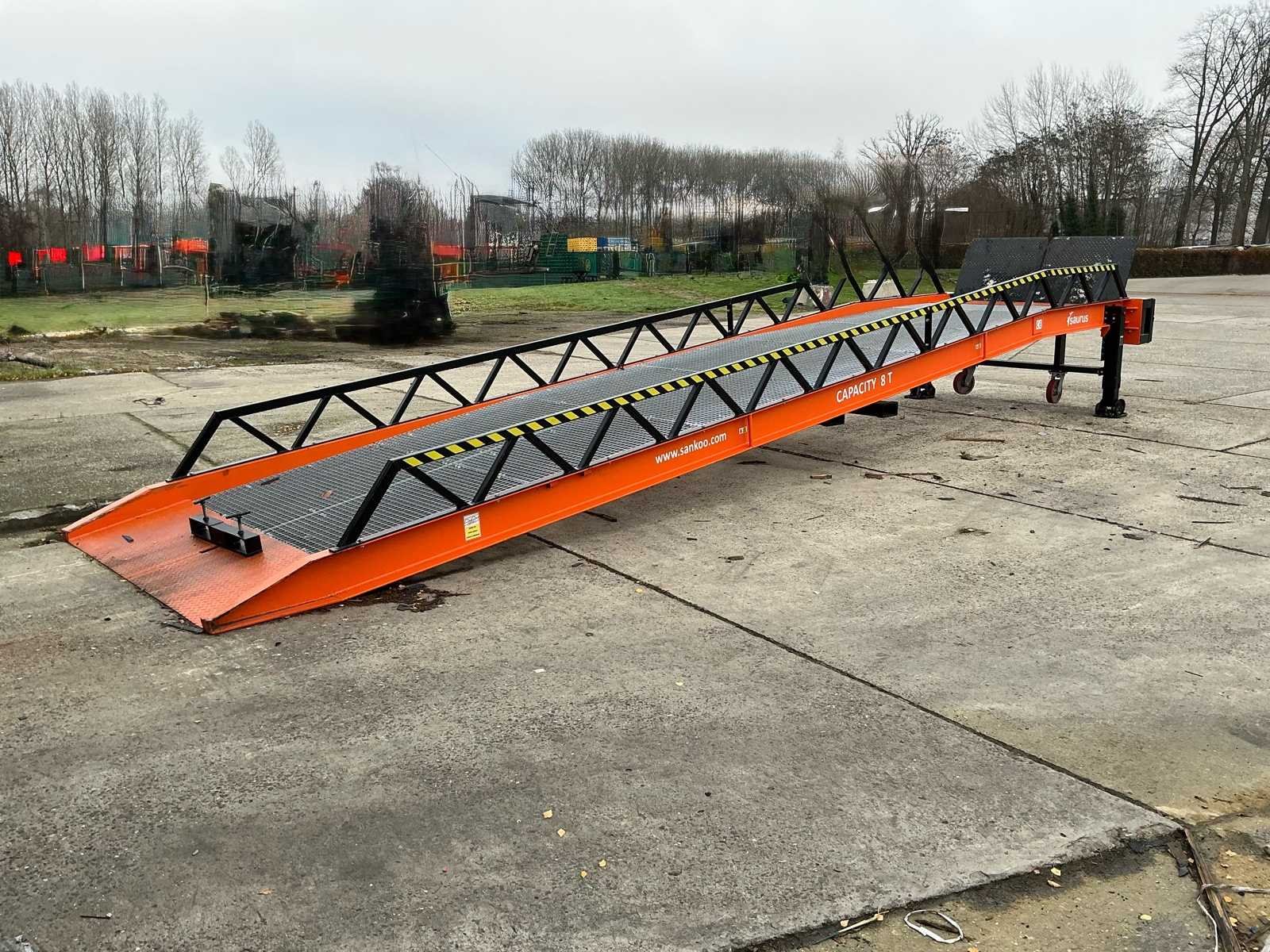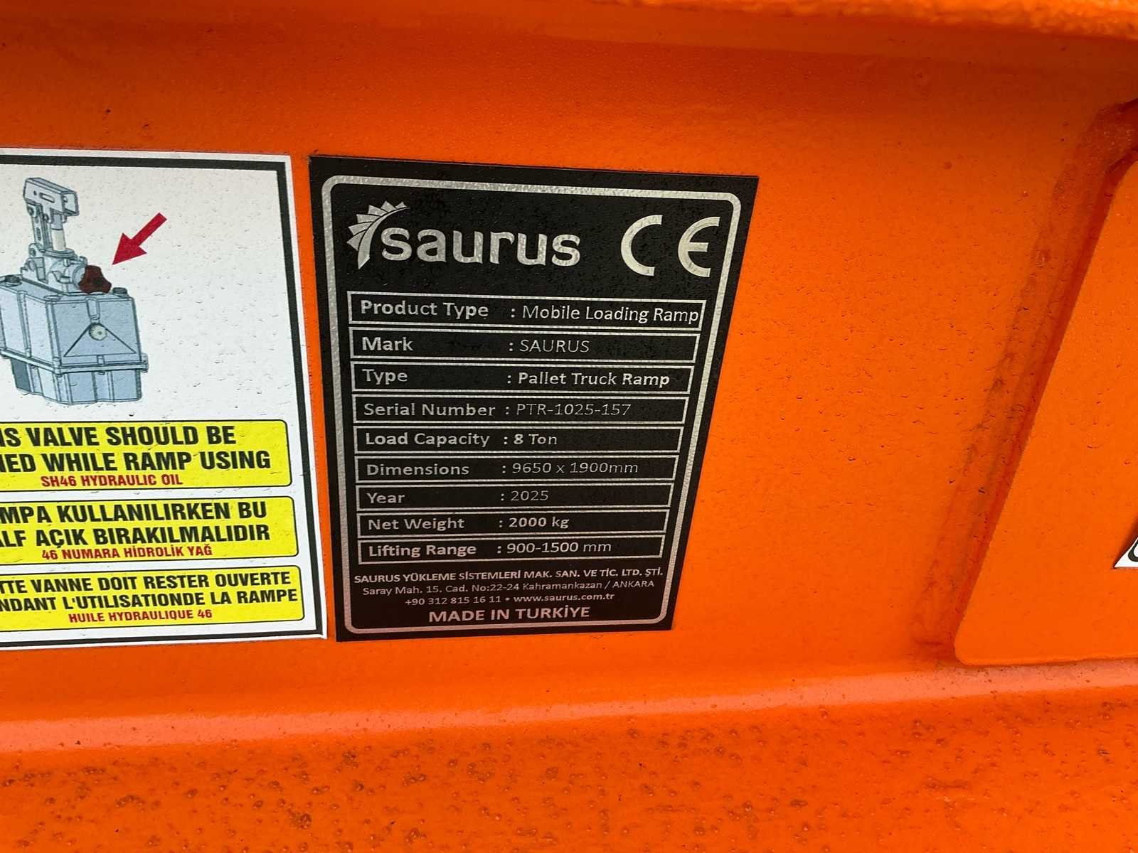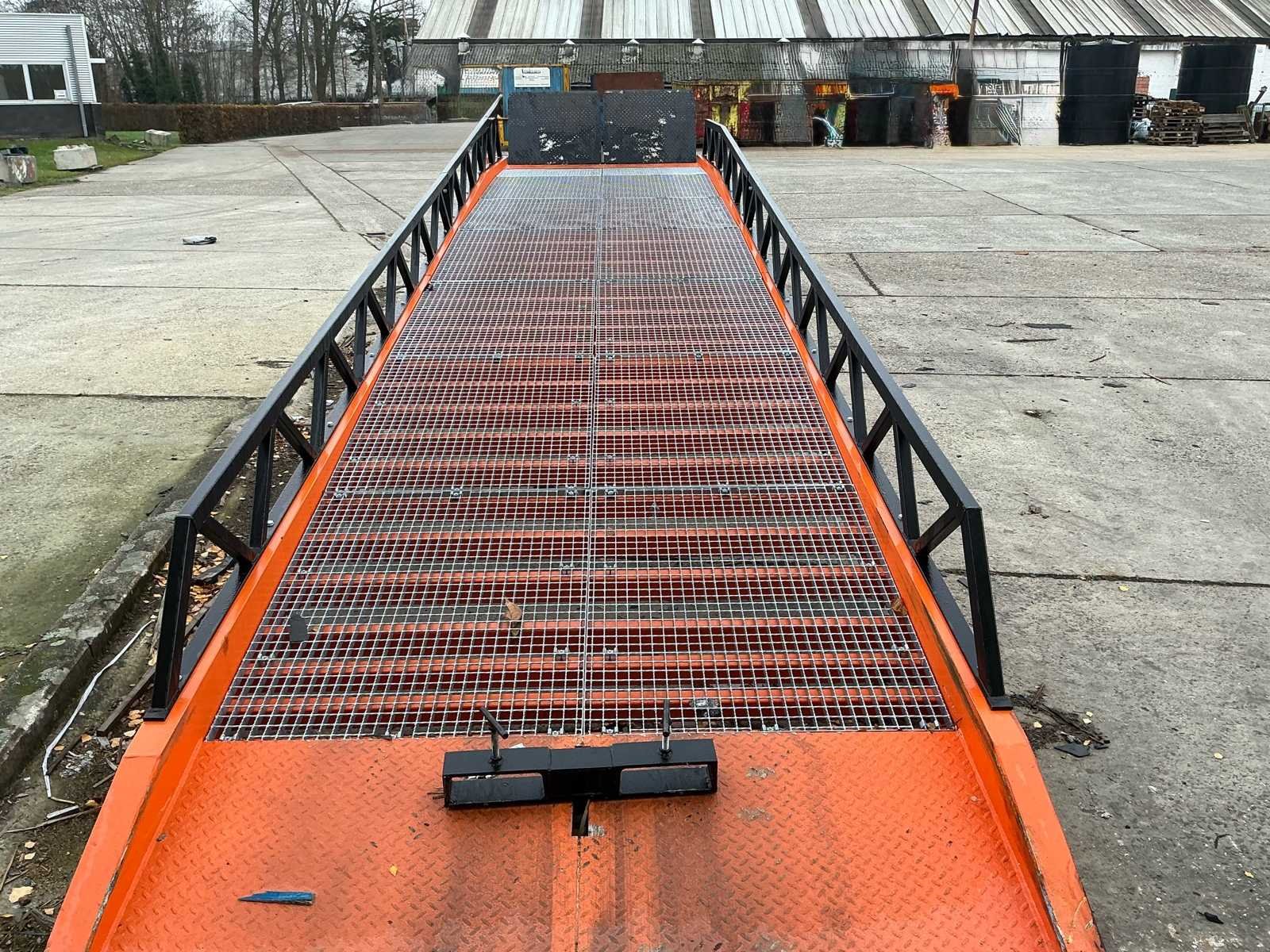 Nieuwstaat. Ook geschikt voor transpaletten. Load Capacity: ~12 000 kg (12 ton) — suitable for forklifts and similar equipment.  📏 Dimensions (approx): • Length: ~11 000–11 500 mm (≈ 11–11.5 m)  • Width: ~2 000 mm (internal working width)  ⚙️ Load Height Range: Typically suitable for loading heights roughly 1 000–1 600 mm, adjustable with built-in hydraulics.  🛞 Mobility: Heavy-duty wheels or casters allow repositioning with a forklift.  🛠️ Construction: CE certified, steel frame with anti-slip deck and side safety barriers. No Merk: Saurus Eigen gewicht: 3000kg Totale afmeting L: 11000mm Totale afmeting Breedte: 2000mm Totale afmeting Hoogte: 1600mm