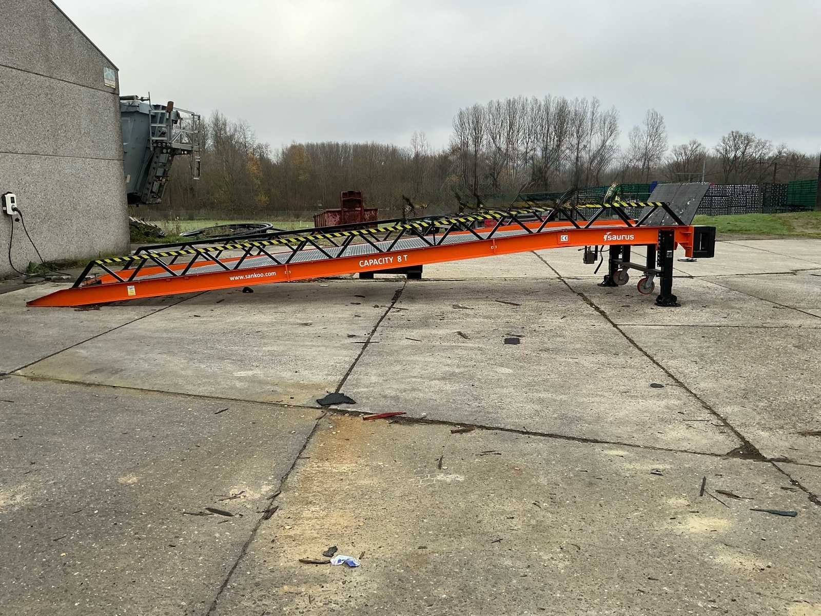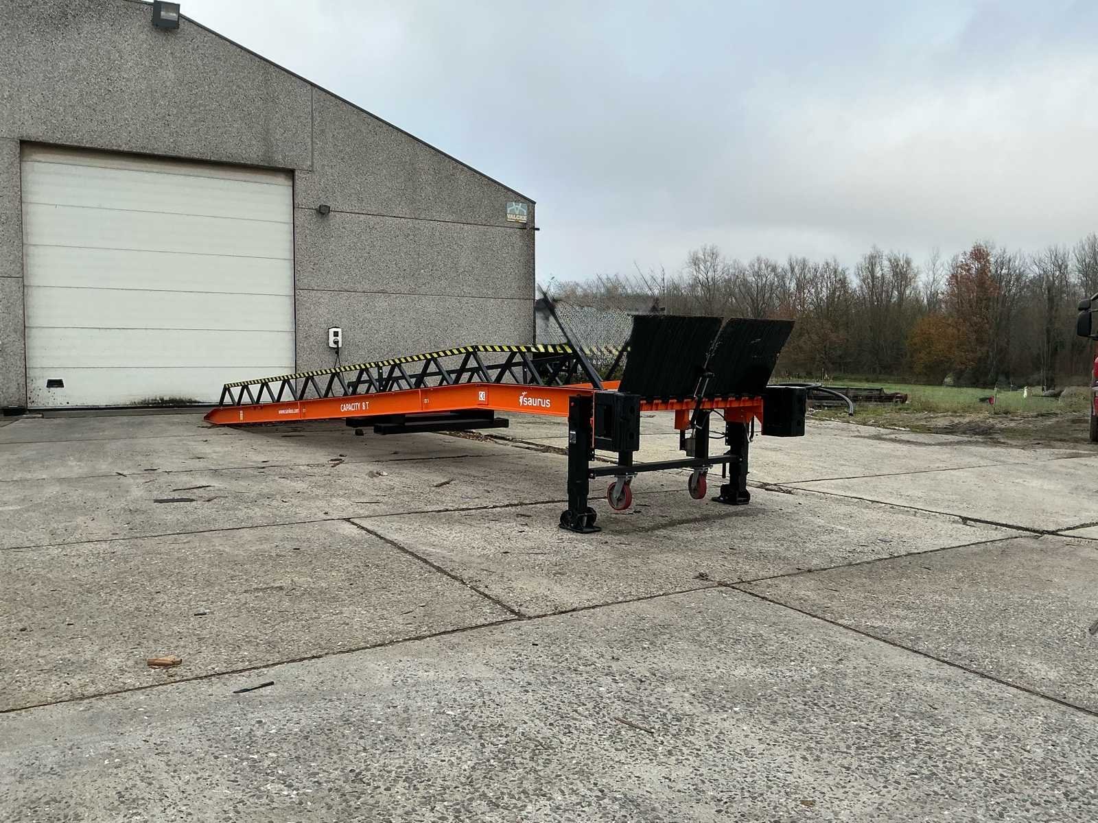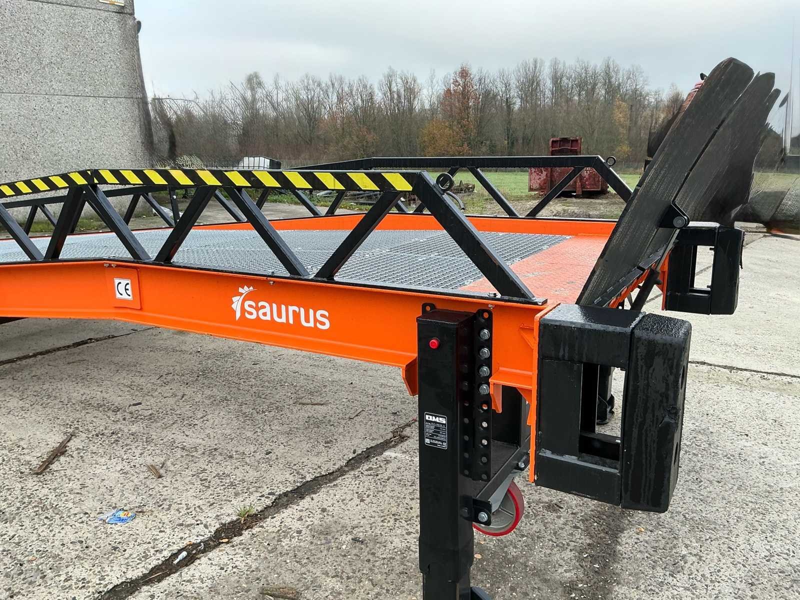 Nieuwstaat. Ook geschikt voor transpaletten. Load Capacity: ~12 000 kg (12 ton) — suitable for forklifts and similar equipment.  📏 Dimensions (approx): • Length: ~11 000–11 500 mm (≈ 11–11.5 m)  • Width: ~2 000 mm (internal working width)  ⚙️ Load Height Range: Typically suitable for loading heights roughly 1 000–1 600 mm, adjustable with built-in hydraulics.  🛞 Mobility: Heavy-duty wheels or casters allow repositioning with a forklift.  🛠️ Construction: CE certified, steel frame with anti-slip deck and side safety barriers. No Merk: Saurus Eigen gewicht: 3000kg Totale afmeting L: 11000mm Totale afmeting Breedte: 2000mm Totale afmeting Hoogte: 1600mm