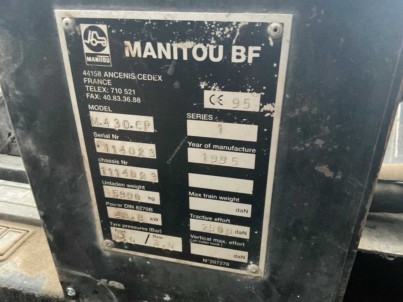 Remmen dienen nagekeken te worden Olielekken dienen nagekeken en hersteld te worden Start , rijdt , draait en kan heffen. Nee Merk: Manitou Type: M 430 CP Bouwjaar: 1995 Brandstof: Diesel Mast: Duplex Soort band: Luchtbanden Aantal wielen: 4 Ruw terrein: true Duplex mast: true Eigen gewicht: 5990kg Hefvermogen: 2500kg Lepellengte: 1200mm Max. hefhoogte: 3000mm Luchtbanden: true Diesel: true