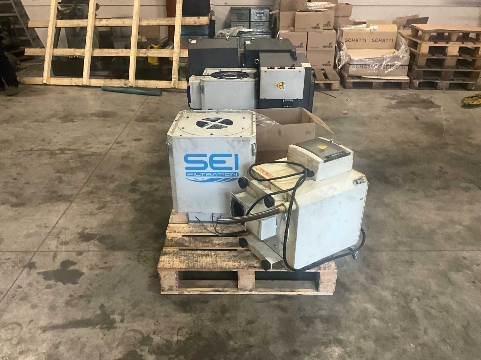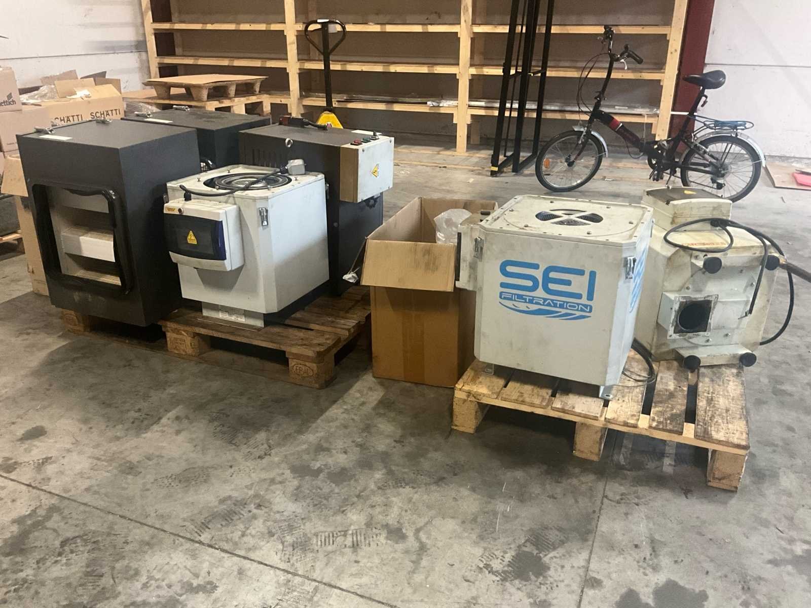 Het zijn SEI Filtration mist collectors & olie-/emulsiefilters. Deze toestellen worden gebruikt om: ✔ olienevel ✔ emulsiedampen ✔ rook ✔ stof en fijne metaaldeeltjes … uit de lucht te filteren bij CNC-machines. In een metaalbedrijf moet dit verplicht voor veiligheid, gezondheid en om machines proper te houden. 📌 MODEL-INFORMATIE PER TOESTEL 🔷 1. SEI Filtration – Model XMC 500 Te herkennen op foto 3 (op het display staat XMC 500). Functies: Afzuigen van olienevel Elektrisch filter 400V aansluiting Indicaties: Filter ON, Filter OFF, Filter clogged Typische specs: Debiet: ± 400–600 m³/h Vermogen: 0.35–0.75 kW Gebruikt bij middelgrote CNC-machines 🔷 2. SEI Filtration – Model CM 200 S (Te zien op de witte unit met rode opdruk “CMG-200-S”) Dit is een centrifugaal olienevelfilter. Functies: Hoge filtratie van emulsienevel Geschikt voor kleinere CNC’s Stil en compact 400V industriemotor 🔷 3. SEI Filtration – Model E1 800 (Etiketfoto: SERIE E1, MODELLO 800, bouwjaar 2016) Dit is een grotere industriële mist collector met hoog debiet. Typische capaciteiten: 800 m³/h of hoger Wordt gebruikt bij grotere bewerkingscentra 🔷 4. SEI Filtration – Serie P-2011 Zwart model met metalen plaatje (SERIE P-2011). Dit is een prefilter- of hoofdfilterunit voor grotere installaties. 🔷 5. Diverse losse filterframes (in doos) Op foto 7 zie je losse filtercassettes, vermoedelijk: voorwisseling filters HEPA-filters actieve kool filters Deze zijn vaak erg duur in aankoop. ⚙️ WAAR WORDEN DEZE VOOR GEBRUIKT? CNC freesmachine CNC draaimachine Langdraaier Koelvloeistofmachines Industriële productielijnen Ze halen schadelijke nevel uit de lucht → verplicht volgens ARAB en veiligheidsnormen. ⚡ Stroomvoorziening De meeste toestellen werken op: 400V 3-fase Sommige kleine units op 230V Nee