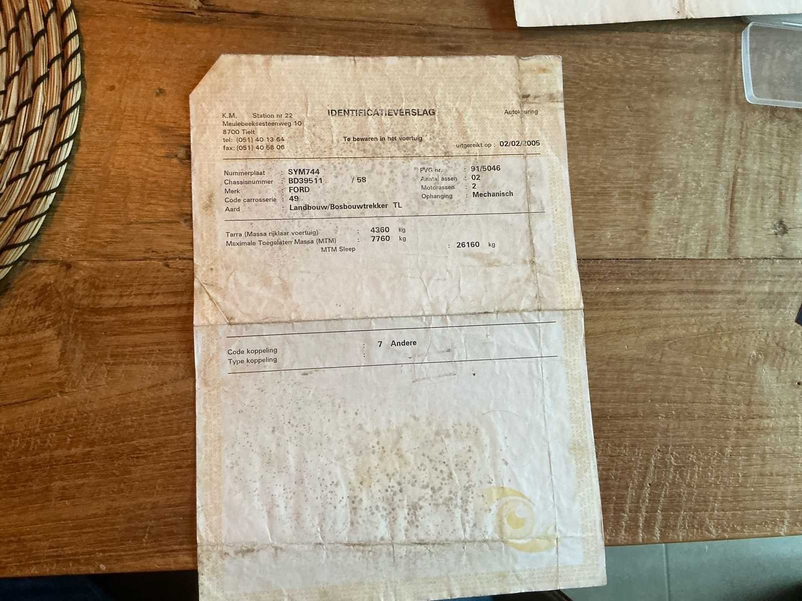 Hydraulisch 3e punt ( topstang), banden ok, start en rijdt, alle papieren aanwezig. Nee Merk: Ford Type: 640 SLE-_ DT Bouwjaar: 1993 Motorvermogen (kW): 85kW Afgelezen urenstand: 8000 Versnellingsbaktype: 16x16 transmissie 4traps- powershift Cabine: true Eigen gewicht: 3400kg Totale afmeting L: 4200mm Totale afmeting Breedte: 1900mm Totale afmeting Hoogte: 2800mm Datum eerste toelating: 18/03/1993 Nationaliteit documenten: België