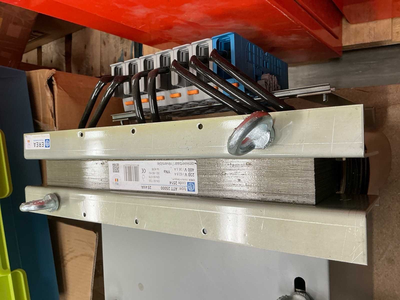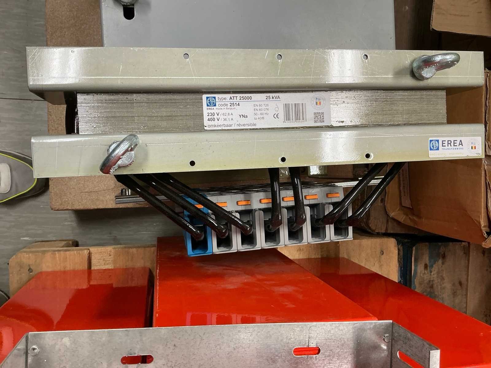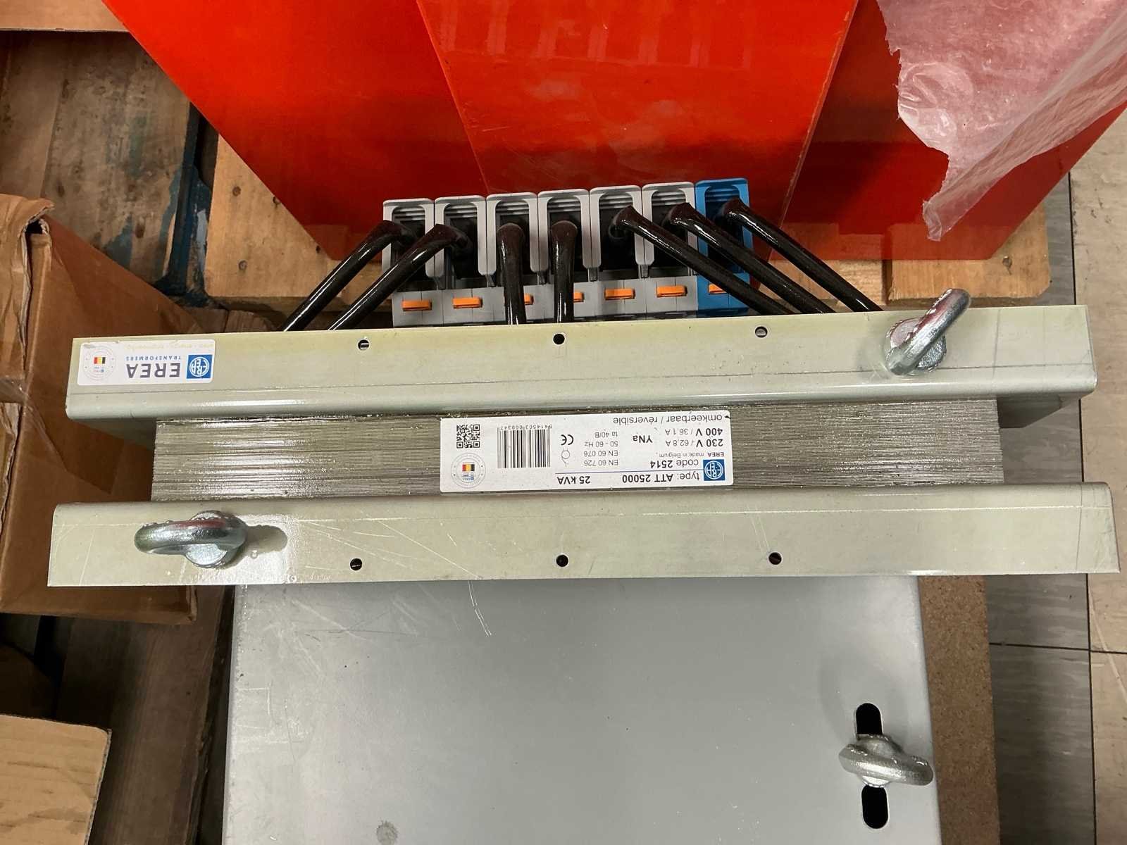Transformator zonder behuizing in Nieuwstaat. 230 V /. 400 V omkeerbaar No Merk: Eren Model: ATT 25000 Product type: Transformator Lengte: 49cm Breedte: 25cm Hoogte: 42cm