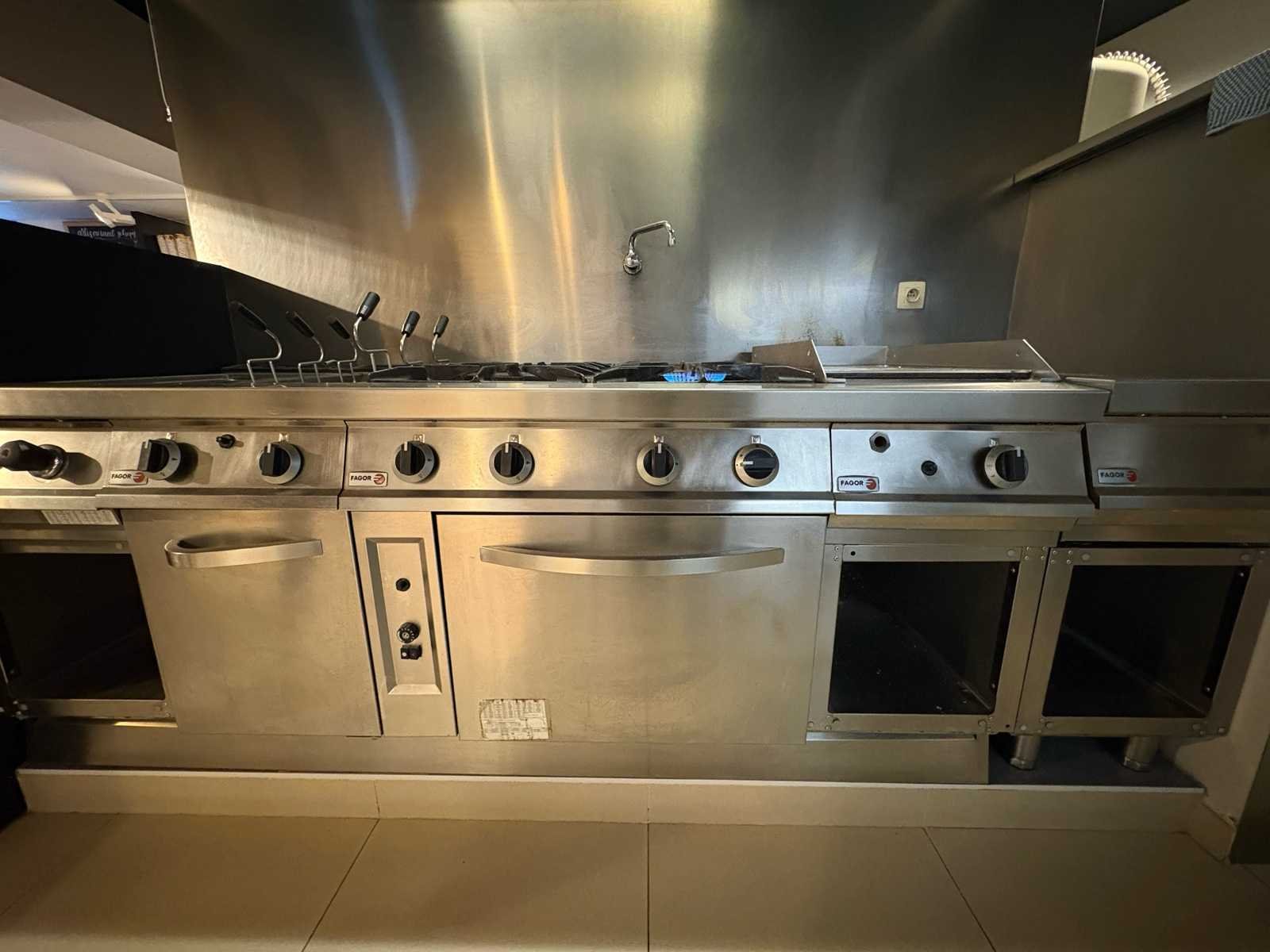 Gasfornuis met geïntegreerde oven Tepan Yaki met opslaglade Bain Marie Pastakoker Gasaansluiting en watertoevoer werkend! No Merk: Fagor Model: Gasfornuis Bouwjaar: 2012 Product type: Combinatie Lengte: 100cm Breedte: 400cm Hoogte: 120cm Materiaal: Inox