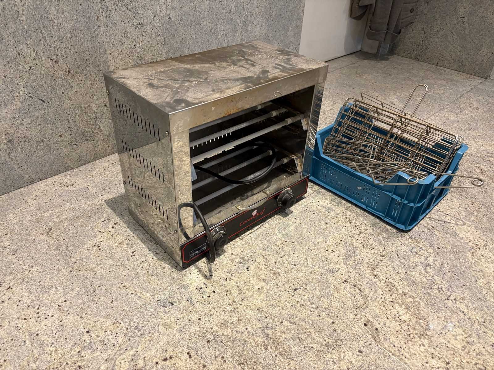 Werkende inschuiftoaster met houders No Merk: Caterchef Type: Toaster AT360 Bouwjaar: 2019 Aansluiting: 230V Totale afmeting L: 200mm Totale afmeting Breedte: 450mm Totale afmeting Hoogte: 500mm