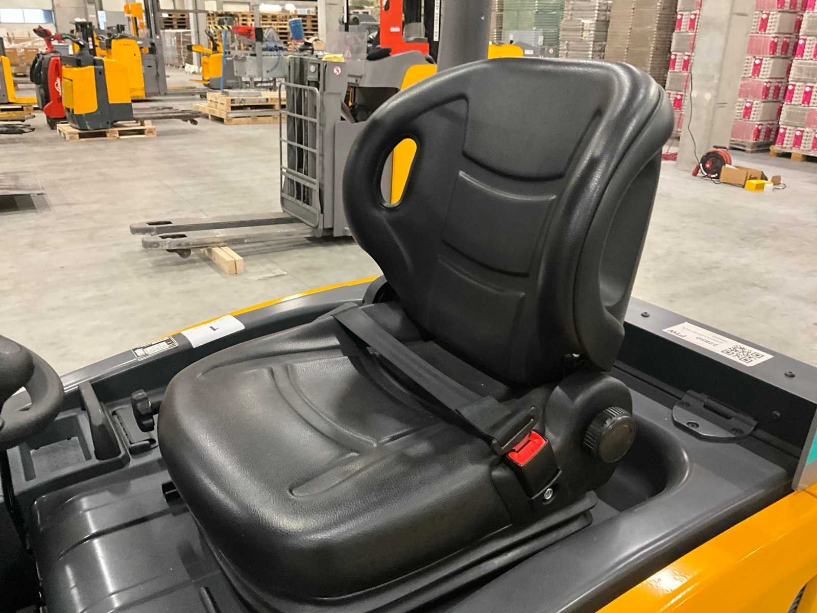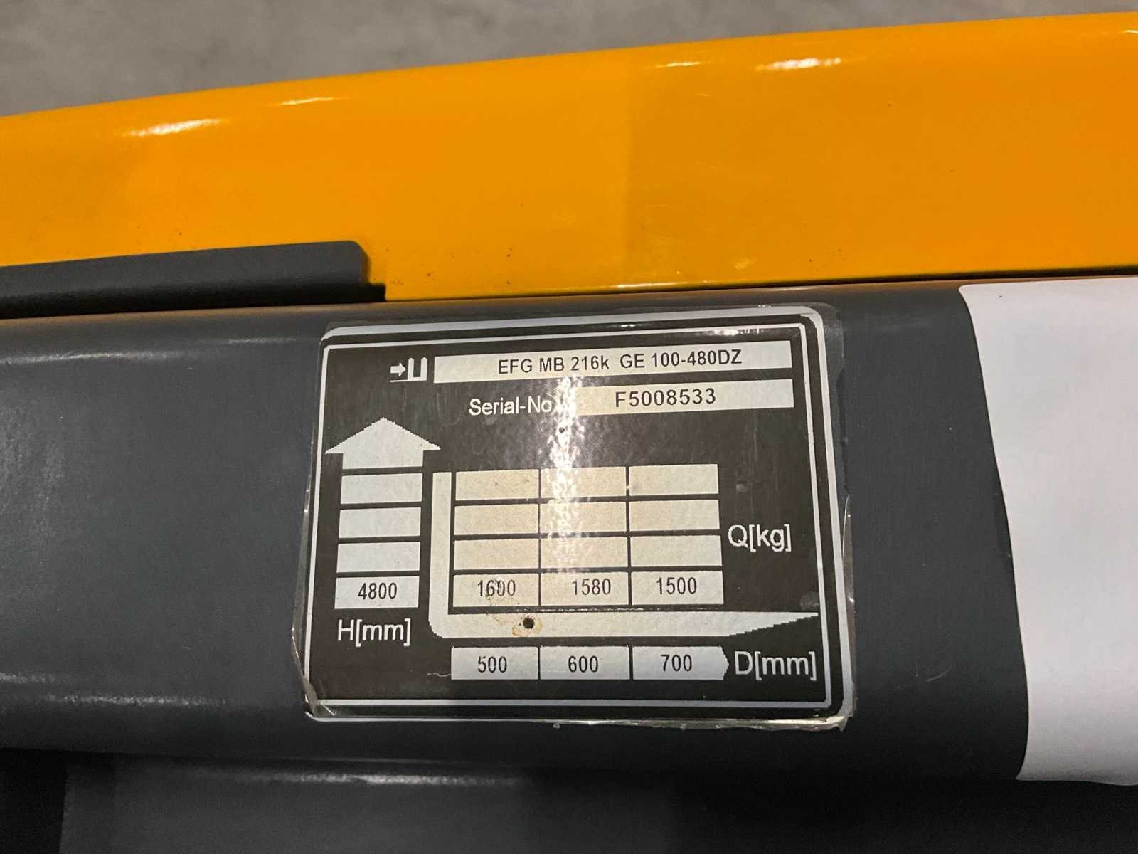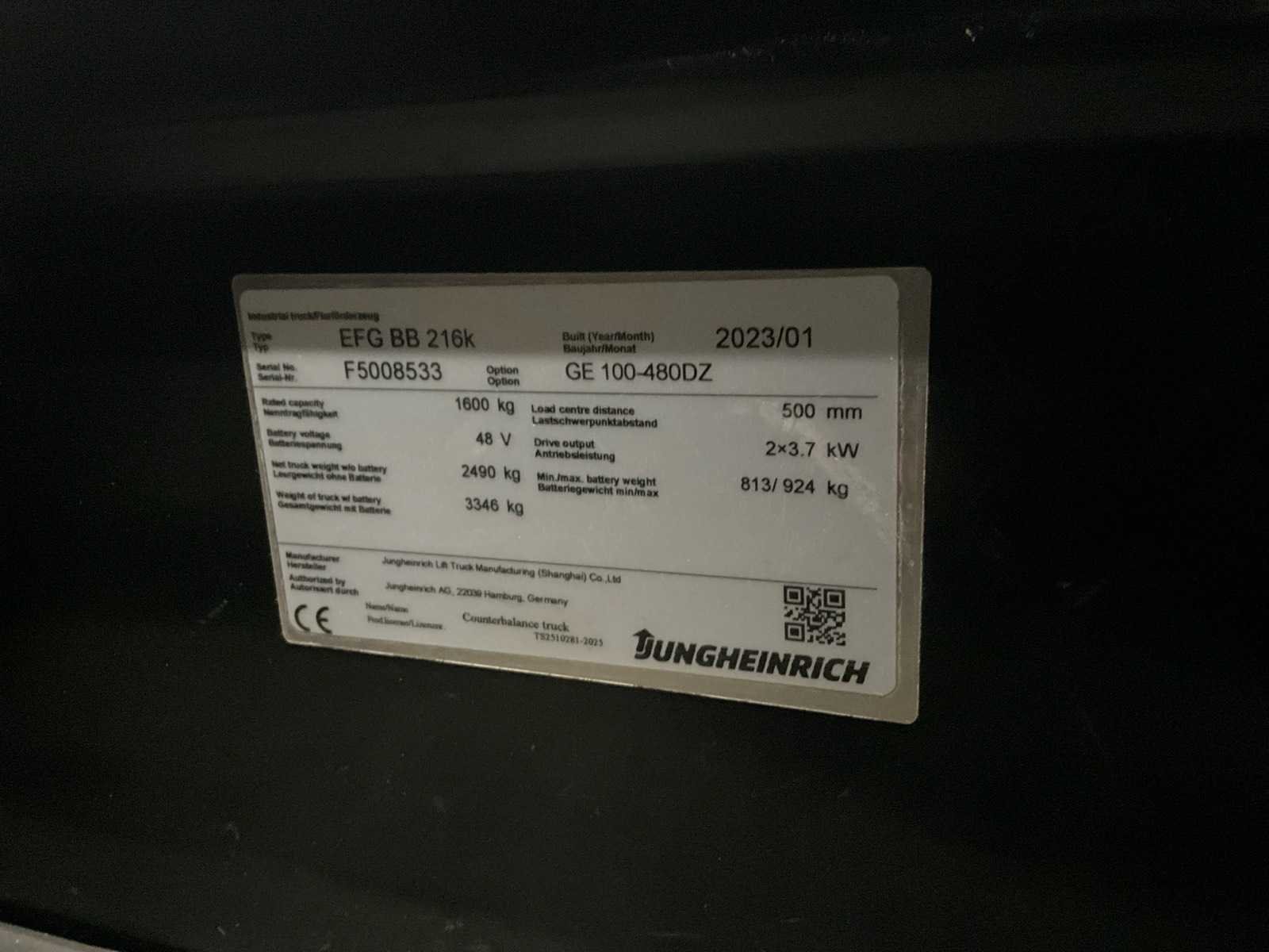 Nee Merk: Jungheinrich Type: EFG BB 216K Bouwjaar: 2023 Serienummer: F5008533 Afgelezen urenstand: 35 Triple mast: true Hefvermogen: 2500kg Lepellengte: 1000mm Max. hefhoogte: 4800mm Vol rubber banden: true Minimale doorrijhoogte: 2100mm
