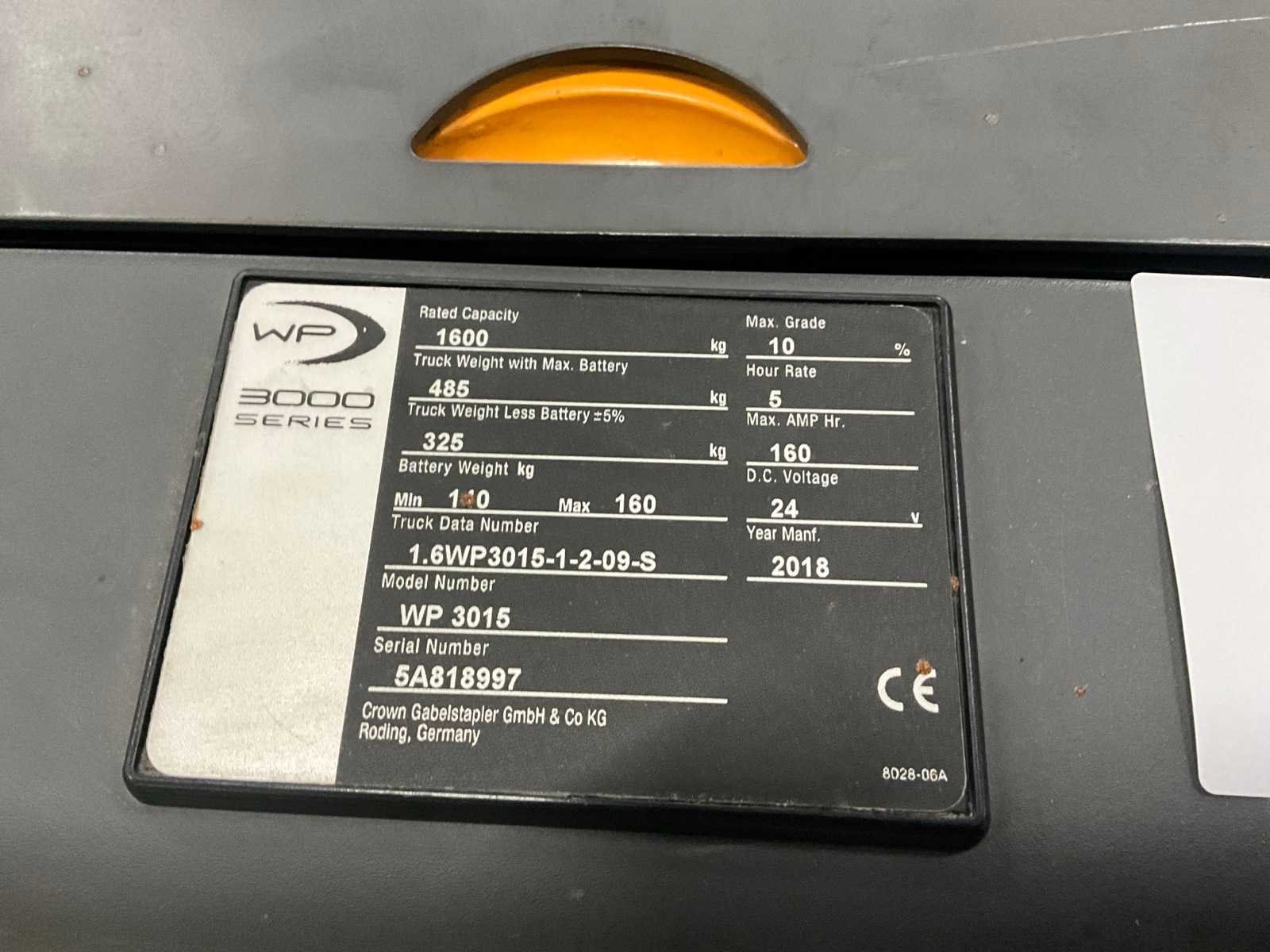 Nee Merk: Crown Type: WP 3015 Bouwjaar: 2018 Serienummer: 5A818997 Hefvermogen: 1600kg Lepellengte: 1150mm