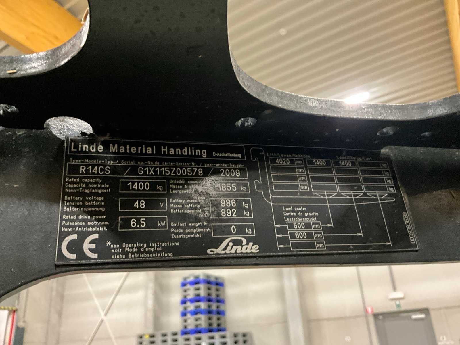 Nee Merk: Linde Type: R14CS Bouwjaar: 2009 Serienummer: G1X115Z00578 Afgelezen urenstand: 3004 Triple mast: true Hefvermogen: 1400kg Lepellengte: 1150mm Max. hefhoogte: 4020mm Minimale doorrijhoogte: 1970mm