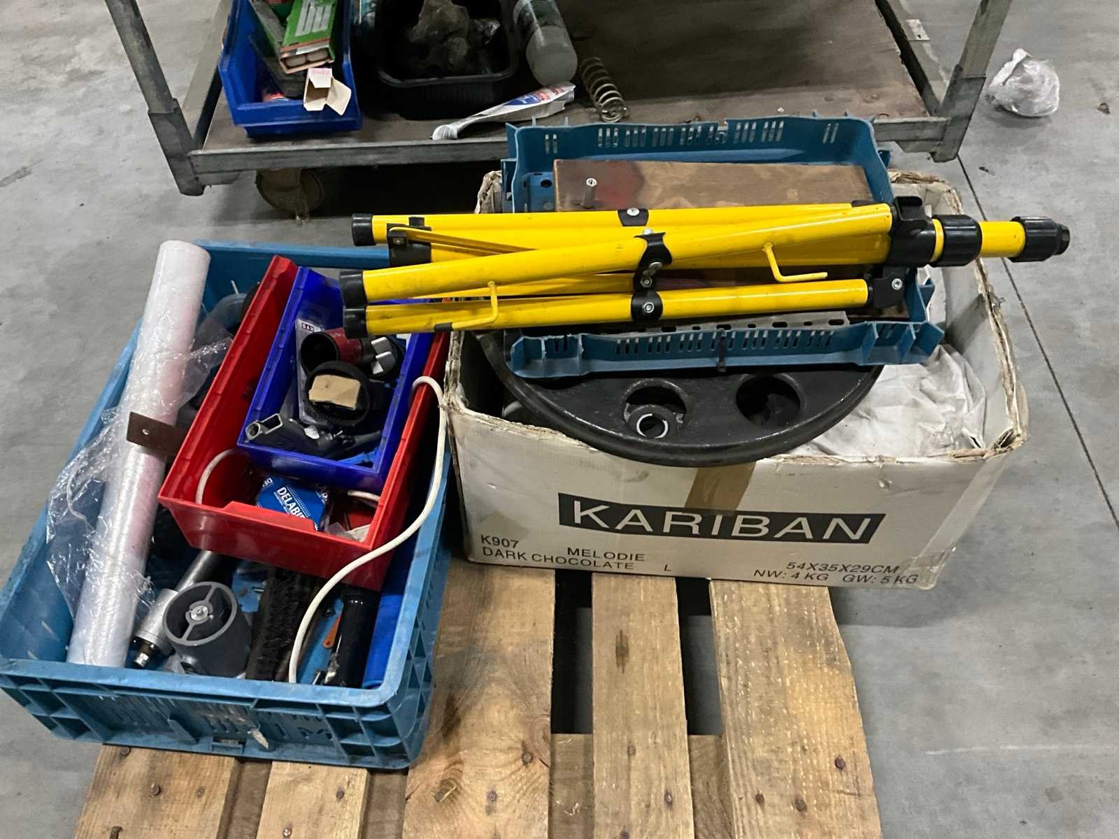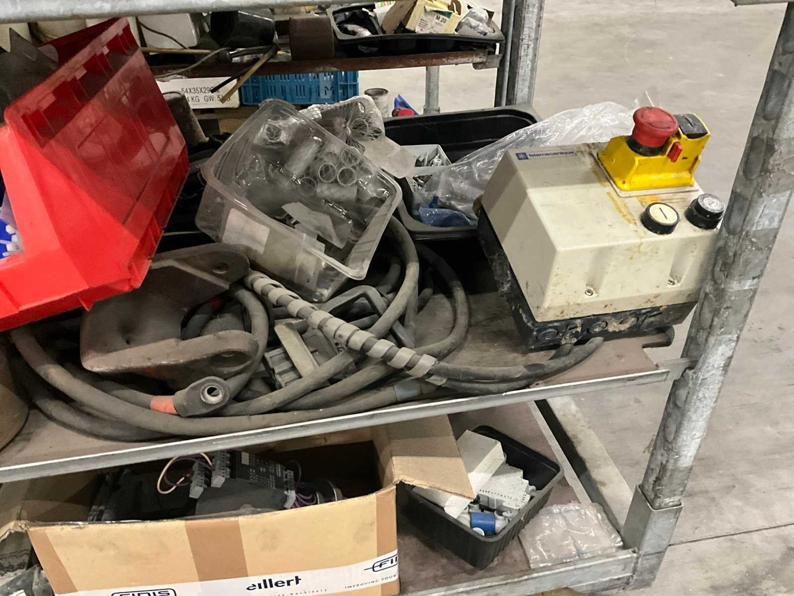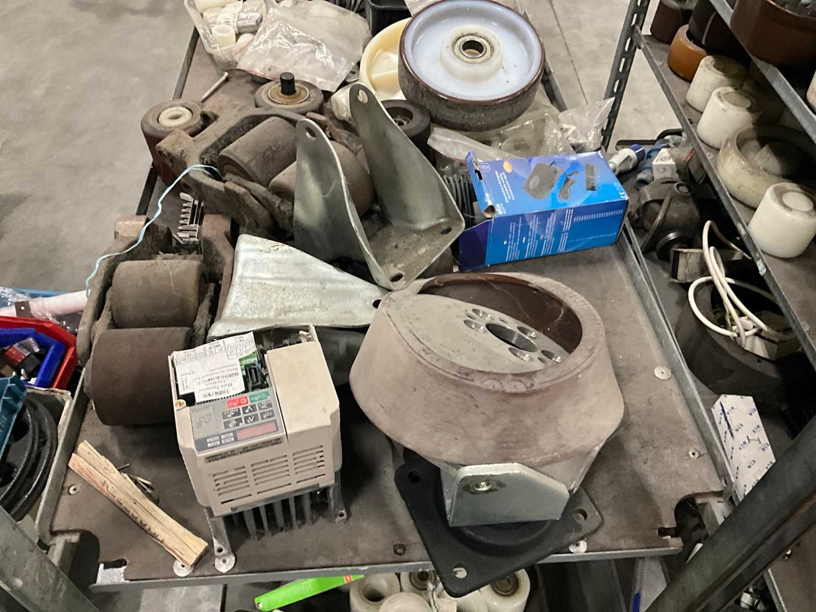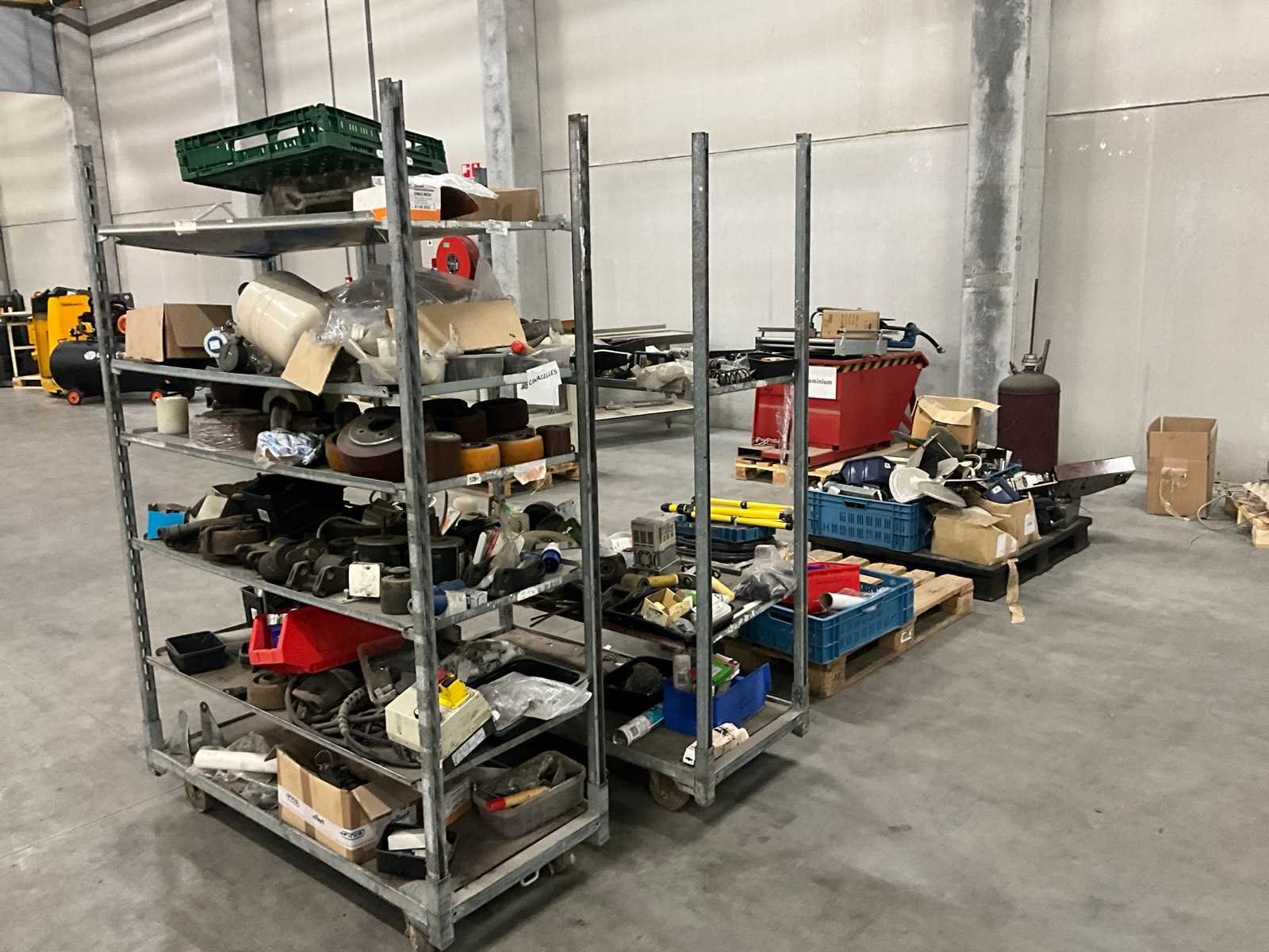 Waaronder diverse wielen, gewichten, electromotoren, lampen, aandrijfriemen, waaronder liggende op 2 plantenkarren Nee