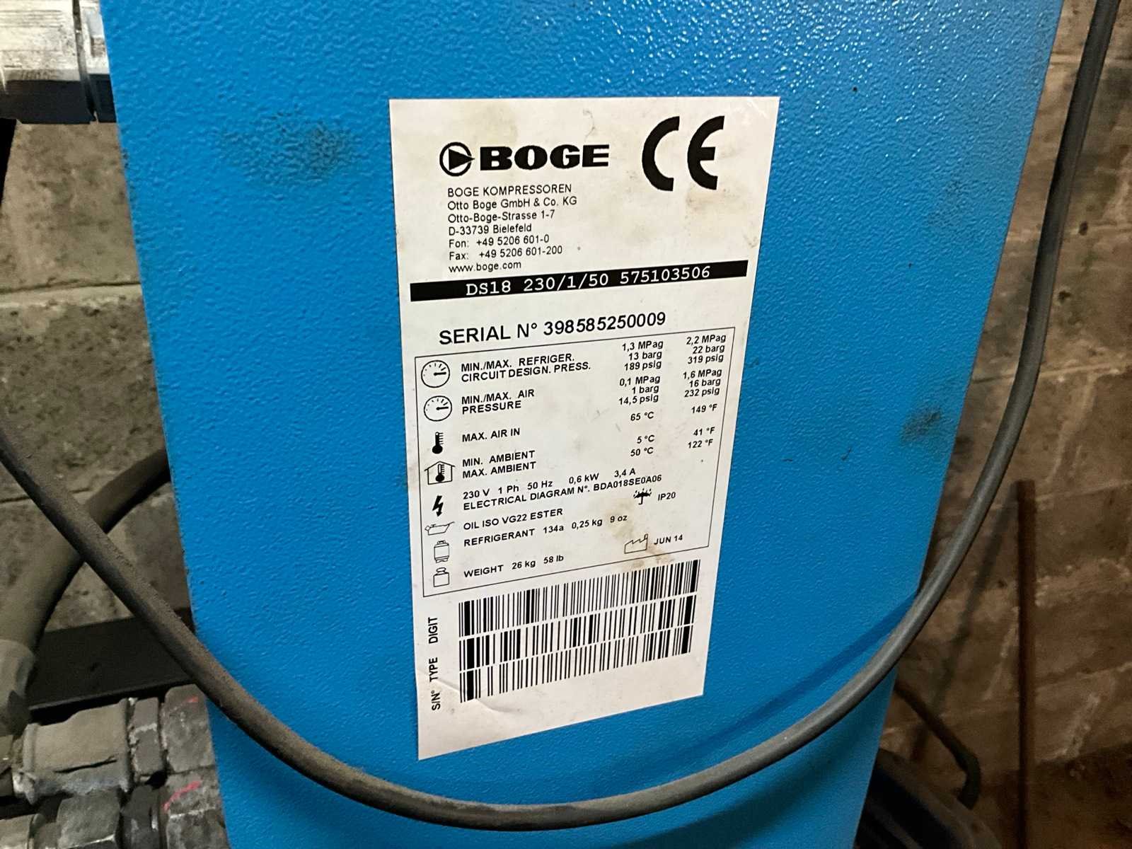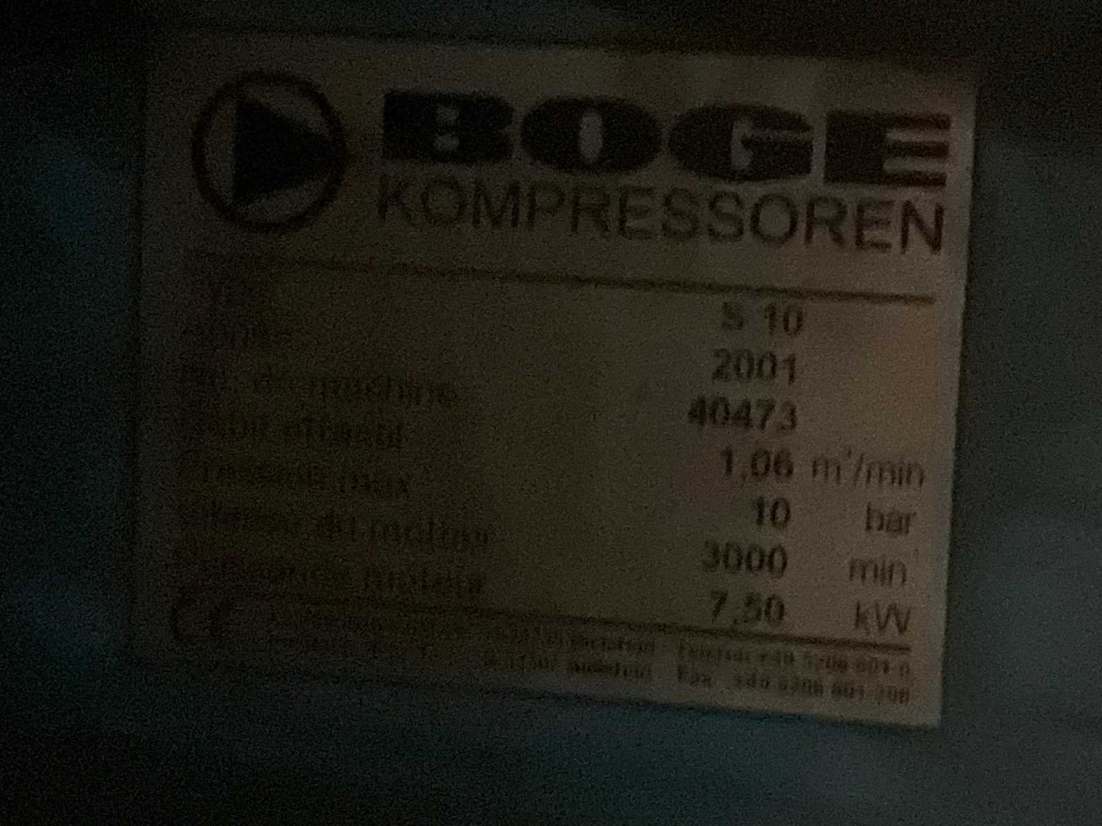 Voorzien van: • koeldroger Boge DS18 Nee Merk: Boge Type: S10 Bouwjaar: 2001 Serienummer: 40473 Capaciteit.: 10bar Luchtstroom: 1060l/min Vermogen: 7.5kW Buffertank inhoud: 500l Totale afmeting L: 1800mm Totale afmeting Breedte: 700mm Totale afmeting Hoogte: 1700mm