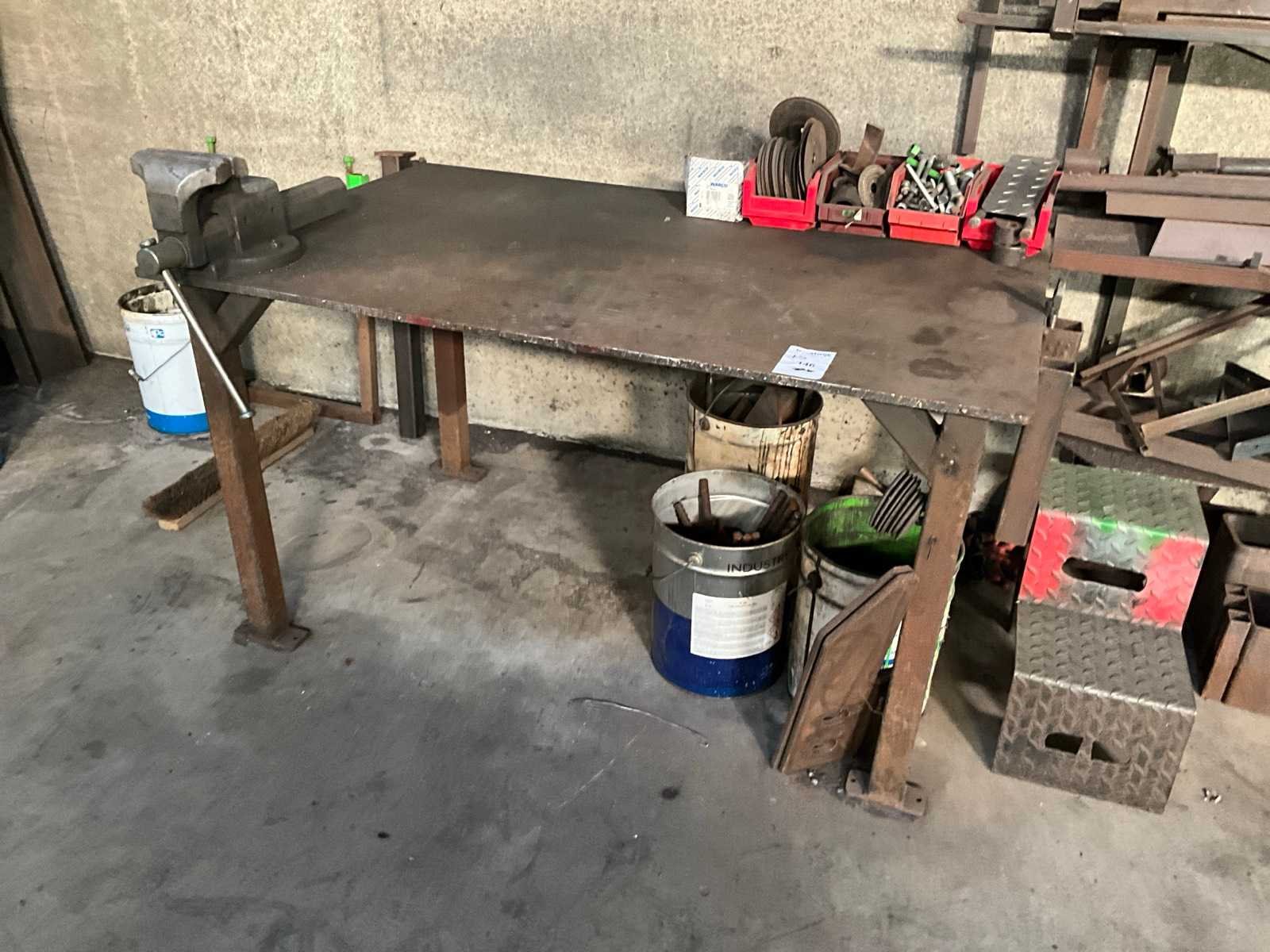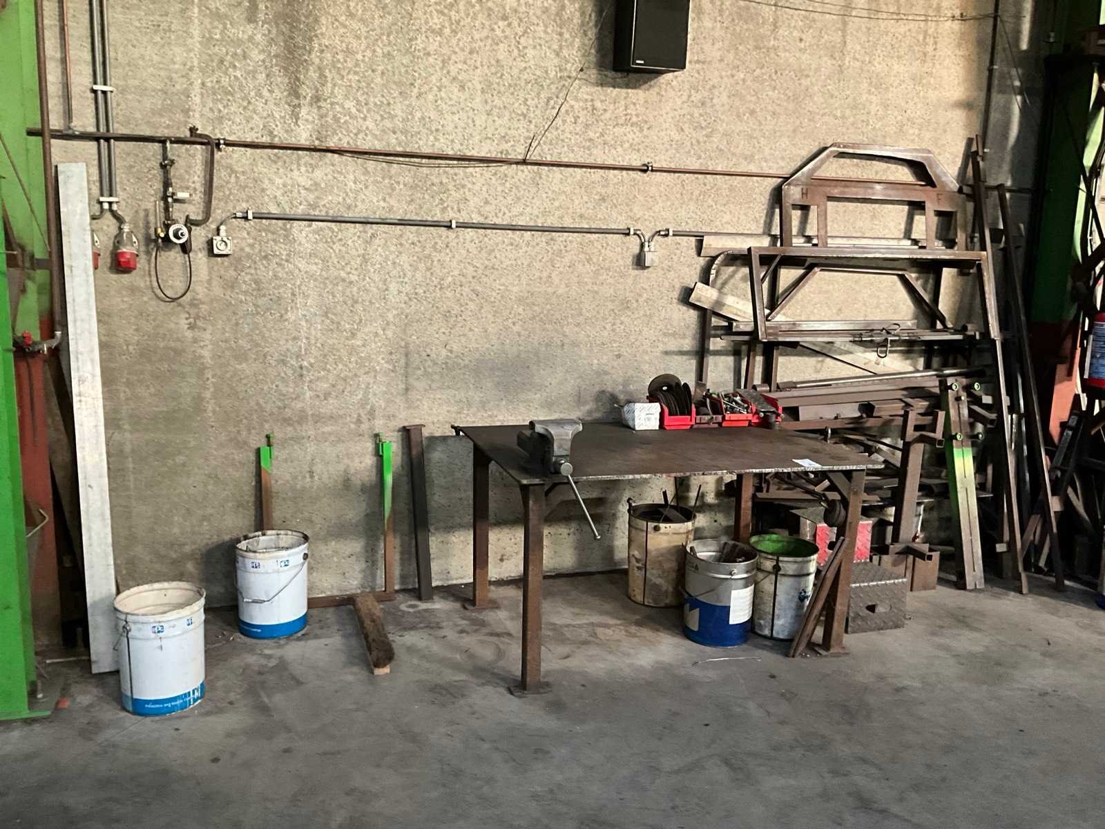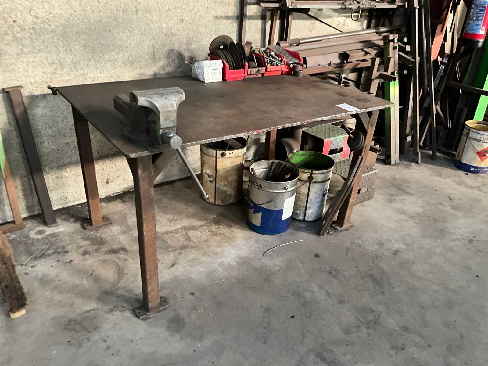 Voorzien van bankschroef, inclusief metalen trapje, metalen halffabrikaten, emmers restmetaal, staande in 1 loodsvak Nee Breedte: 1000mm Lengte: 1500mm Hoogte: 830mm