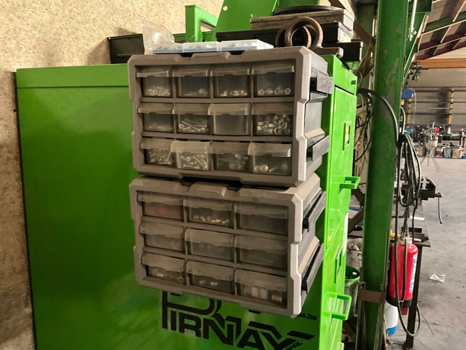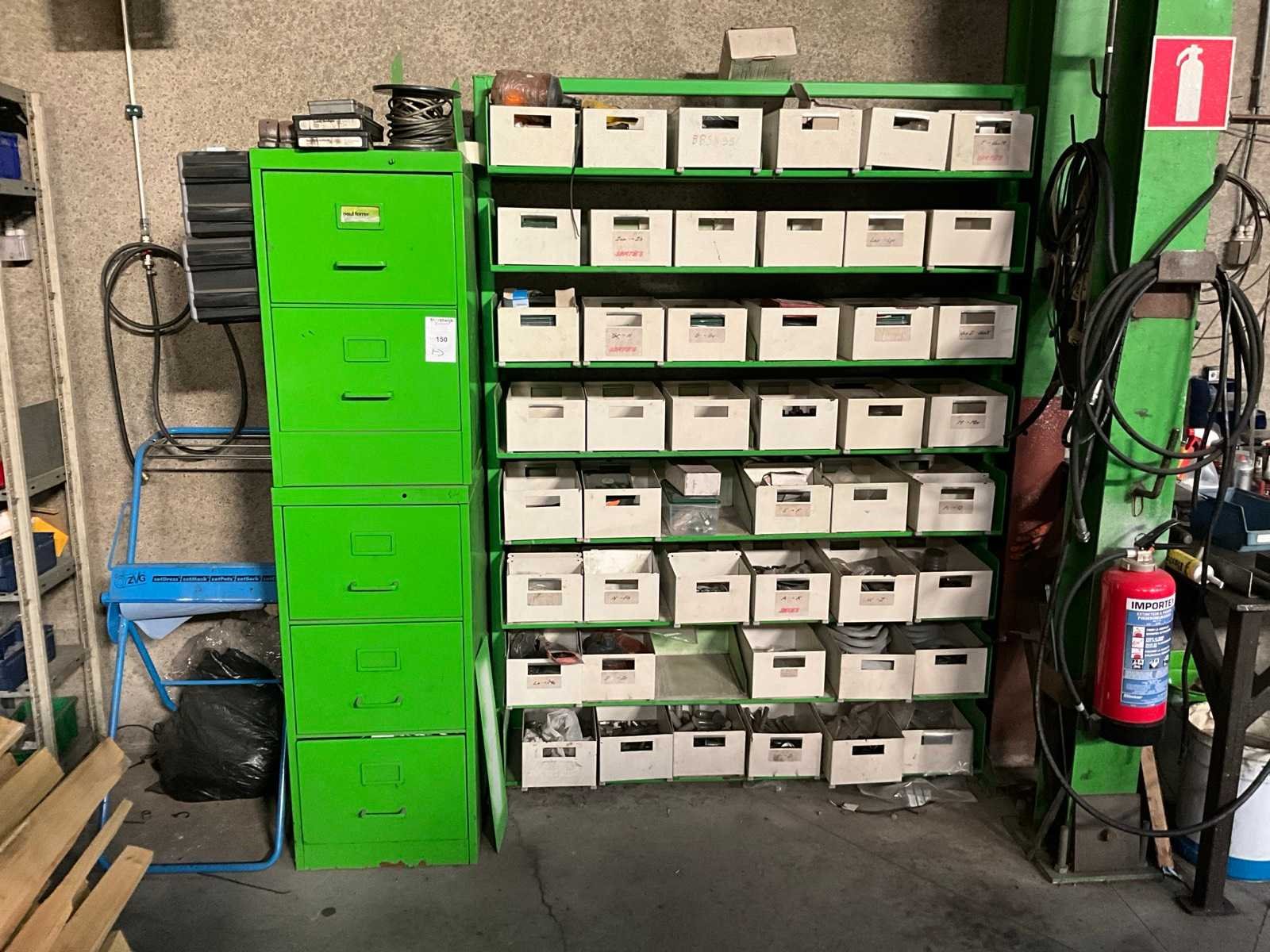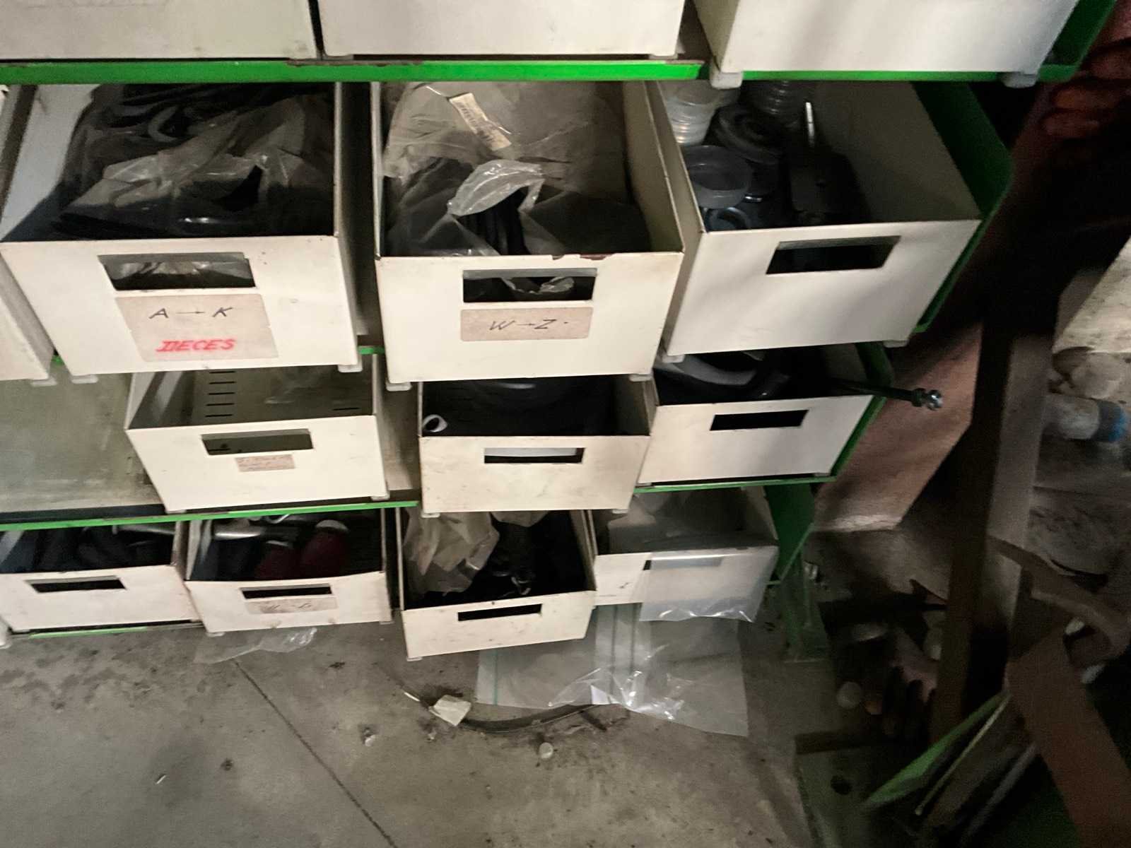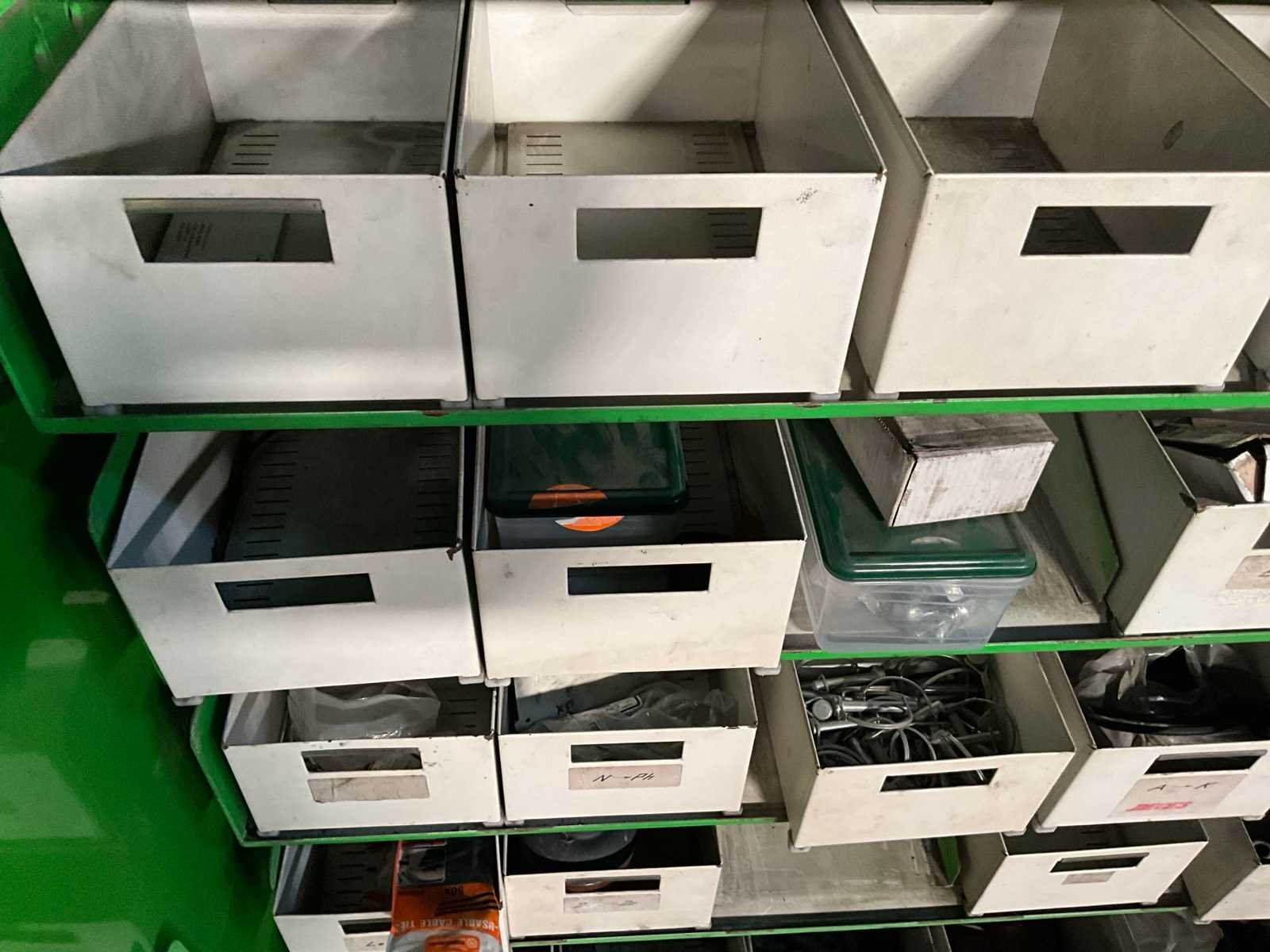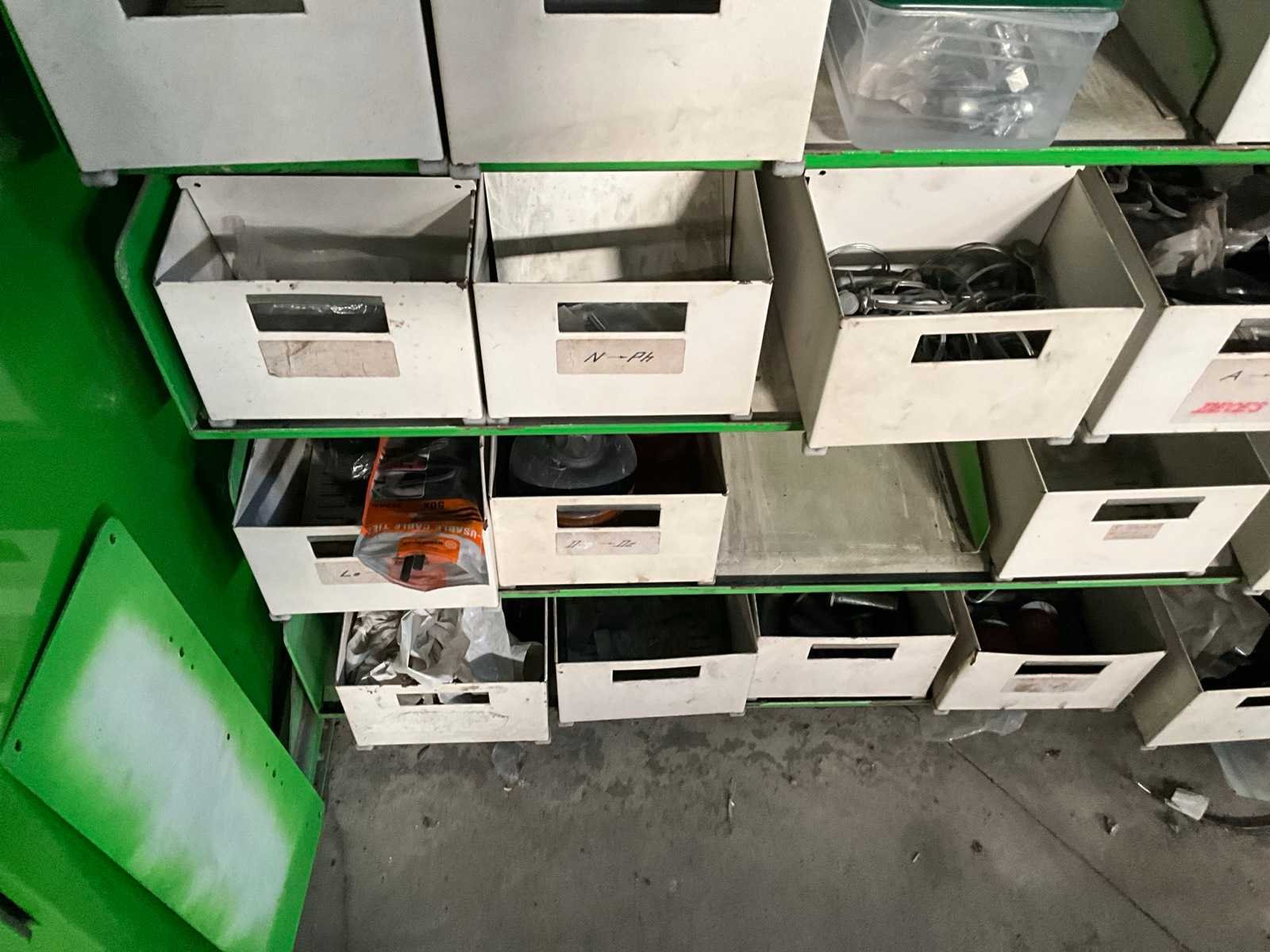 Bestaande uit papierrolhouder, 2 ladekasten, 1x 2 en 1x 3 lades en magazijnstelling met 8 legborden, inclusief inhoud waaronder diverse onderdelen voor aanhangwagen constructie Nee