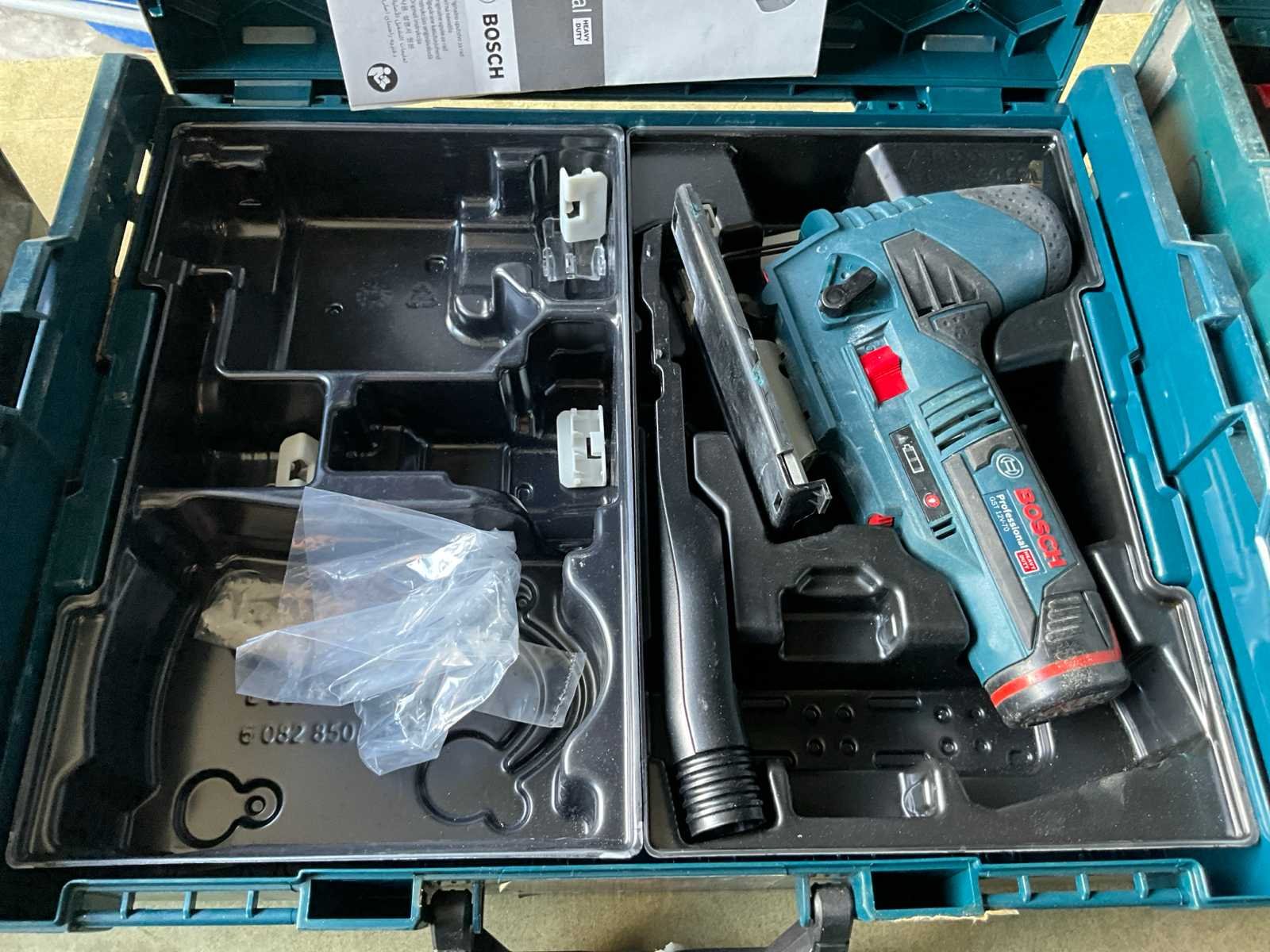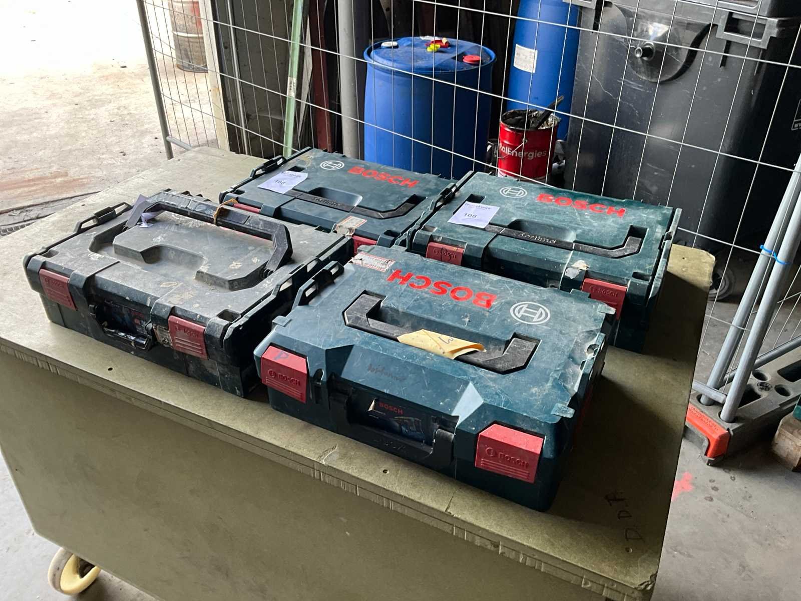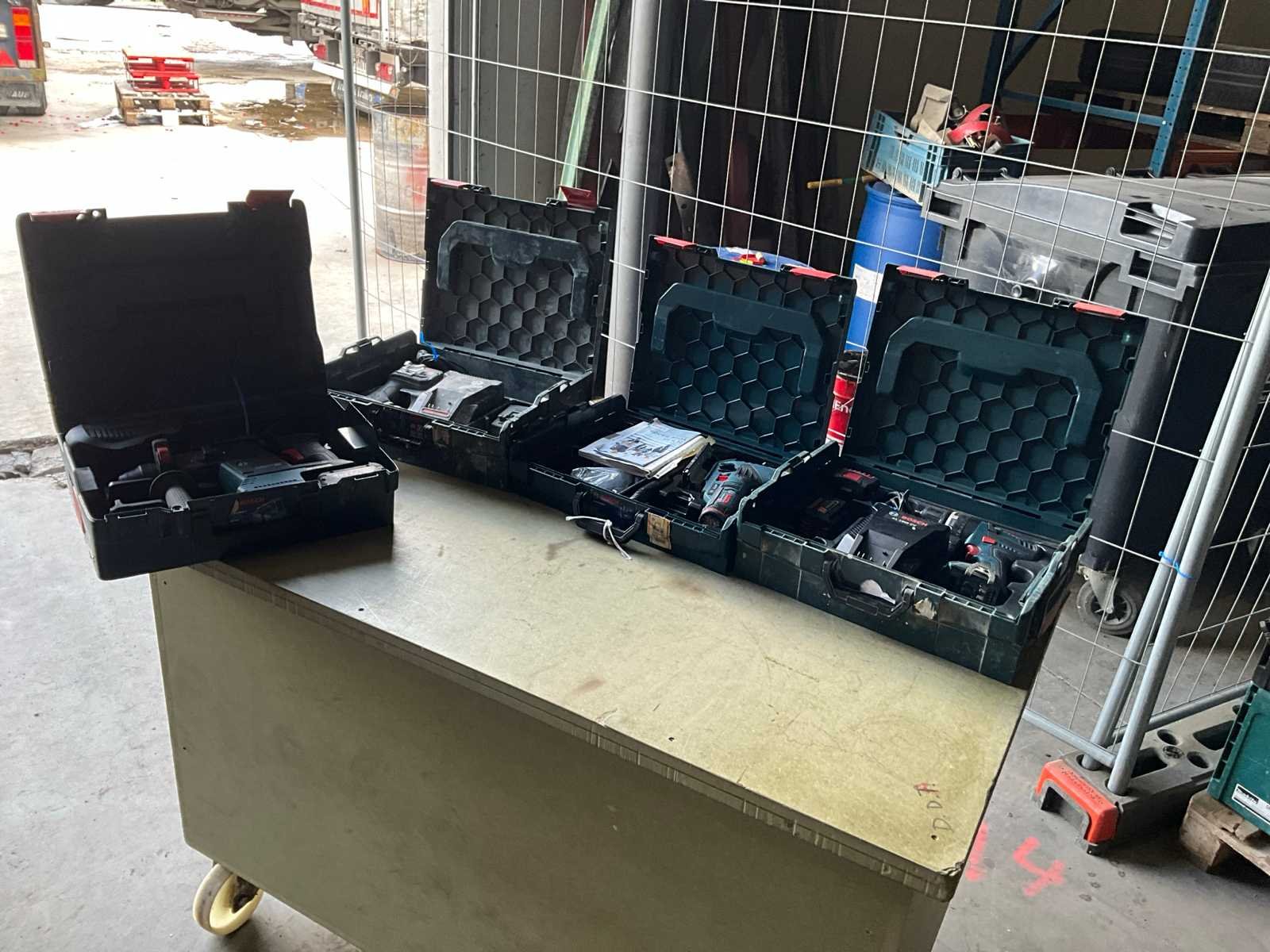 Zijnde 1x klopboormachine GBH 18V-26 s/n 3611J09000 met 1 accu en lader, 1x boormachine zonder typeplaatje met 2 accu’s en lader, 1x schroefmachine GSR 14,4V-LI met 2 accu’s en lader en 1x decoupeerzaag GST12V-70 s/n 704000536 met 1 accu No Merk: Bosch Met koffer: true