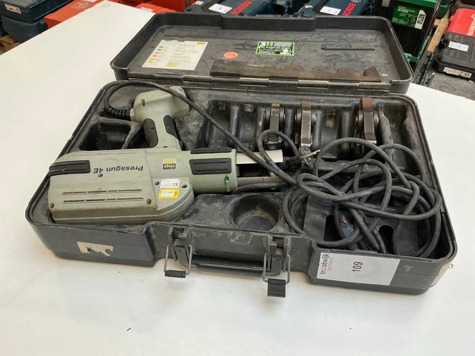 Inclusief 3 persbekken Nee Merk: Viega Type: Pressgun 4E Serienummer: G1012178 Aansluiting: 230V Met koffer: true