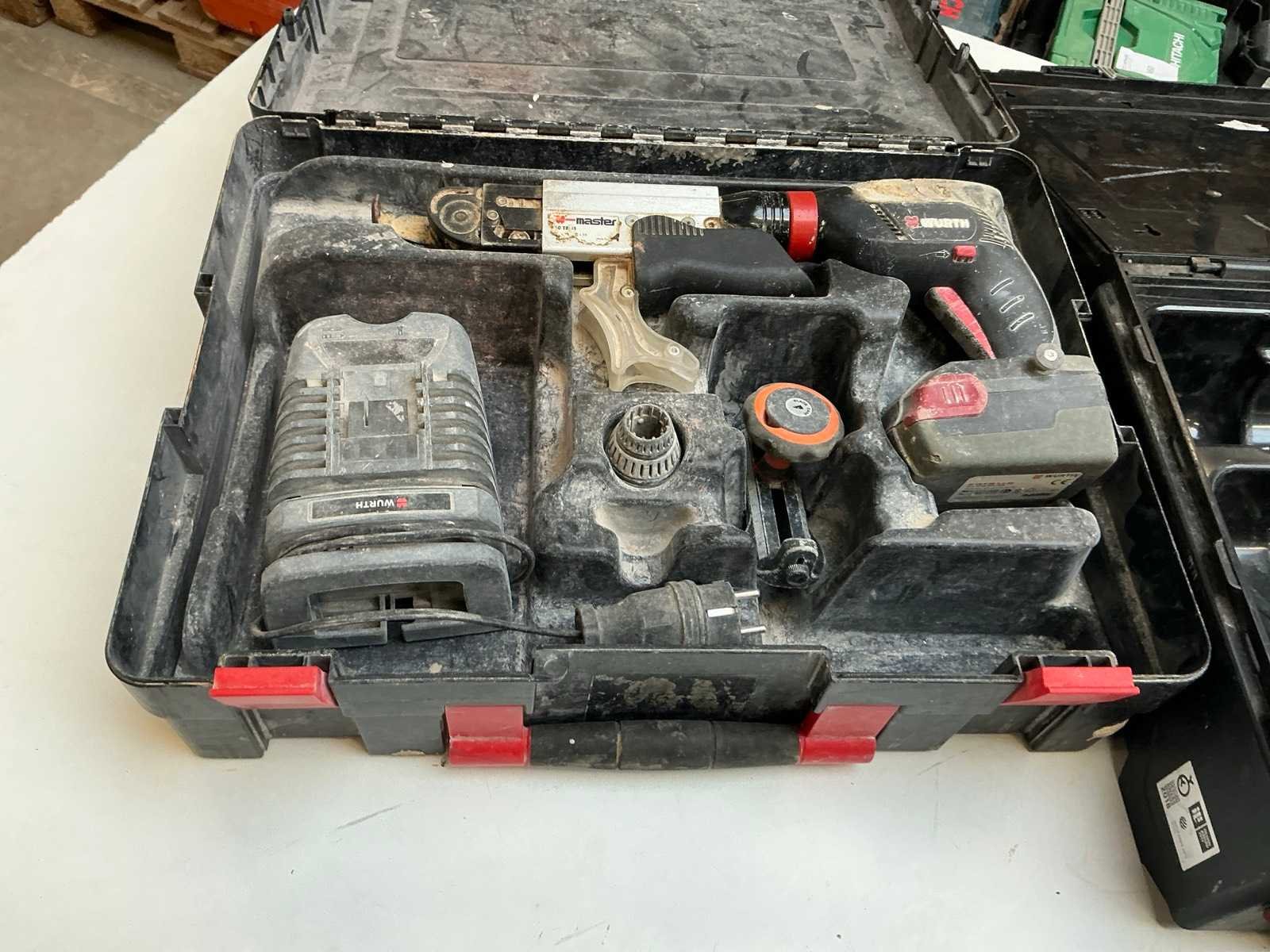Zijnde: - TBS 18-A accu-snelbouwschroefmachine, met 1x 18V-accu en lader, s/n 814715814130420366 - MH 3-XE elektrische boorhamer, s/n 9884492280441000717 - accu-schroefboormachine, zonder verdere gegevens, met 2x 14,4-V accu en lader Nee Merk: Würth Met koffer: true
