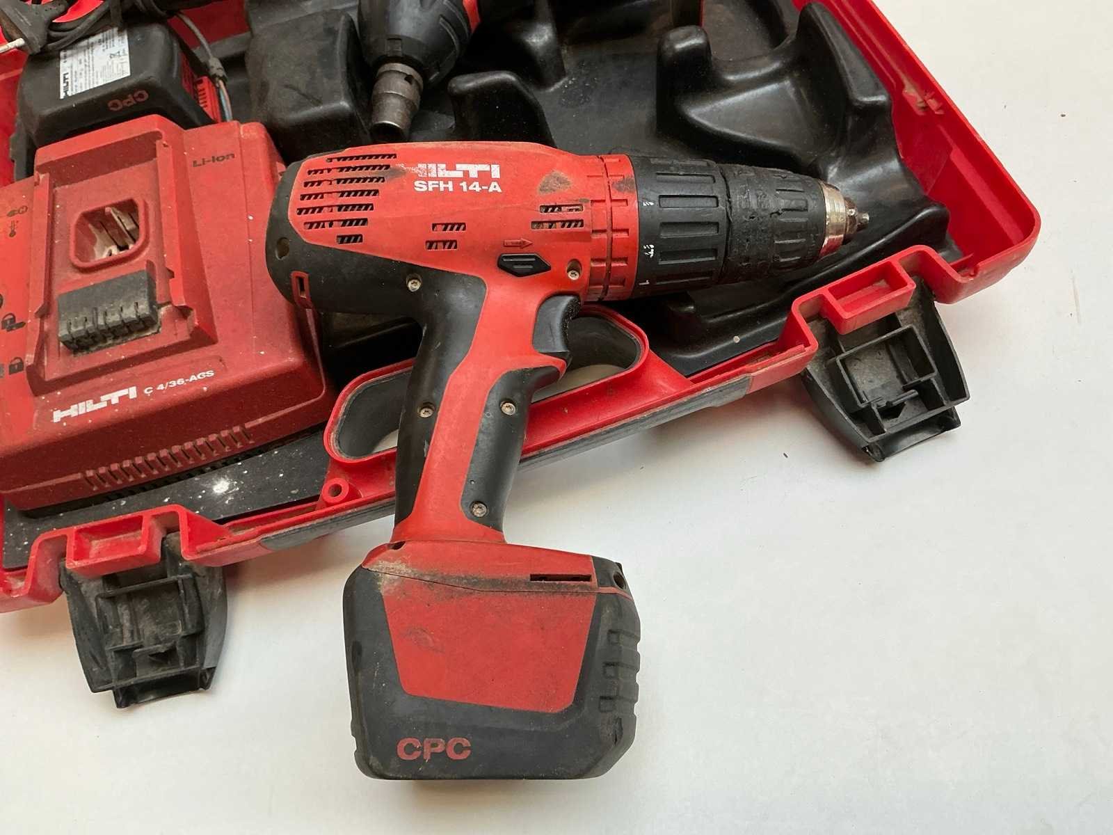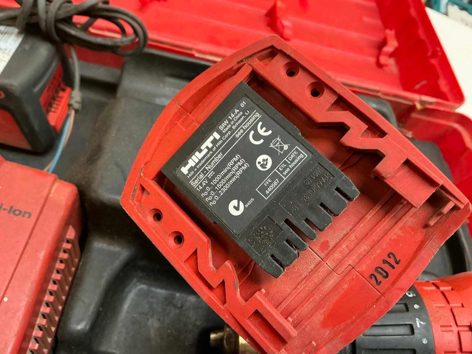 Zijnde: - SFH 14-A schroefboormachine & SIW 14-A slagmoersleutel, in totaal 2x 14,4V-accu en 1 lader, s/n 1000727 & 1020825 - SIW 22-A slagmoersleutel, met 1x 21,6V-accu en lader, s/n 1125911 Alsook: - 2x Hilti DSC kitspuit, ongebruikt Nee Merk: Hilti