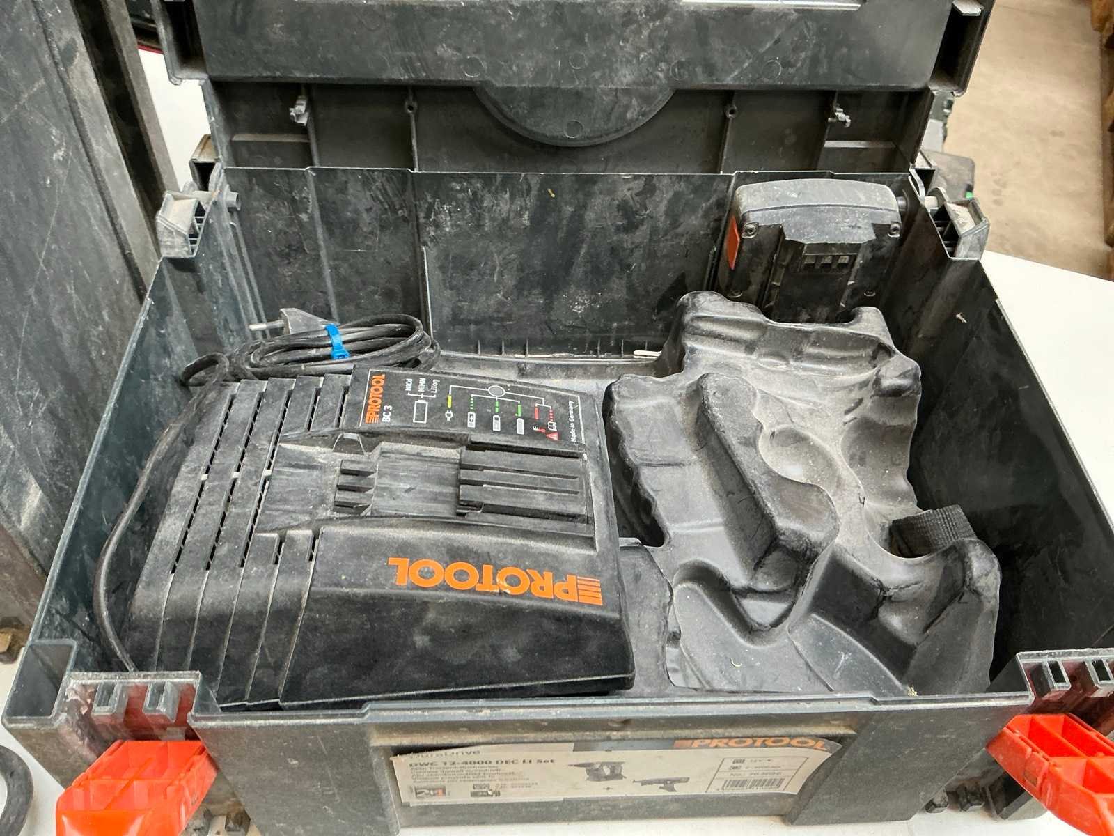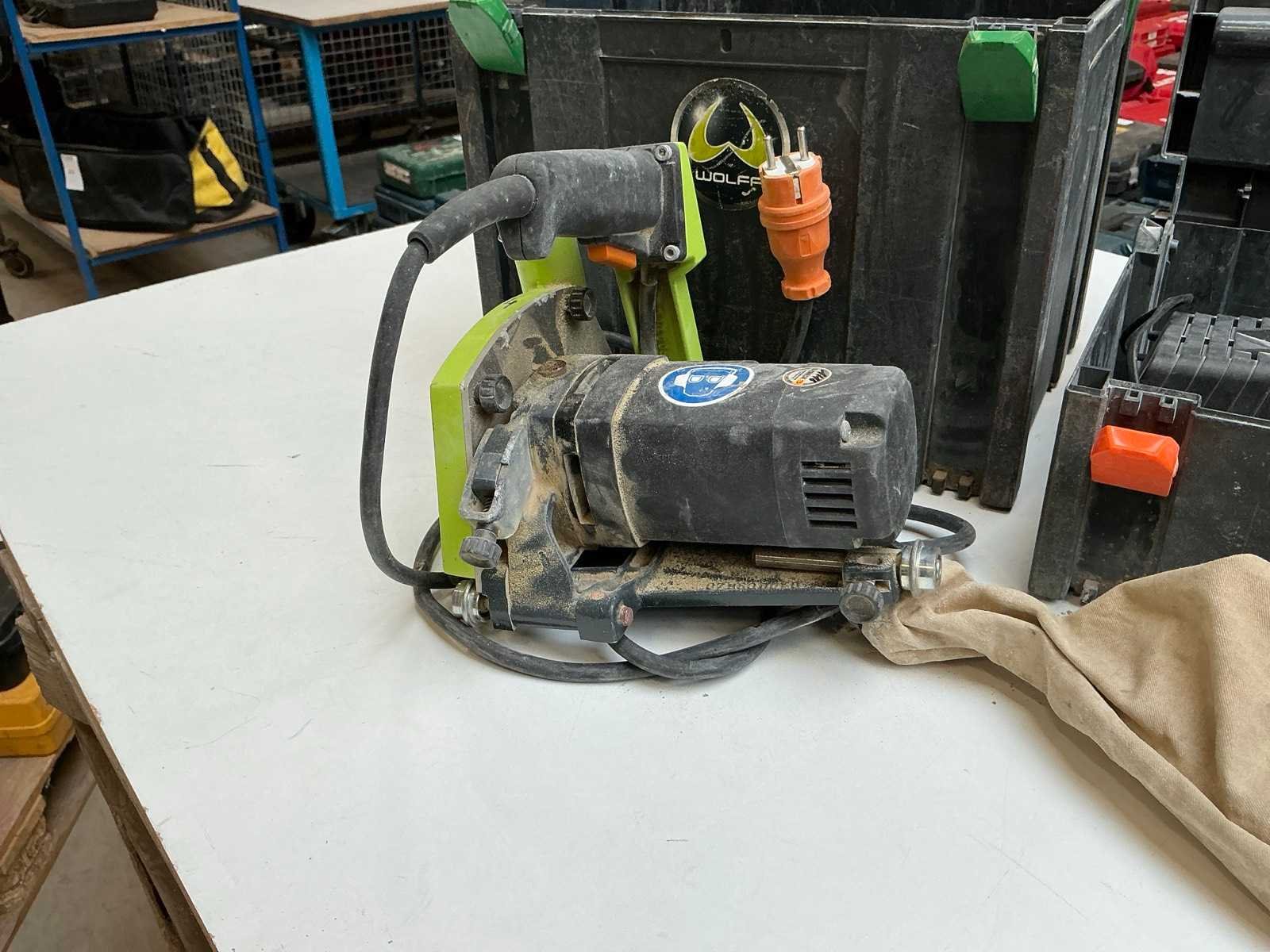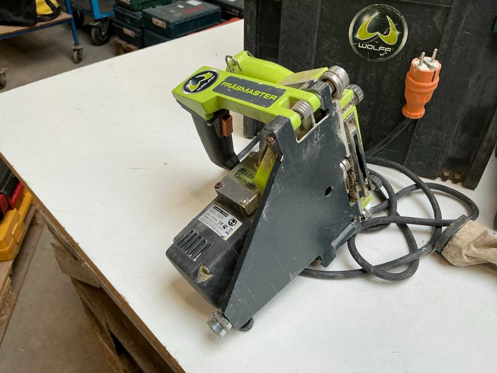 Zijnde: - Protool DWC 12-4000 DEC Li accu schroefautomaat, met 2x 10,8V-accu en lader, s/n 29079124 - Wolff Fräsmaster elektrische voegenfrees, s/n 181908 Nee Met koffer: true