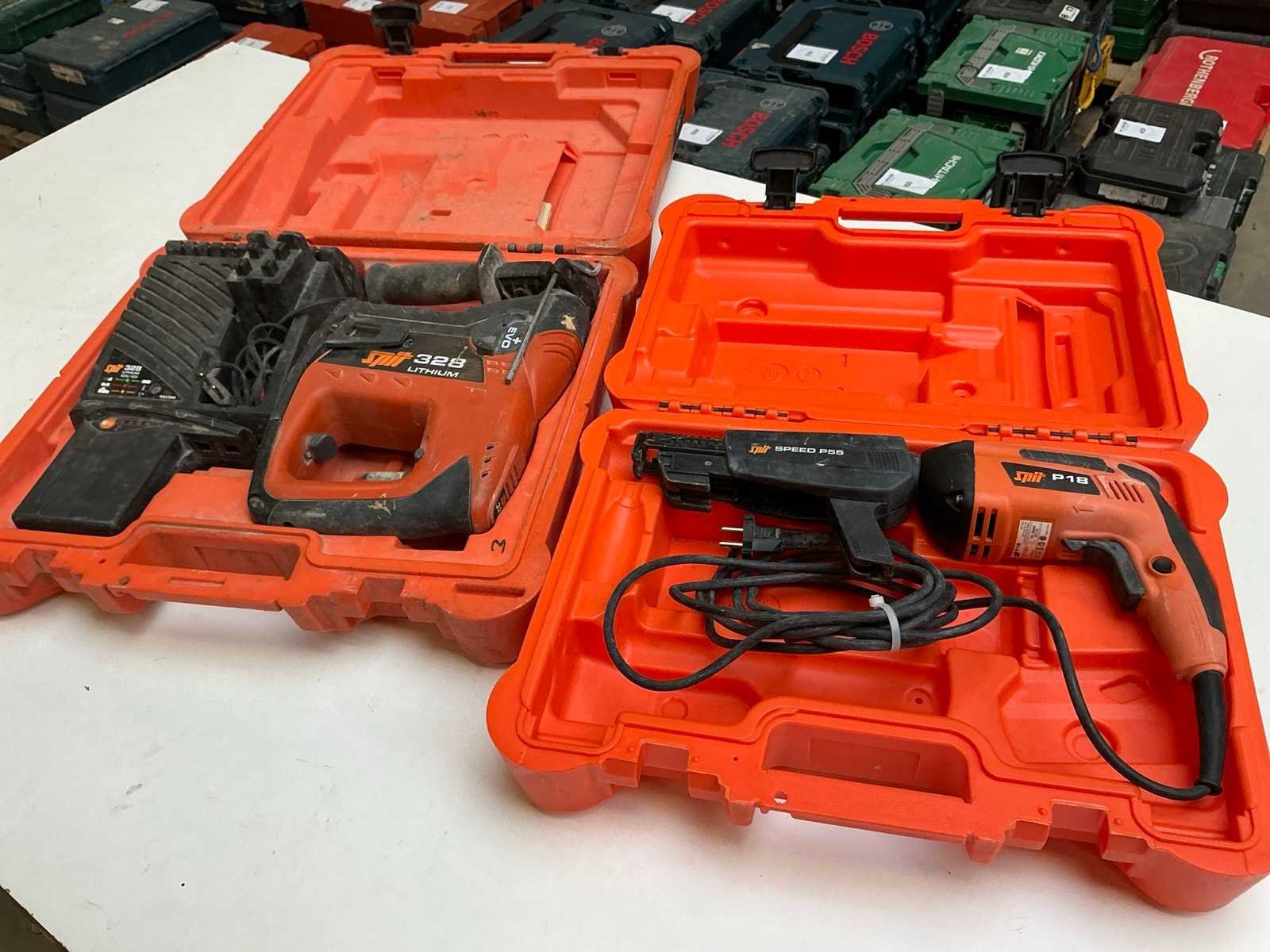 Zijnde: - Spit P18 gipsplaat schroefmachine met Speed P55 stripschroefadapter, s/n 703 000345 - Spit 328 accu boor-/breekhamer, met 2x 28V-accu en lader, in koffer, s/n 304 001314 2013 Nee Merk: Spit