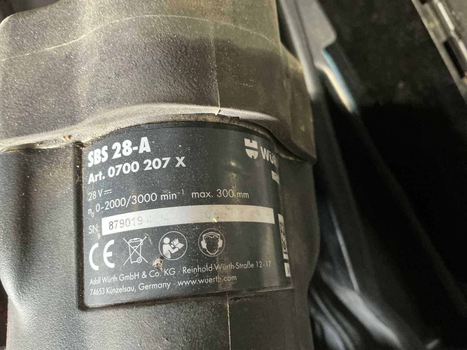 1x BS 12-A Solid accu-schroefboormachine met 2x 12V-accu, 1 lader; 1x SBS 28-A accu-reciprozaag met 2x 28V-accu, 1 lader, s/n 879019; alsook 1 Würth SB 13-XE elektrische klopboormachine, s/n 879019 4 1213 62 4720 No Merk: Würth Met koffer: true
