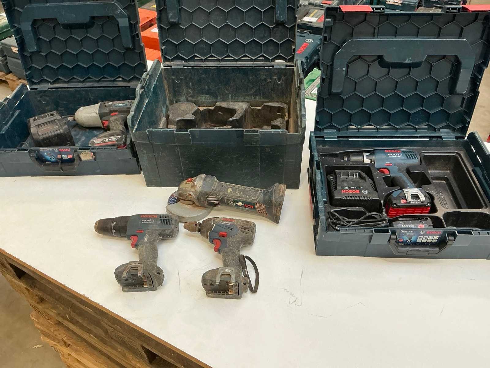 Zijnde: - GDS 18V-LIHT slagmoersleutel, met 1x18V-accu en lader, in koffer - GSR 14,4-2-Li schroefboormachine, met 2x14,4V-accu & lader, s/n 107001896 - GSB 18V-Li schroefboormachine, GDS 18V-Li schroefmachine en GWS 18V-Li haakse slijpmachine; telkens zonder accu/lader; alles in 1 koffer Nee Merk: Bosch
