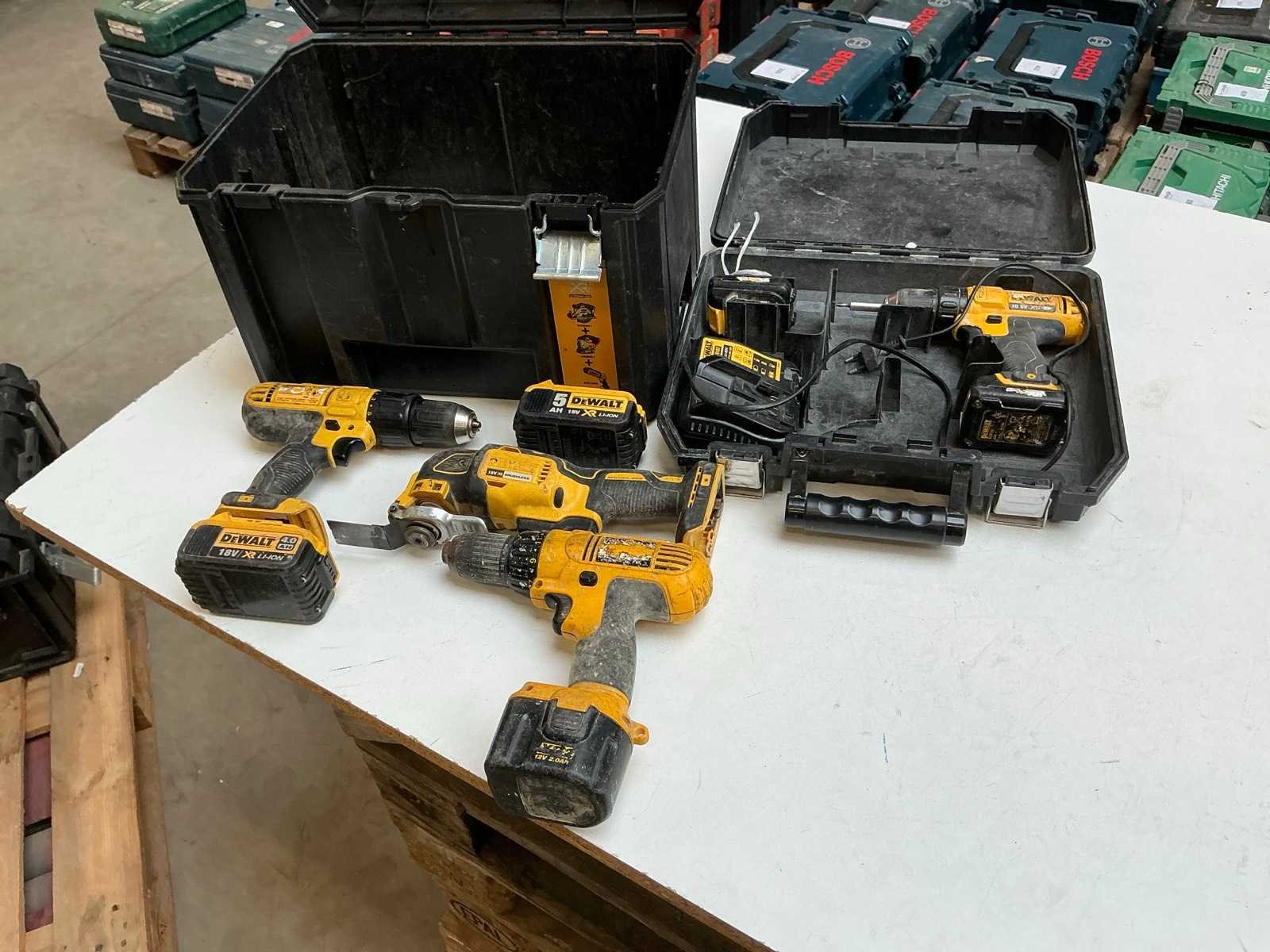 Zijnde: - DCD776 schroefboormachine, met 1x18V-accu, geen lader, s/n 210039 - DCS355 multitool, met 1x18V-accu, geen lader, s/n 071620 - schroefboormachine, met 1x12V-accu, geen lader, s/n 703995 - DCD710 schroefboormachine, met 2x10,8V-accu & lader Nee Merk: DeWalt Met koffer: true
