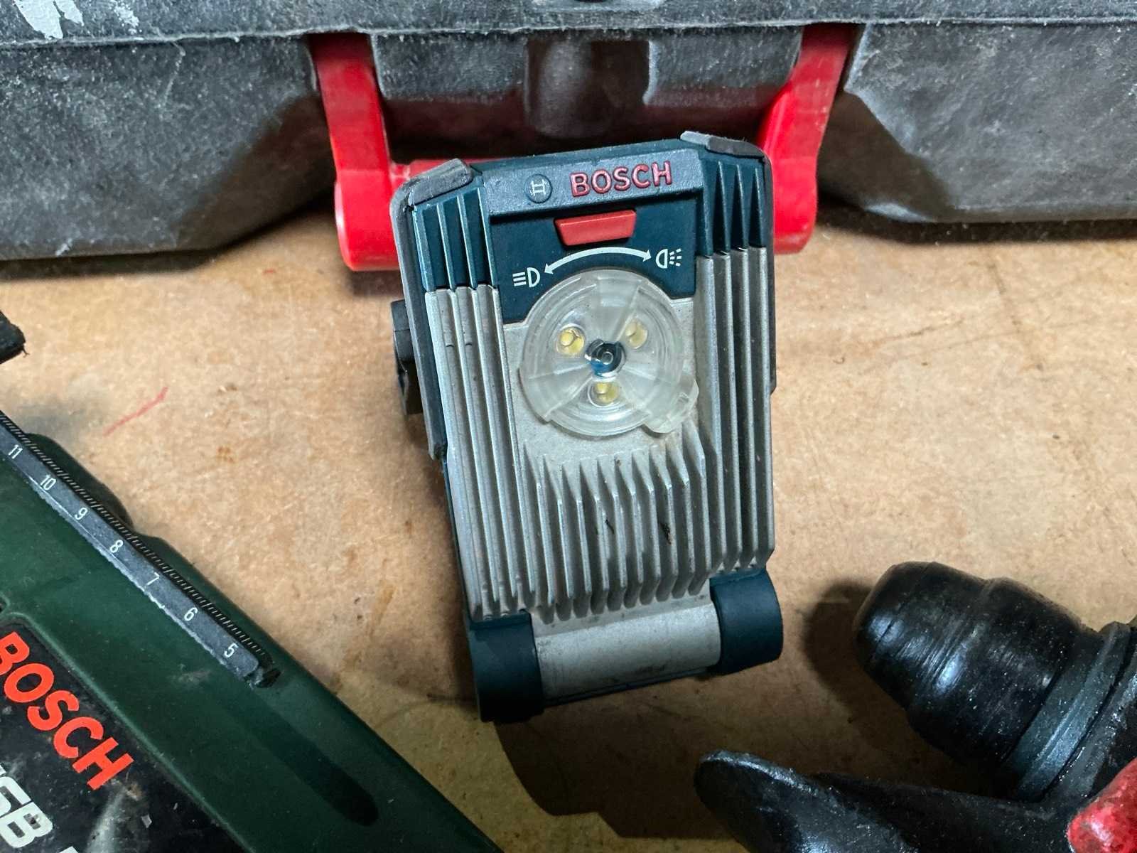 1x CSB 5-13 RE elektrische klopboormachine; 1x GBM 10 RE elektrische boormachine, s/n 411002873; 1x accu-klopboormachine, zonder verdere gegevens, zonder accu/lader; 1x haakse slijpmachine, Ø125mm, zonder verdere gegevens, zonder accu/lader; 1x LED-draaglamp, zonder accu/lader Nee Merk: Bosch