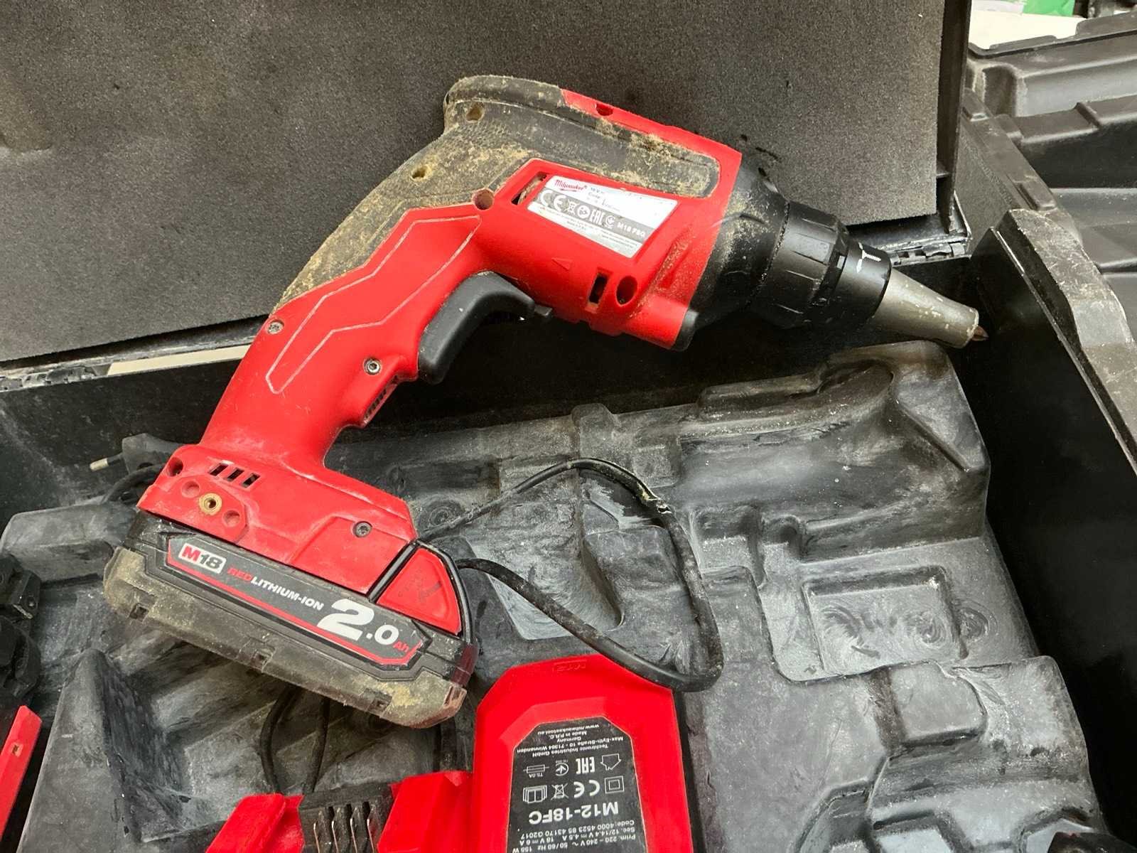 Zijnde: - M18 FSG gipsplaat schroefmachine, inclusief CA55 opzetstuk, met 2x18V-accu & lader - M12 CH klopboormachine, met 2x12V-accu & lader, s/n 004354 Nee Merk: Milwaukee Met koffer: true