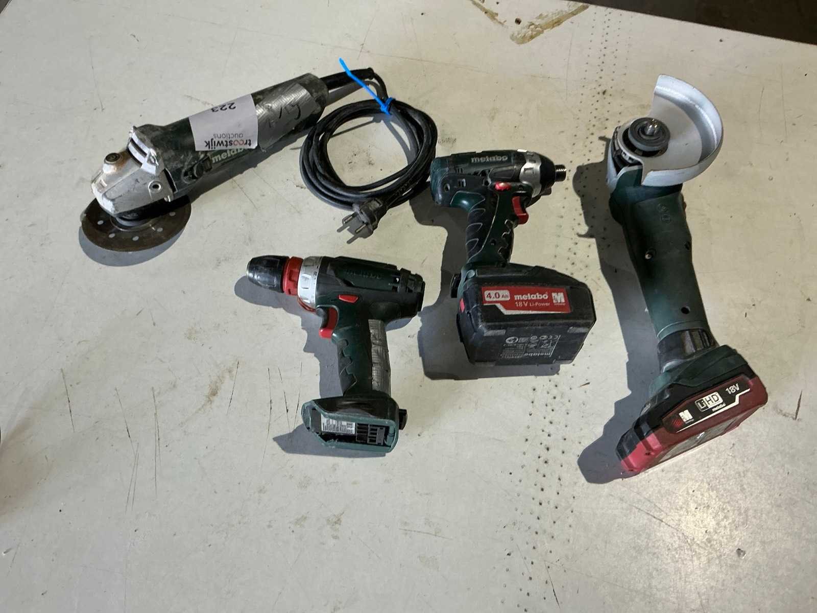 Zijnde 3x accu-gereedschappen: 1x WB 18 LTX BL 125 Quick haakse slijpmachine, met 1x 18V-accu, s/n 7041223354 & 1x SSD 18 LTX 200 schroefmachine, zonder accu, s/n 6126022835 & 1x BS 18 Quick schroefboormachine, zonder accu, s/n 7011227436; en W 820-125 elektrische haakse slijpmachine, s/n 408127819 Nee Merk: Metabo
