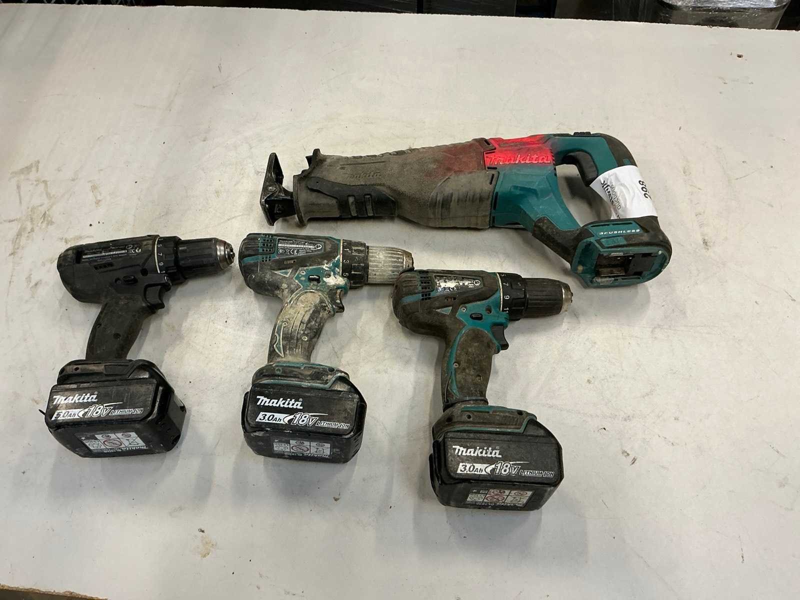 <Br> - Reciprozaag type DJR187, zonder accu en zonder acculader, S/N 0172153Y. - Schroefboormachine type BDF456, met 1 accu, zonder acculader, S/N xxx180Y. - Schroefboormachine type DDF456, met 1 accu, zonder acculader, S/N 244676Y. - Schroefboormachine type DDF481, met 1 accu, zonder acculader, S/N x01845Y. Nee Merk: Makita