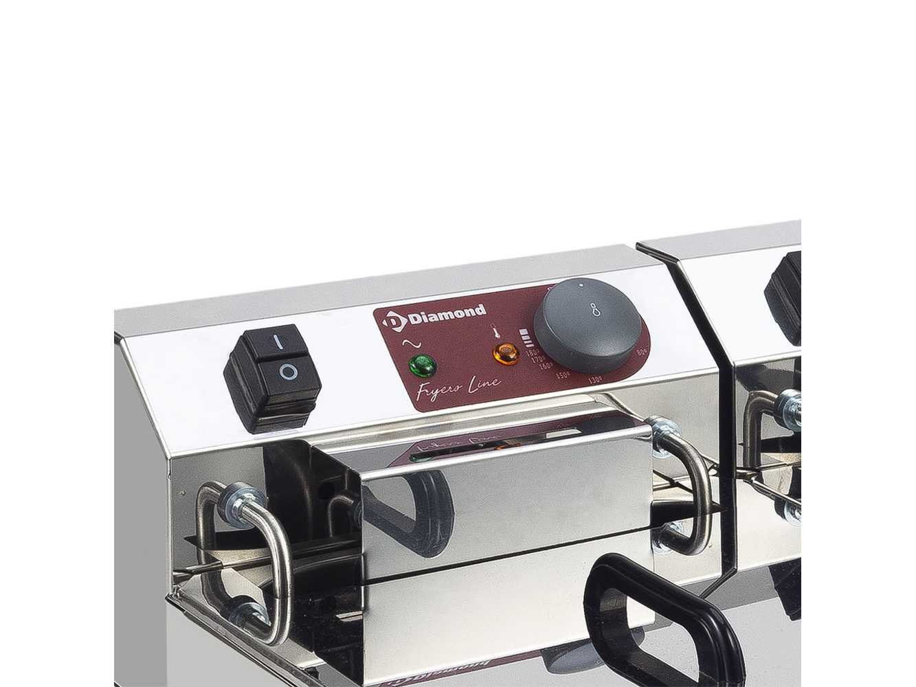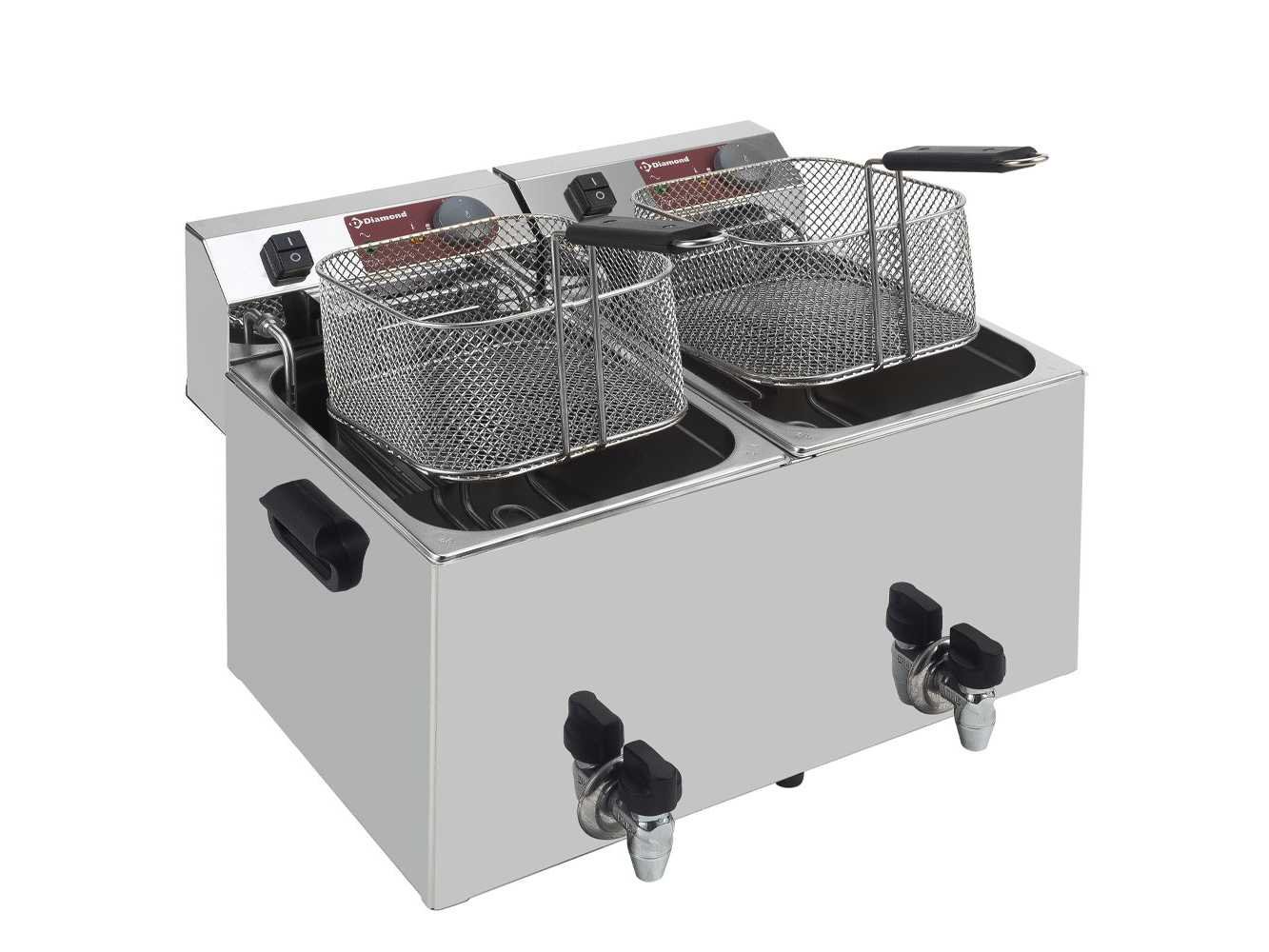 Elektrische tafelfrituurpan 2x 10 liter afvoerkraan - Tank met bruikbare inhoud (+/- 8,5 liter). - Mandafmetingen 220x190xh110 mm. - Roestvrijstalen constructie met 2 hittebestendige zijhandgrepen - AISI 304 roestvrijstalen tank, met deksel - Voorste afvoerklep, uitgerust met een veiligheidsvoorziening. - Roestvrijstalen mand (zeer robuust "versterkt"), met athermisch handvat. - Verhitting met "behandelde" afgeschermde weerstanden, ondergedompeld in tanks. - Koude zone: geen verbranding van voedselrest, geen smaakoverdracht. - Aan-uit-schakelaar en thermostaat van 0 tot 180°C, evenals een veiligheidsthermostaat en lampdraden met bescherming. - Eenvoudig onderhoud: verwijderbare besturingskast (uitgerust met een microschakelaar). Non Merk: Diamond Model: Friteuse de table électrique 2x 10 litres robinet de vidange DIAMOND Lengte: 56cm Breedte: 45cm Hoogte: 32cm Vermogen (kW): 9 Elektrisch: true