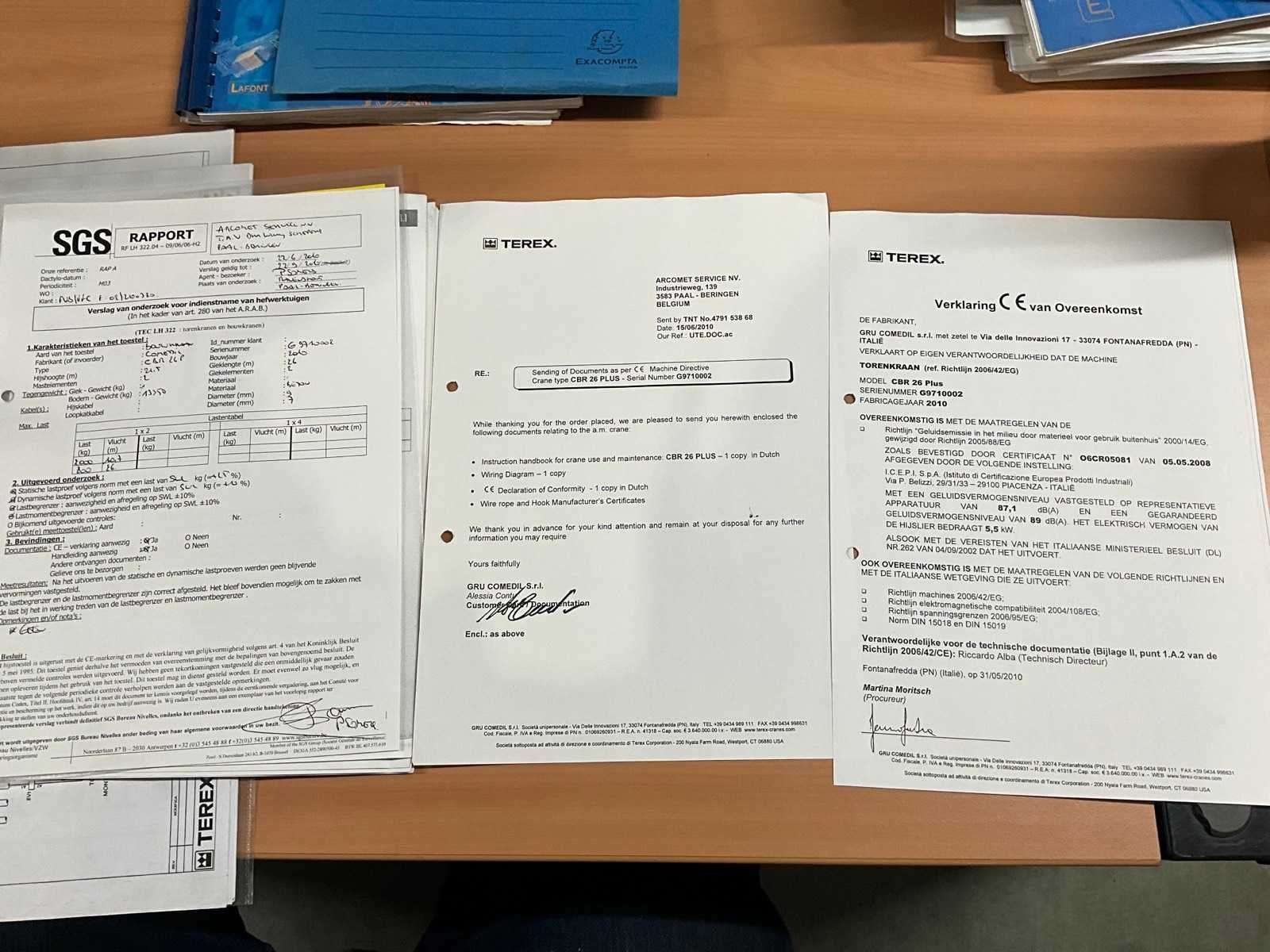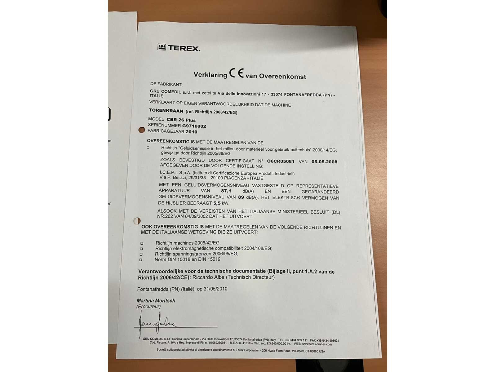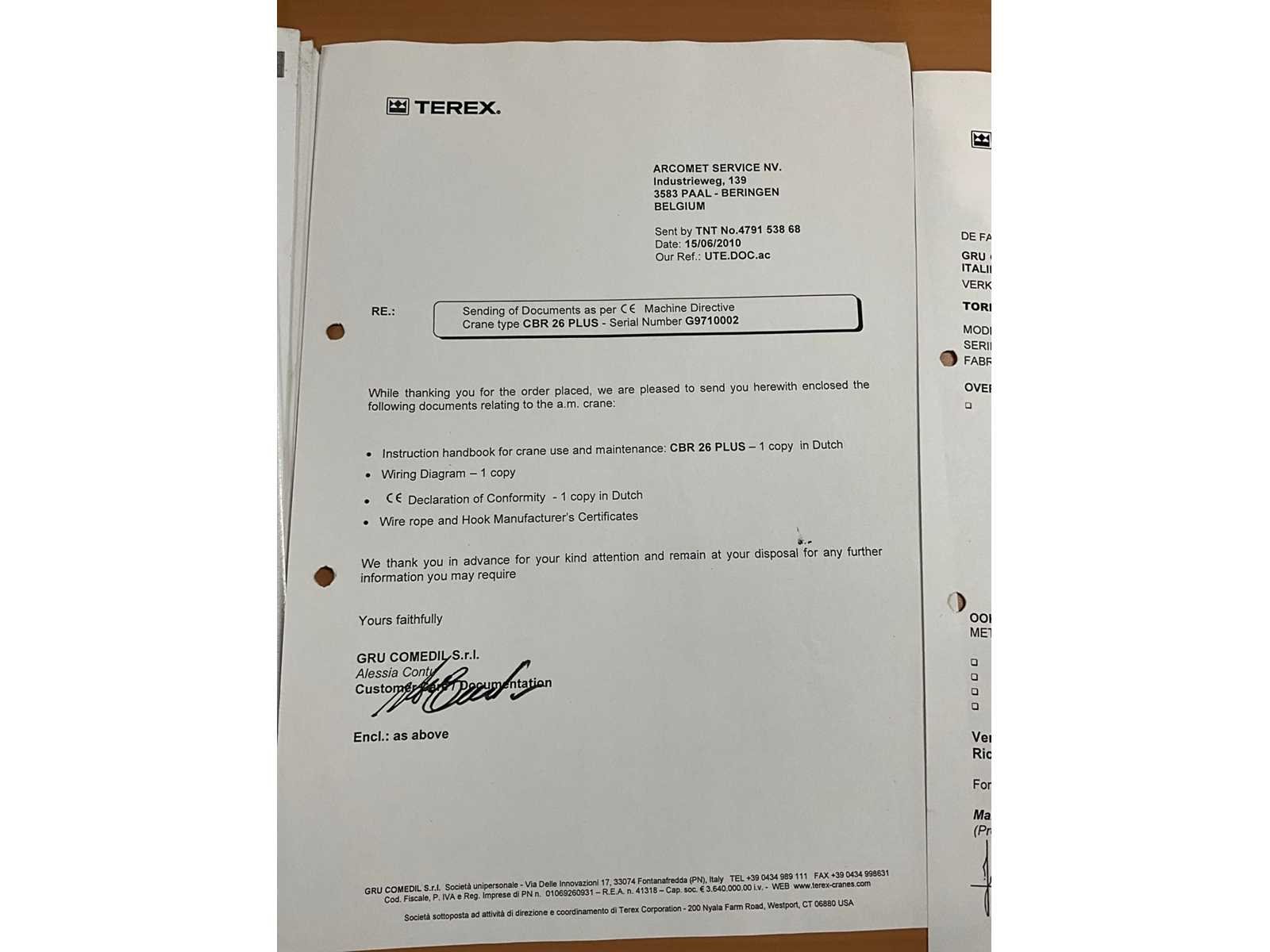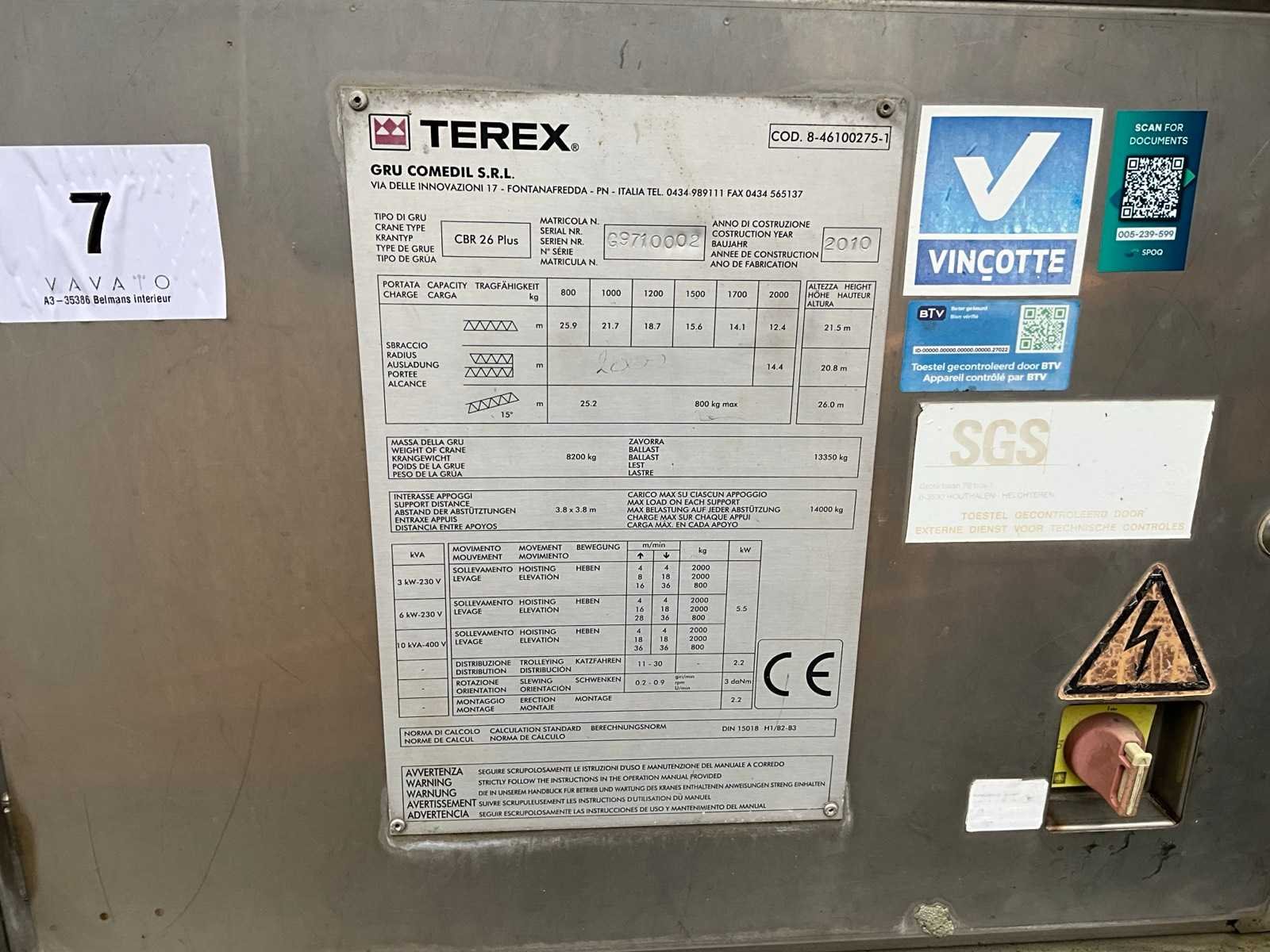 • afmetingen grondopstelling: 3800x3800mm • ballast: 13350kg, zijnde moederblok en 10x 940kg • vermogen: 5,5 • transportwielen: aanwezig • gebruikssporen, lekke band Nee Merk: Terex Type: CBR26 Plus Bouwjaar: 2010 Serienummer: G9710002 Max. hijscapaciteit: 2000kg Gieklengte: 26m Max. haakhoogte: 21.5m Met radiografische afstandsbediening: true Eigen gewicht: 8200kg