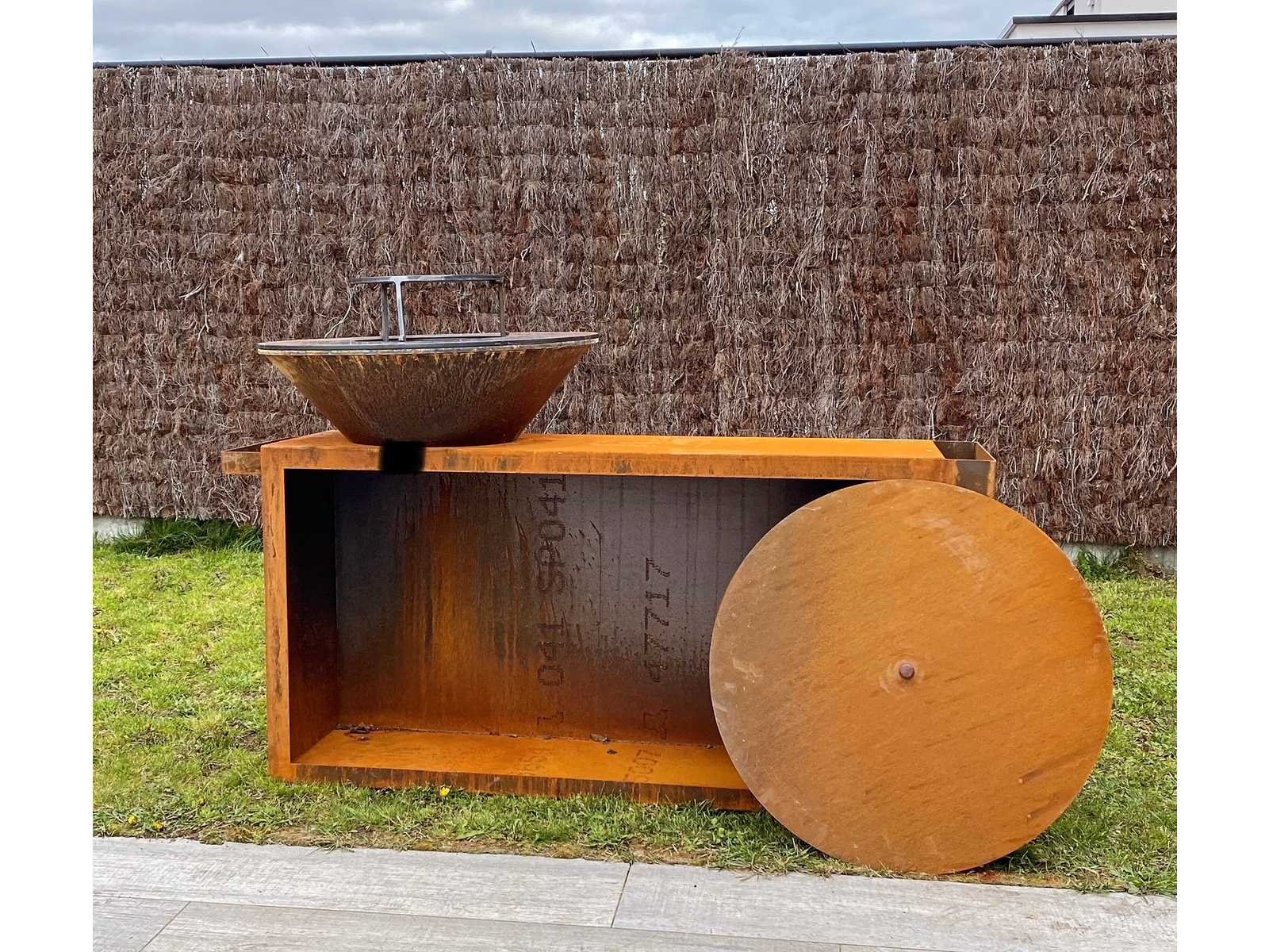 Deze prachtige, handgemaakte plancha BBQ is vervaardigd uit 3mm cortenstaal, de bakring uit 10mm gebeitst staal (diameter +/-80cm). Inclusief foodbumper, rooster, wokpanhouder, deksel, houder voor vleestang of theedoek en plaats voor de opslag van uw houtvoorraad. Er zijn eveneens gaten gemaakt om dit meubel van wielen te voorzien. Nee Model: Welden Cortenstaal Lengte: 140 Breedte: 45 Hoogte: 110 Materiaal: Cortenstaal
