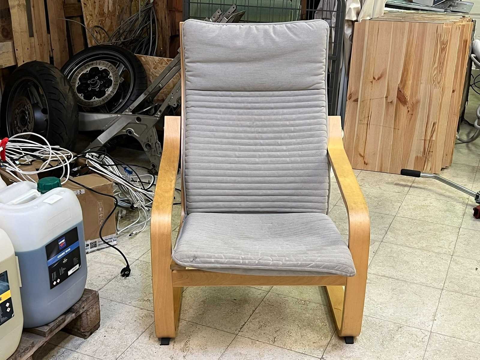 Comfortabele fauteuil met gebogen houten frame en vaste zit- en rugkussens. Uitgevoerd in lichtgrijze stof met horizontale stiknaden. Stabiele constructie, armleuningen in houtafwerking. Geschikt voor woonkamer, leeshoek, wachtzaal of kantoor. Lichte verkleuring en slijtage zichtbaar op de stof (vlek). Kleine gebruikssporen op het hout (zie foto’s). Nee Merk: IKEA Product type: Fauteuil / loungezetel