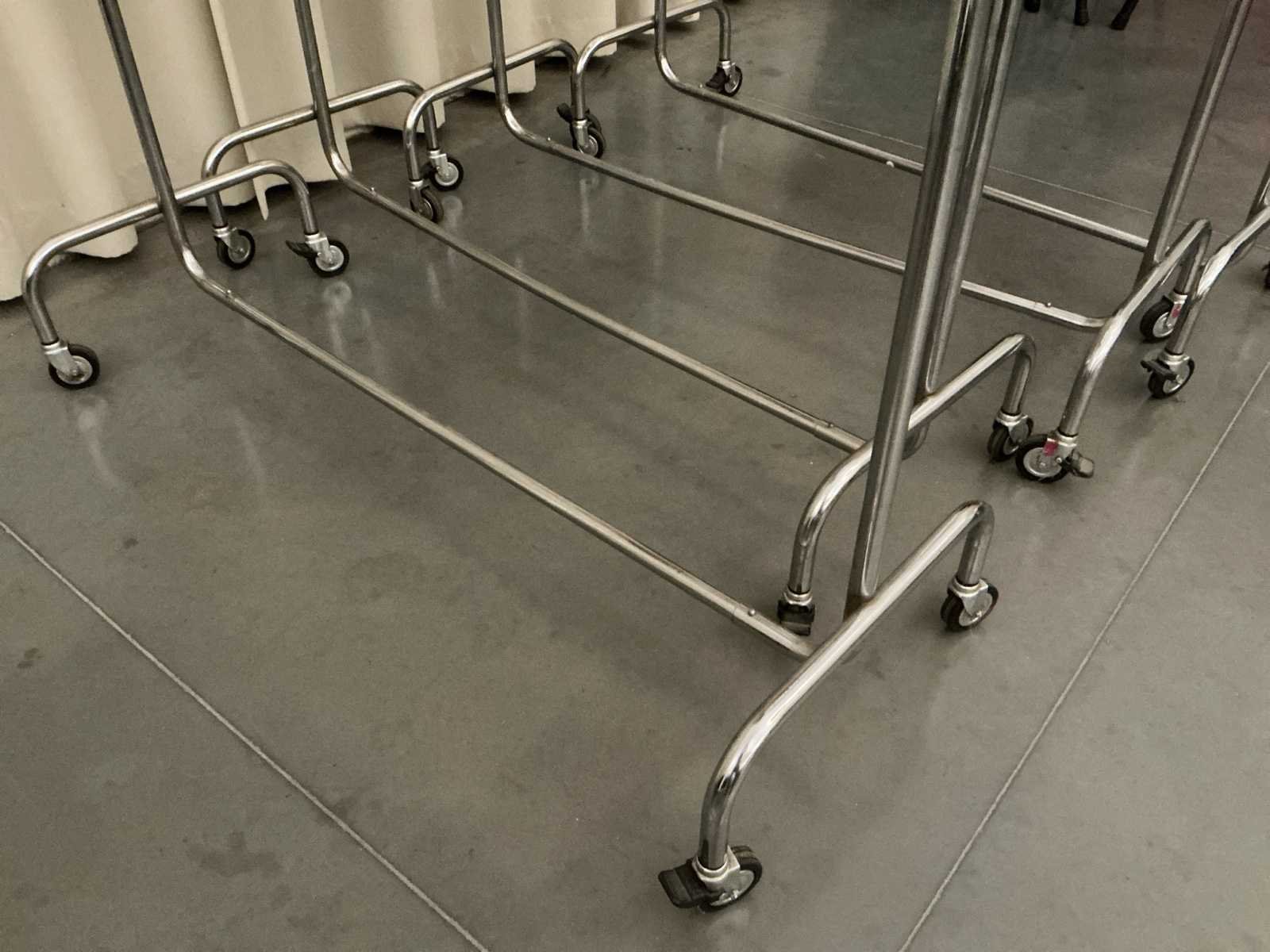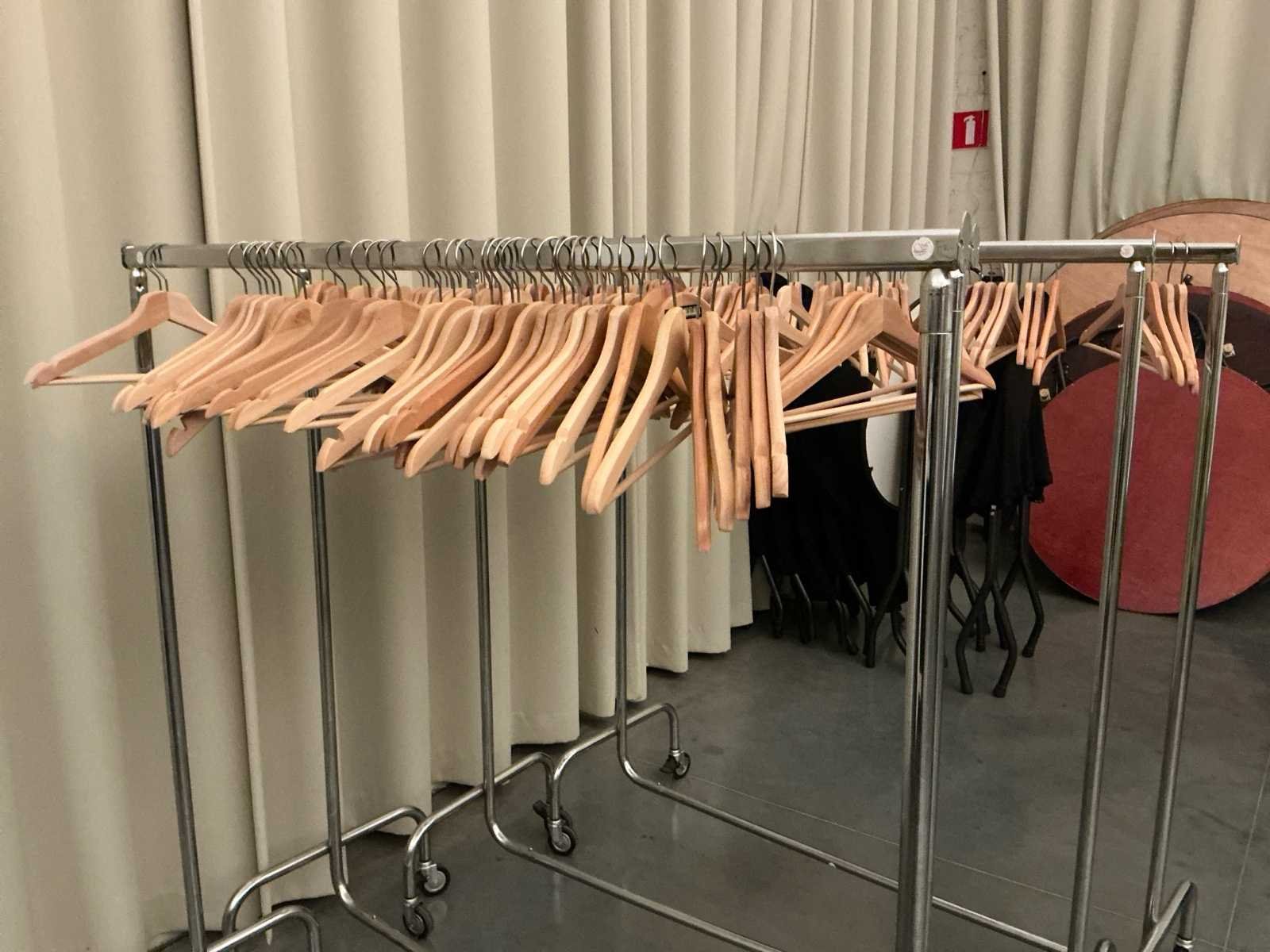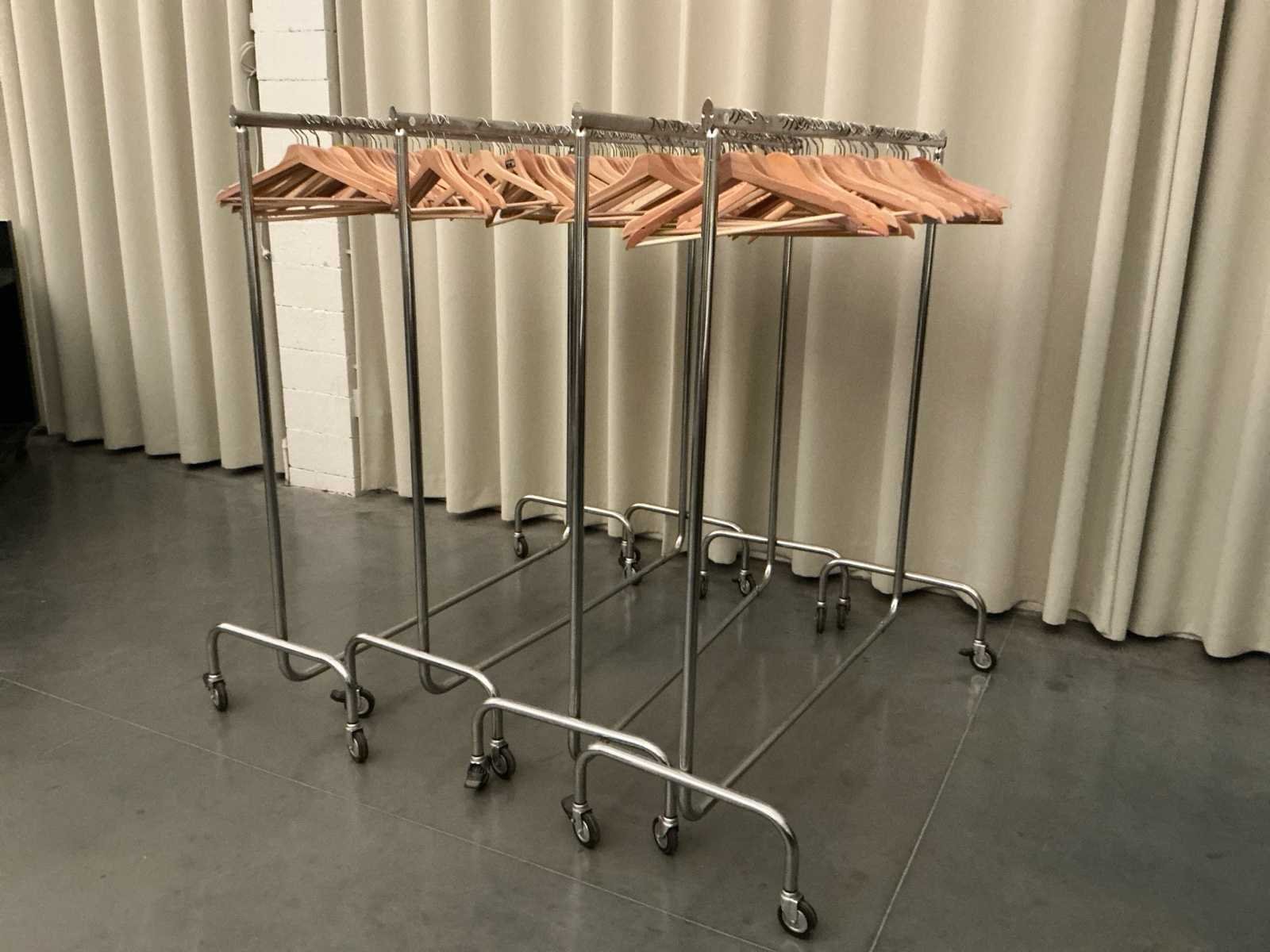 Lot van 4 garderobe rails op wielen met houten kapstokken No
