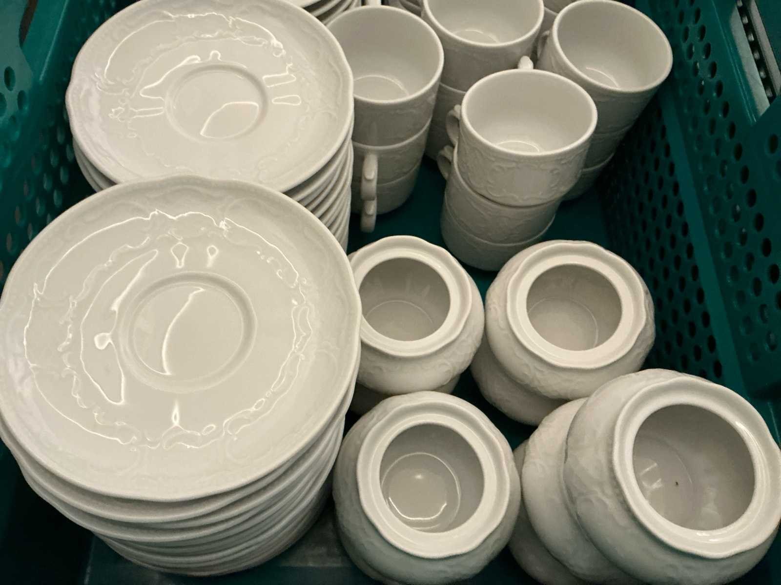 Volledig servies bestaande uit bordjes, tassen en kannen. Inclusief bakken. No