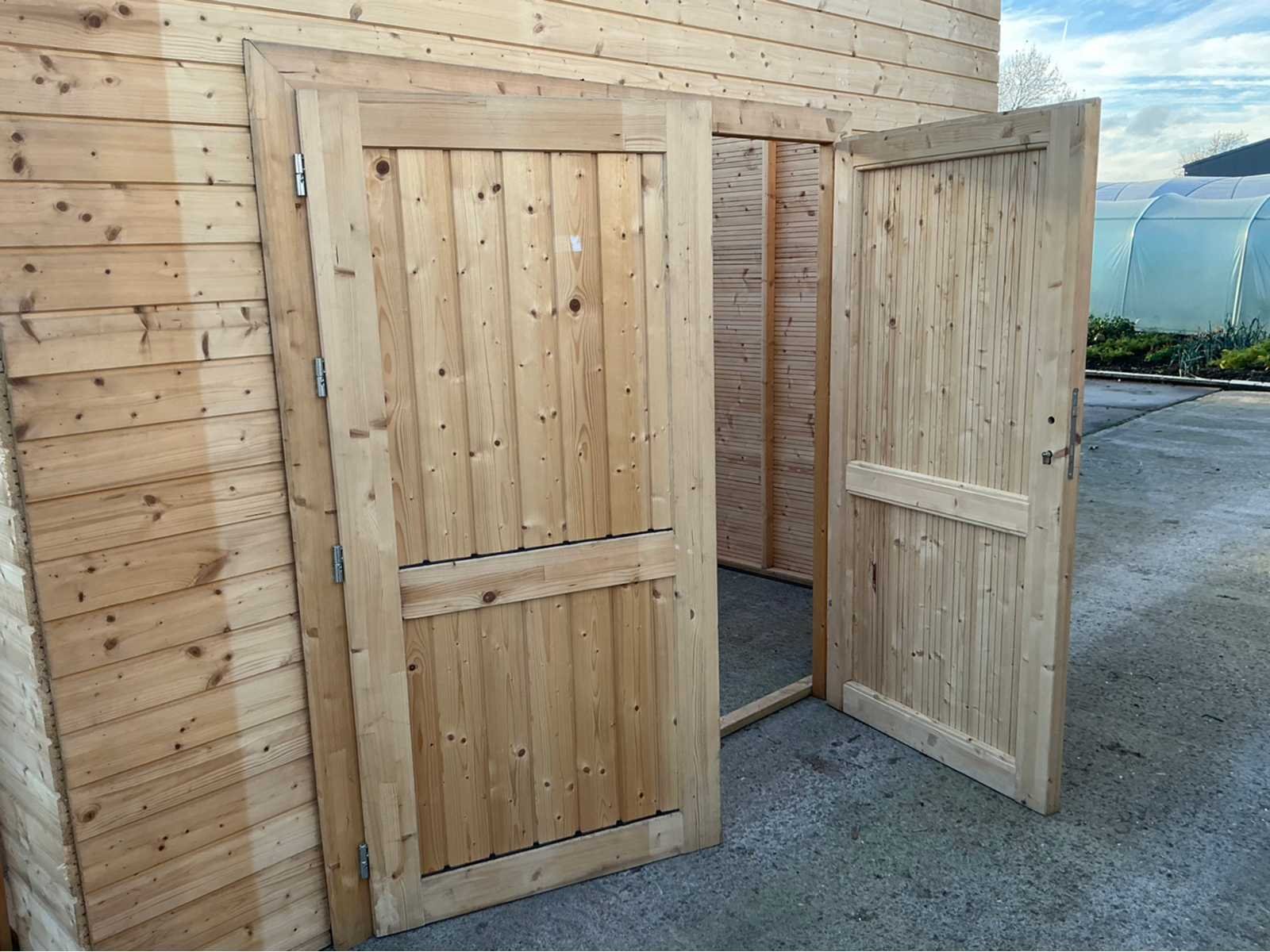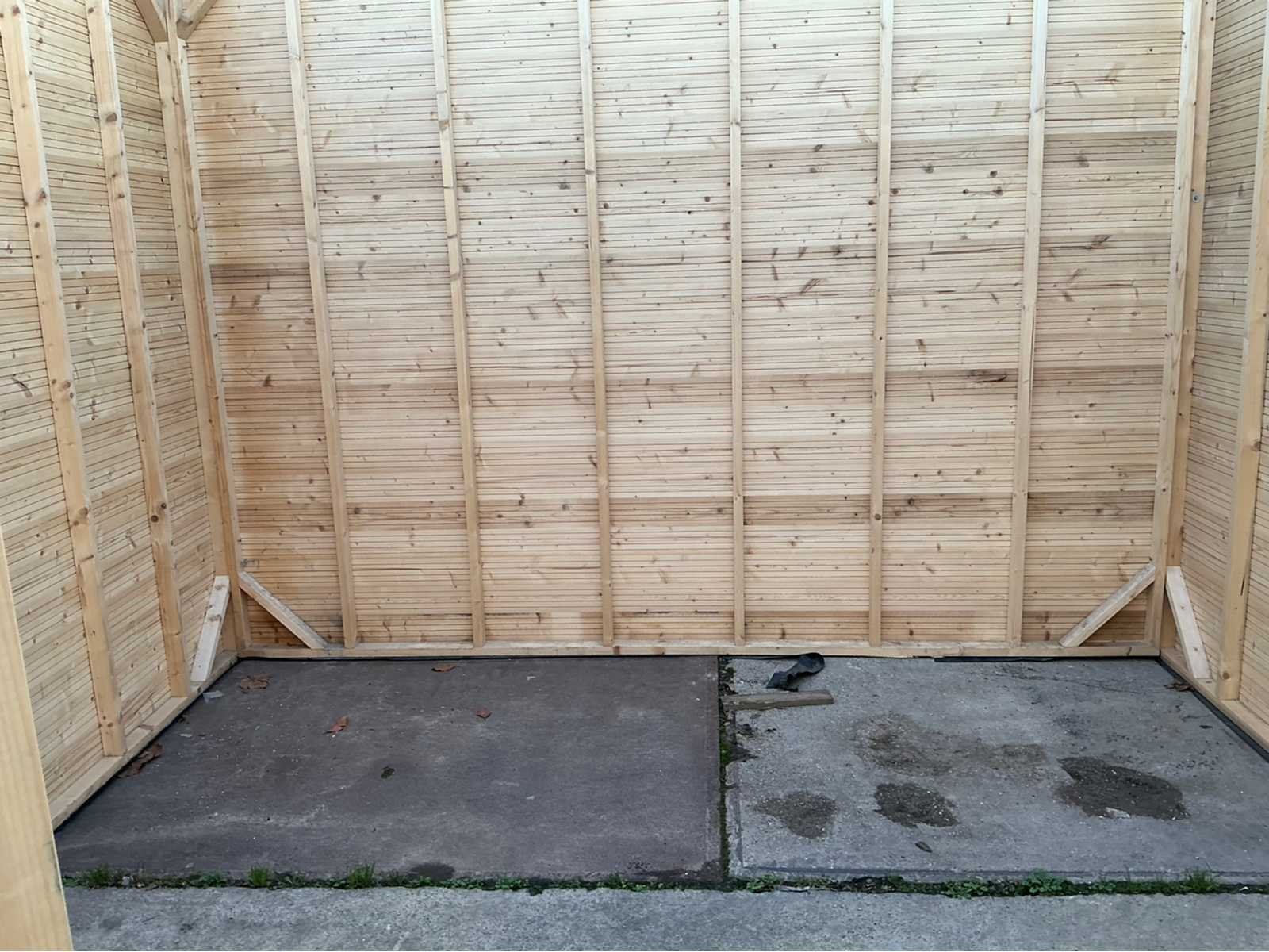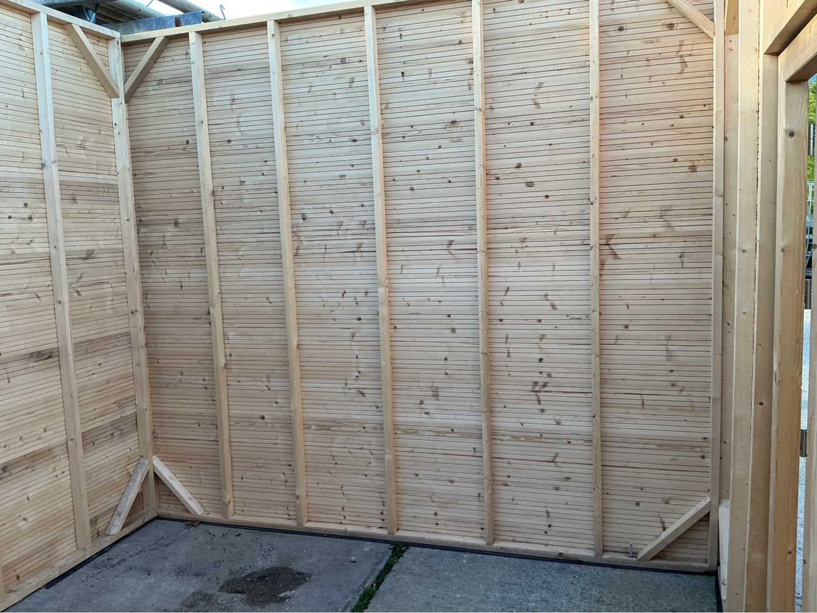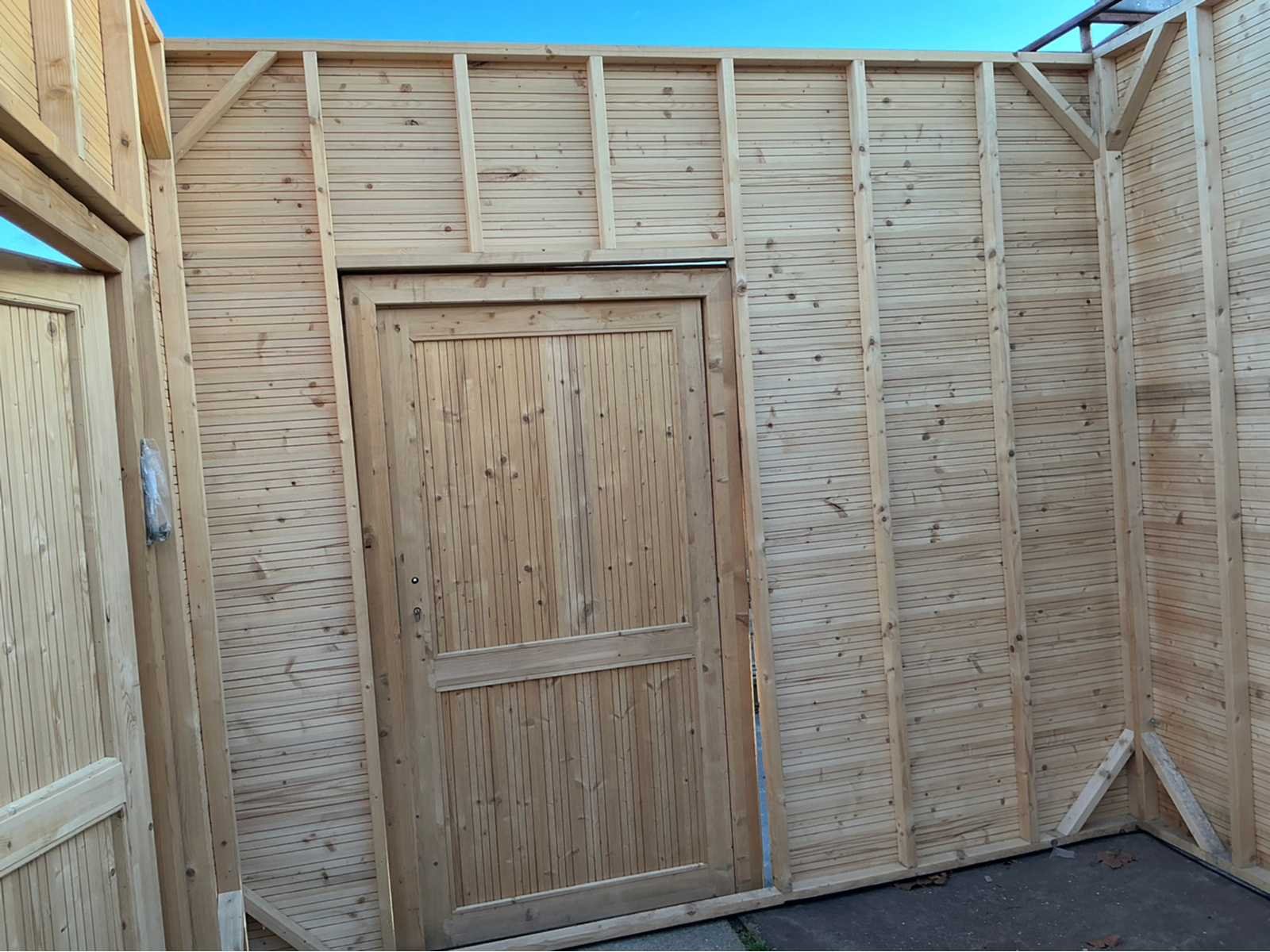 Dit lot bestaande uit: Tuinhuis muren met deuren, showroom model ( zonder dak en 19mm tandgroef beplanking ) is al reeds geïmpregneerd. Afmeting tuinhuis met enkele en dubbele deur LxBxH 3m breed x 3m60 lang x 3m40 hoog. Nee Merk: Thuinhuis