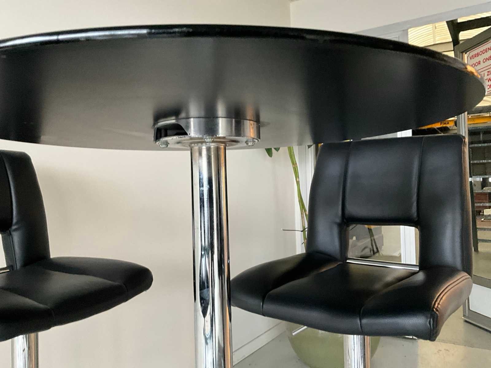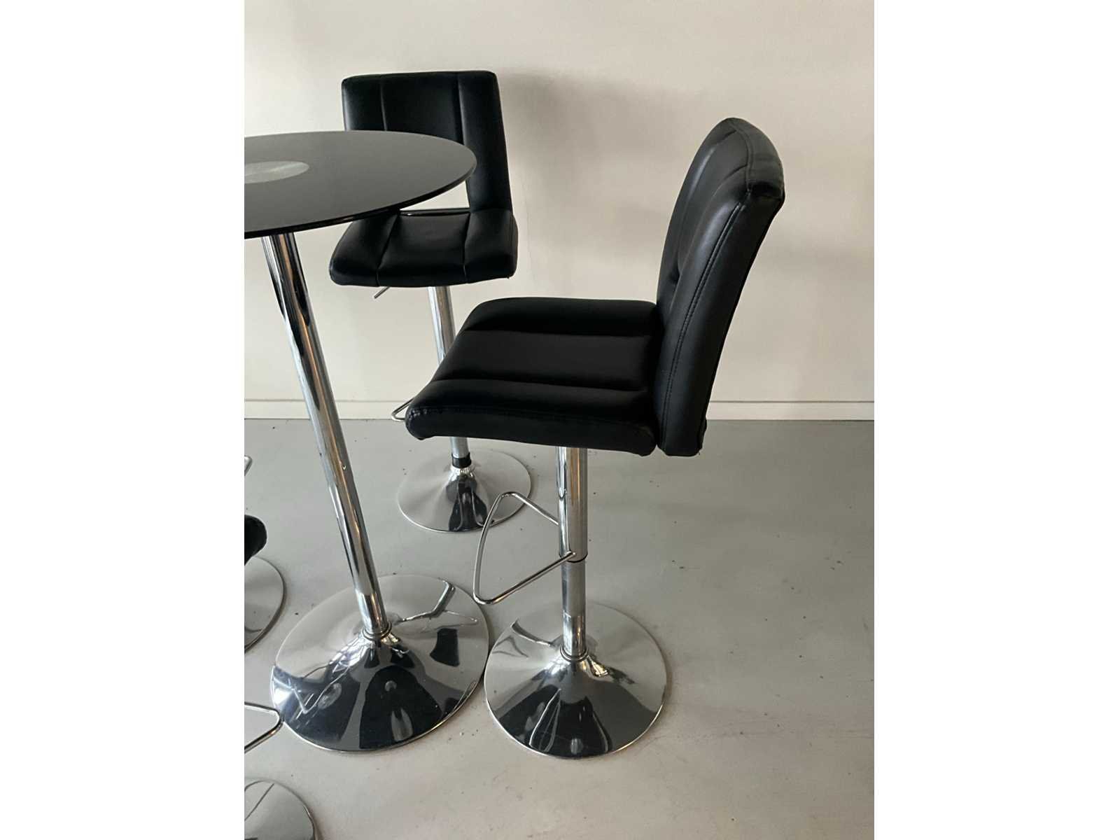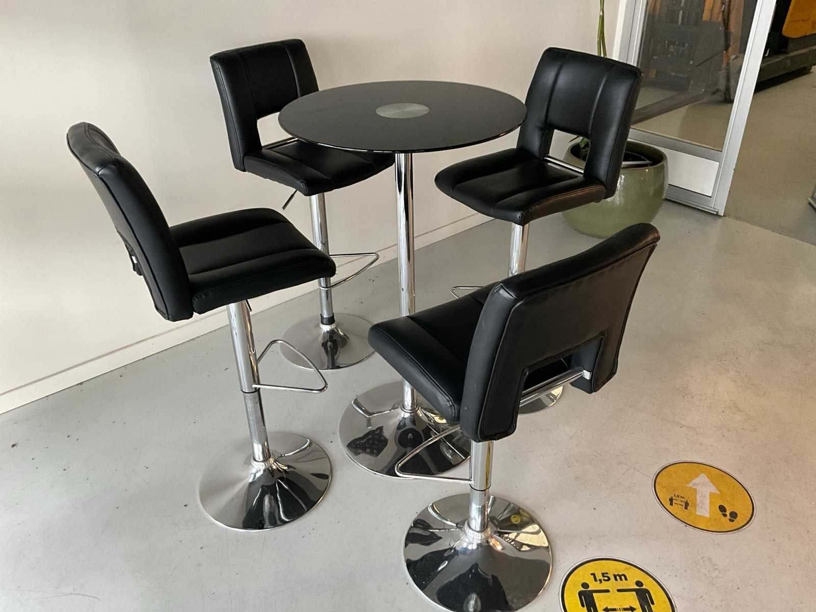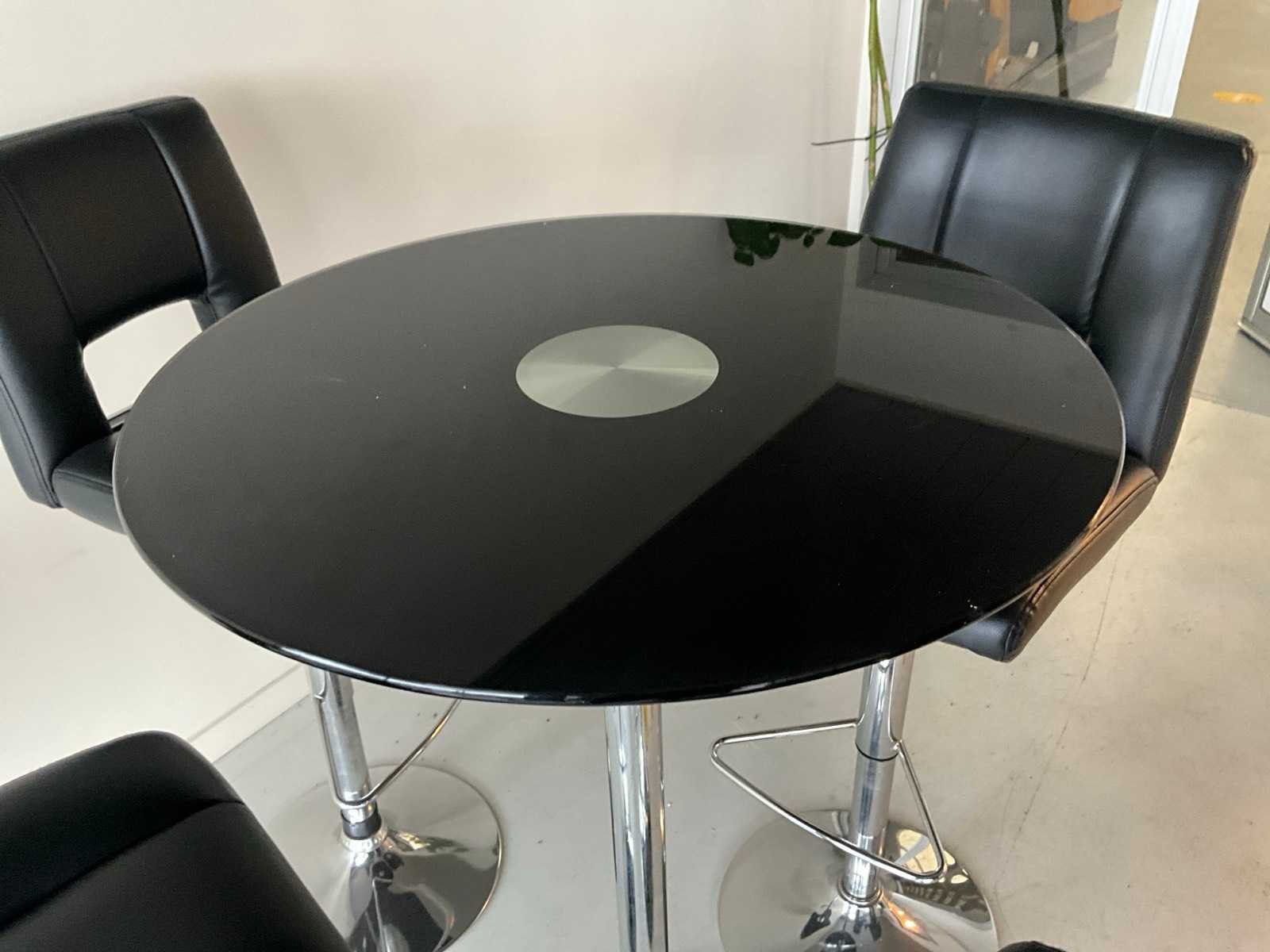 Tafel met glazen blad diameter 65cm. Hoogte 110cm. Draaibare barkrukken met kunstlederen zitting. Nee