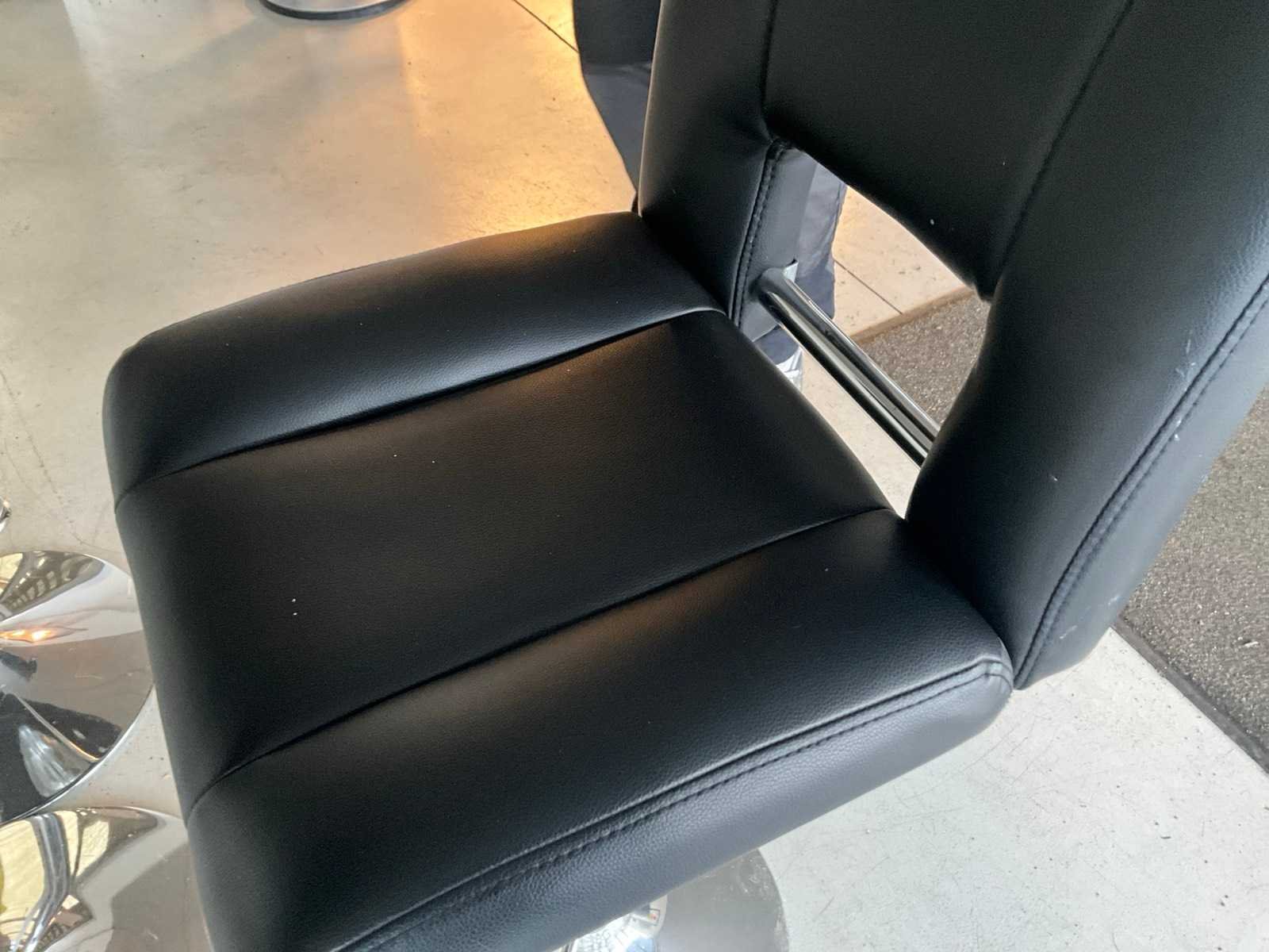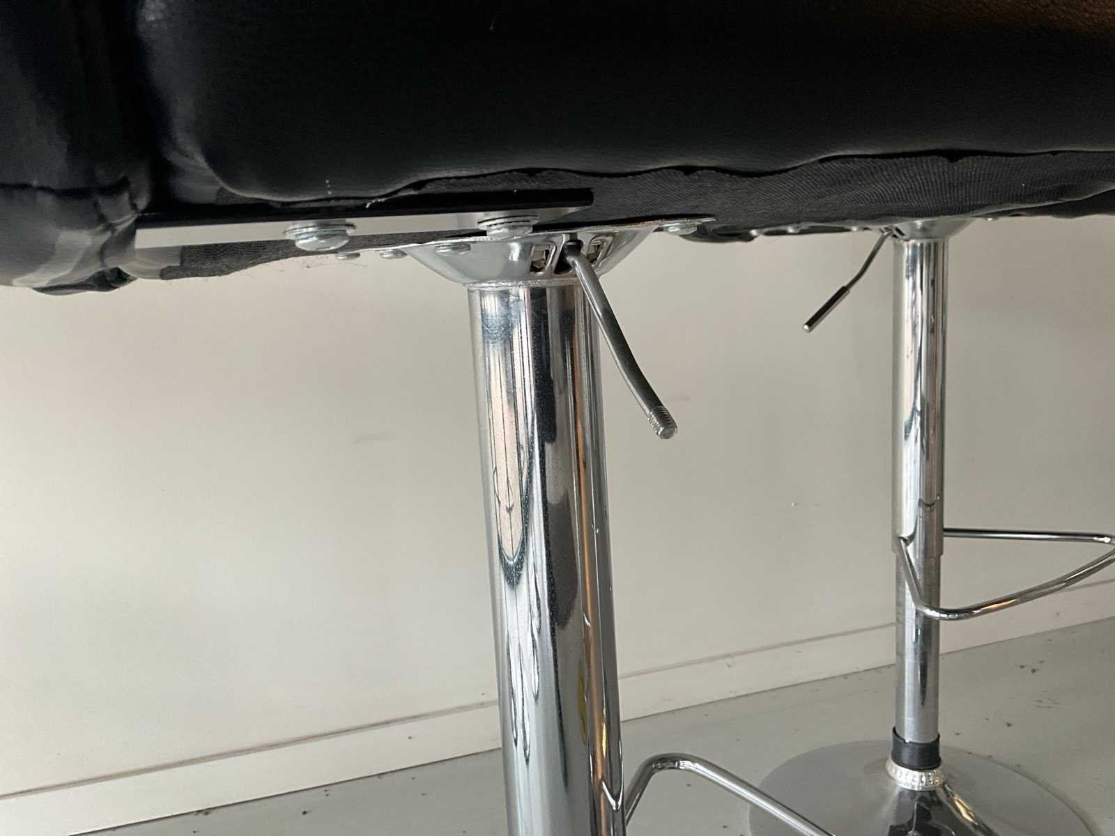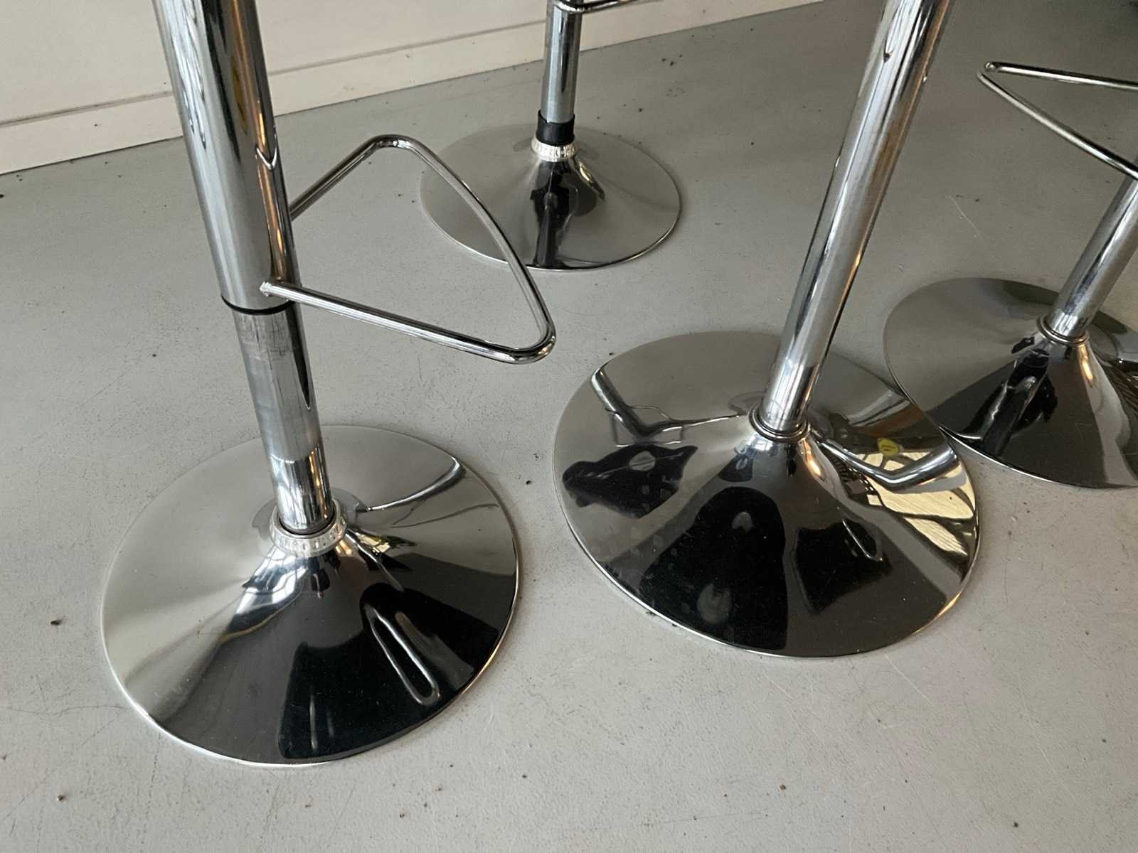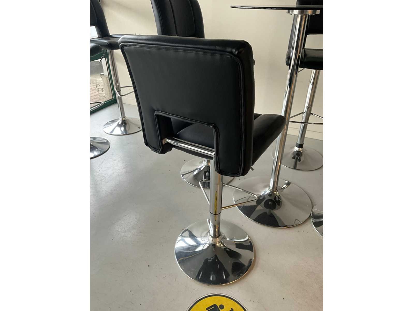 Tafel met glazen blad diameter 65cm. Hoogte 110cm. Draaibare barkrukken met kunstlederen zitting. Nee