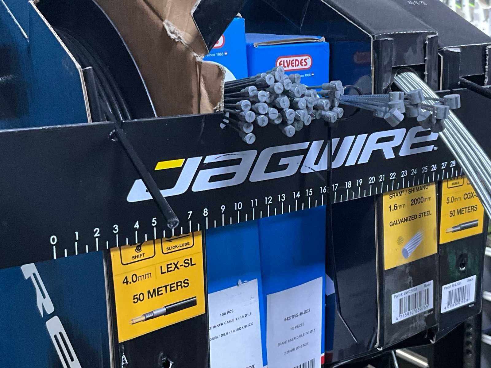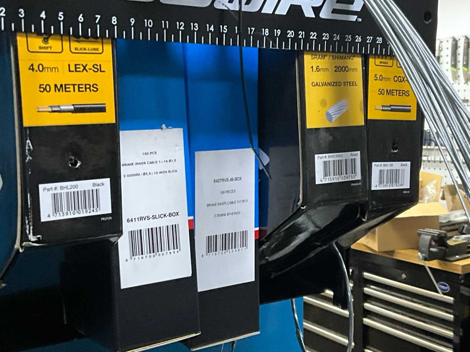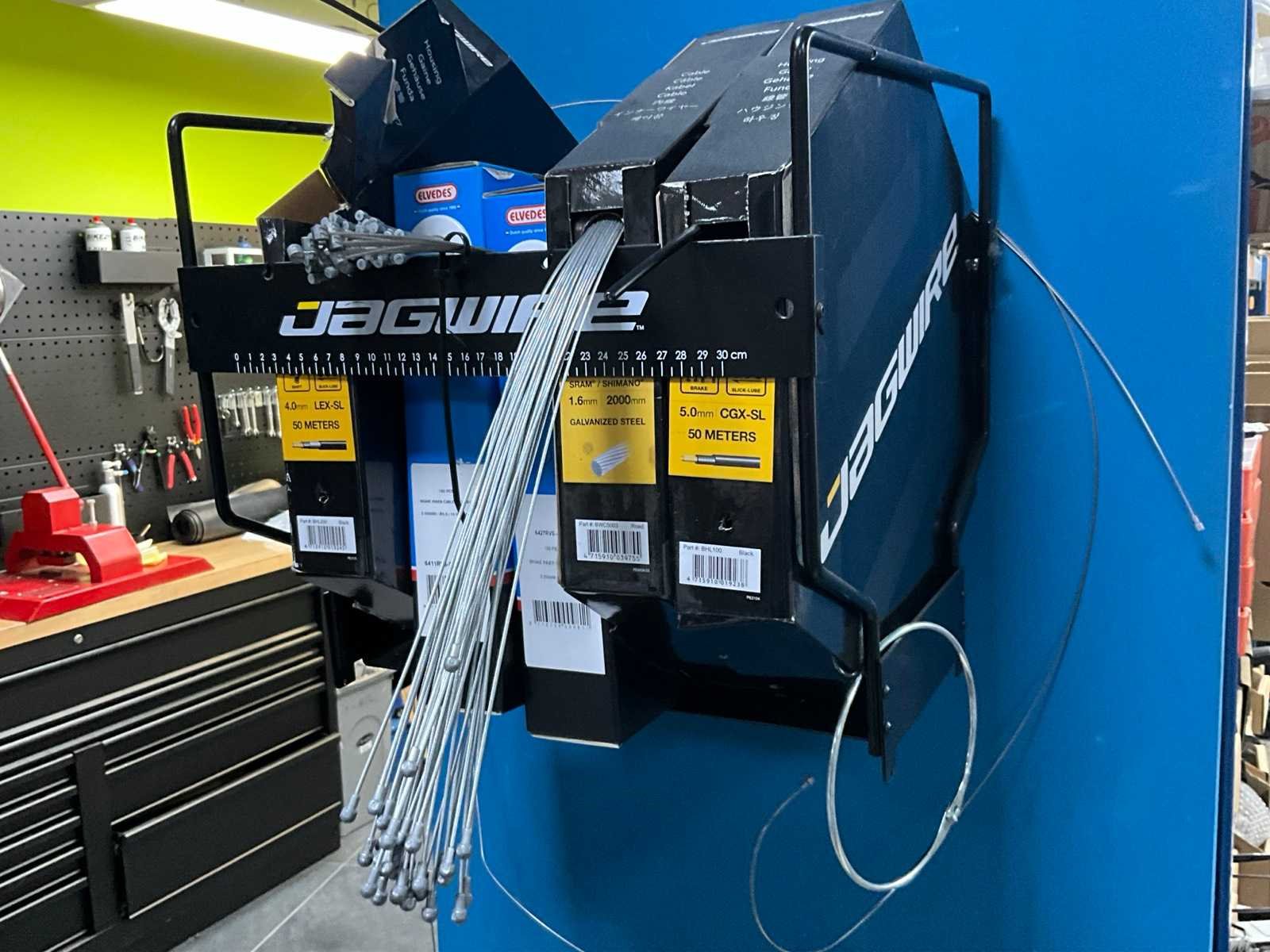 5 reeds aangebroken dozen remkabels waaronder Jagwire en Elvedes, In diverse maten en uitvoeringen, Compleet met muurbemonteerde metalen dispenserframe No