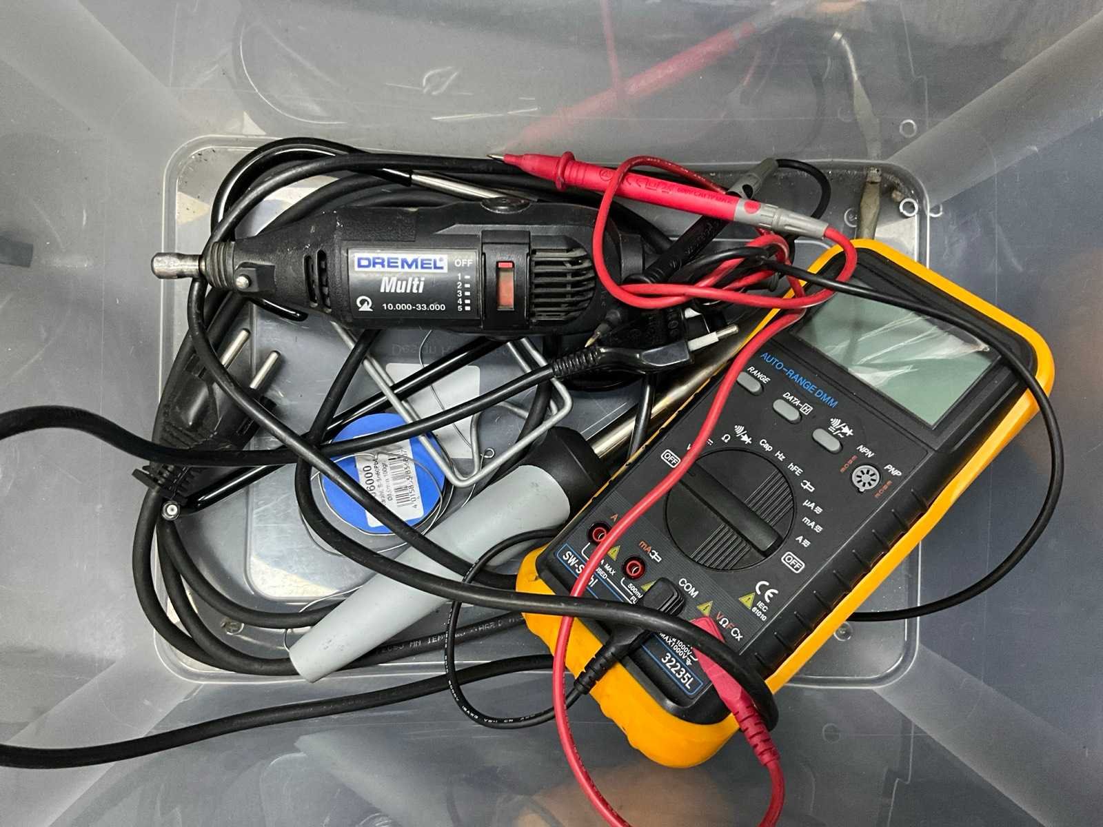 Waaronder: 1 multimeter SW-Stahl 32235L, 1 soldeerbout, 1 Dremel Multien 2 diverse accu schroefmachines. Liggende in pvc opbergbox No