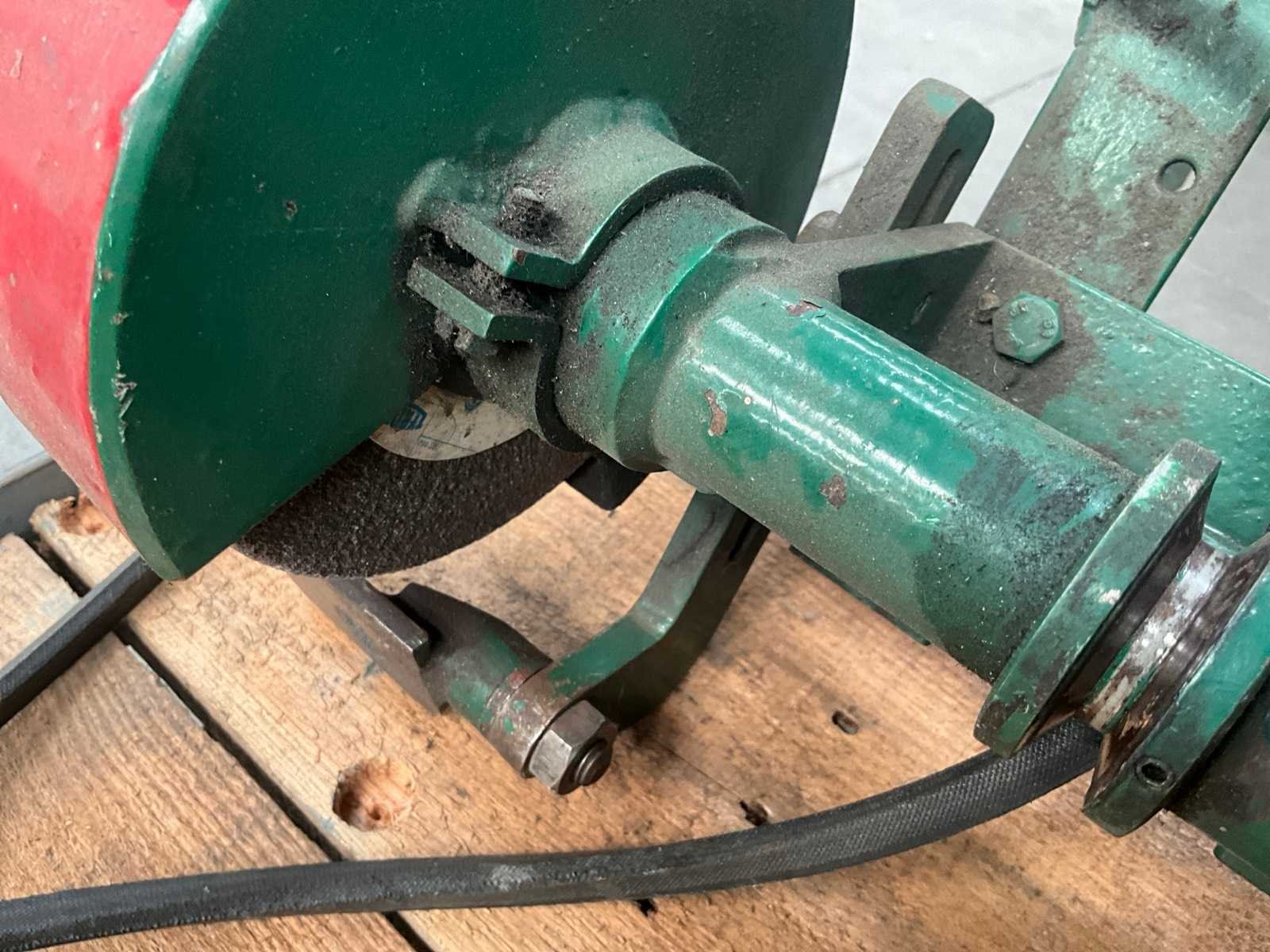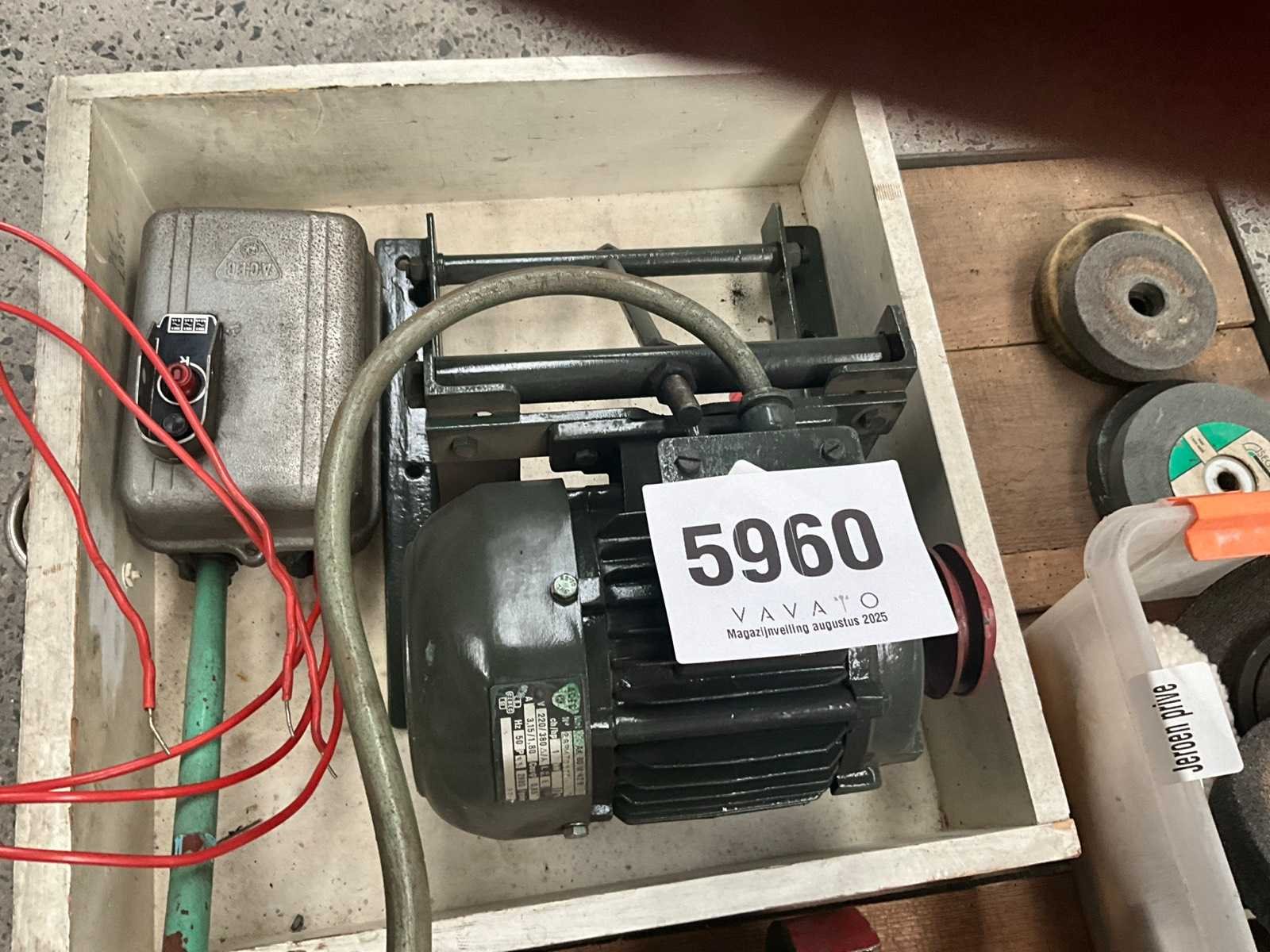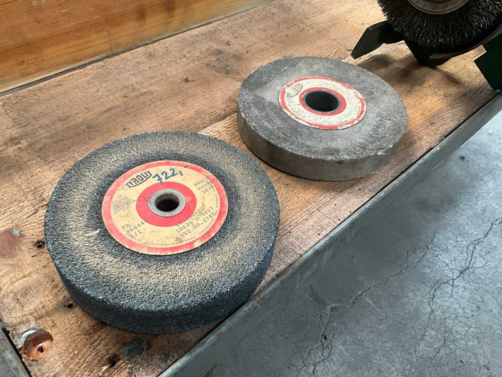 Gedemonteerd van muurwand, op metalen houder en voorzien van Tyrolit slijpsteen diameter 14 cm en 2,5 cm breed en staalborstel, compleet met 2 diverse slijpstenen Tyrolit 15 cm diameter in 2 verschillende diktes. Compleet elektromotor ACEC type AK 80 M 42 R, op metalen houder en voorzien van aan/uit schakelkast. No