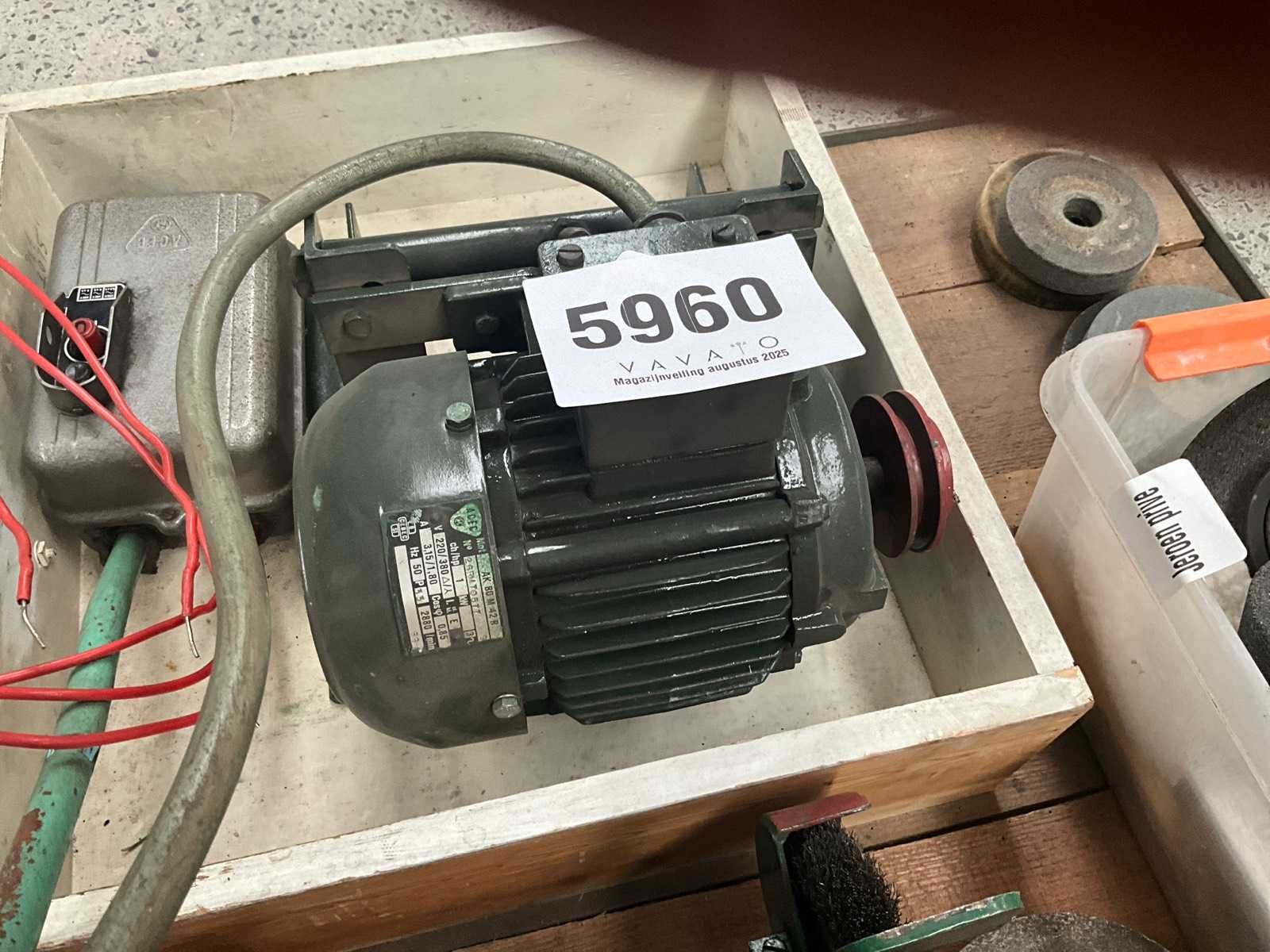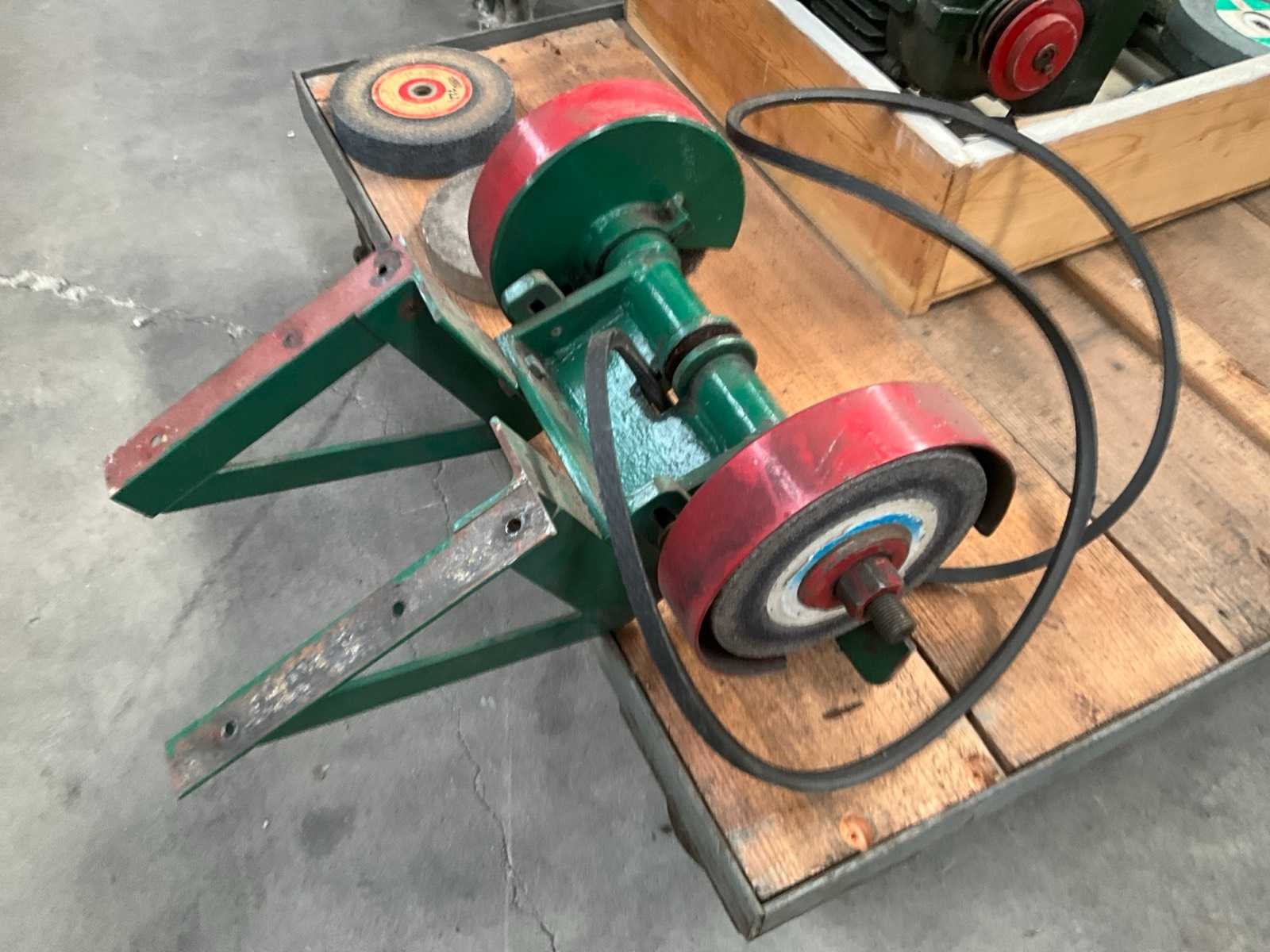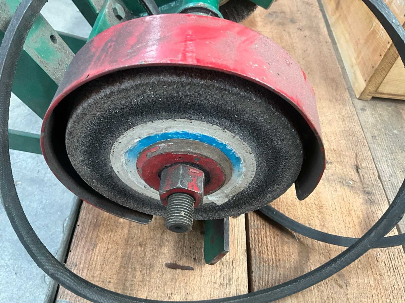 Gedemonteerd van muurwand, op metalen houder en voorzien van Tyrolit slijpsteen diameter 14 cm en 2,5 cm breed en staalborstel, compleet met 2 diverse slijpstenen Tyrolit 15 cm diameter in 2 verschillende diktes. Compleet elektromotor ACEC type AK 80 M 42 R, op metalen houder en voorzien van aan/uit schakelkast. No