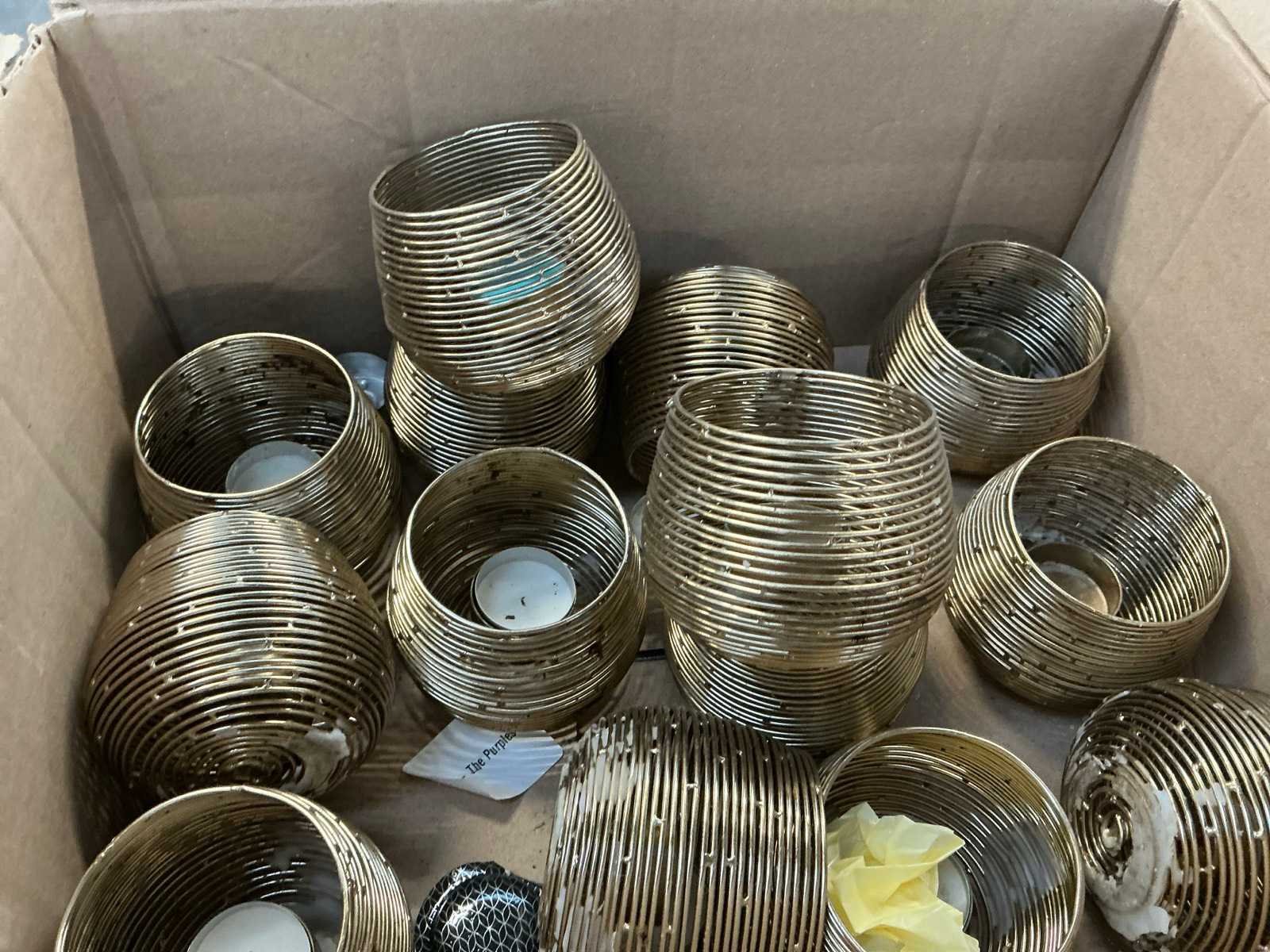 2 hoge metalen tafels TALENTI met afmeting circa 70 x 70 x 107 cm, 2 diverse koolzuurcilinders, 2 gedemonteerde hanglampen, 3 steunen elk voorzien van 2 tafeltjes, circa 12 theelichthouders No