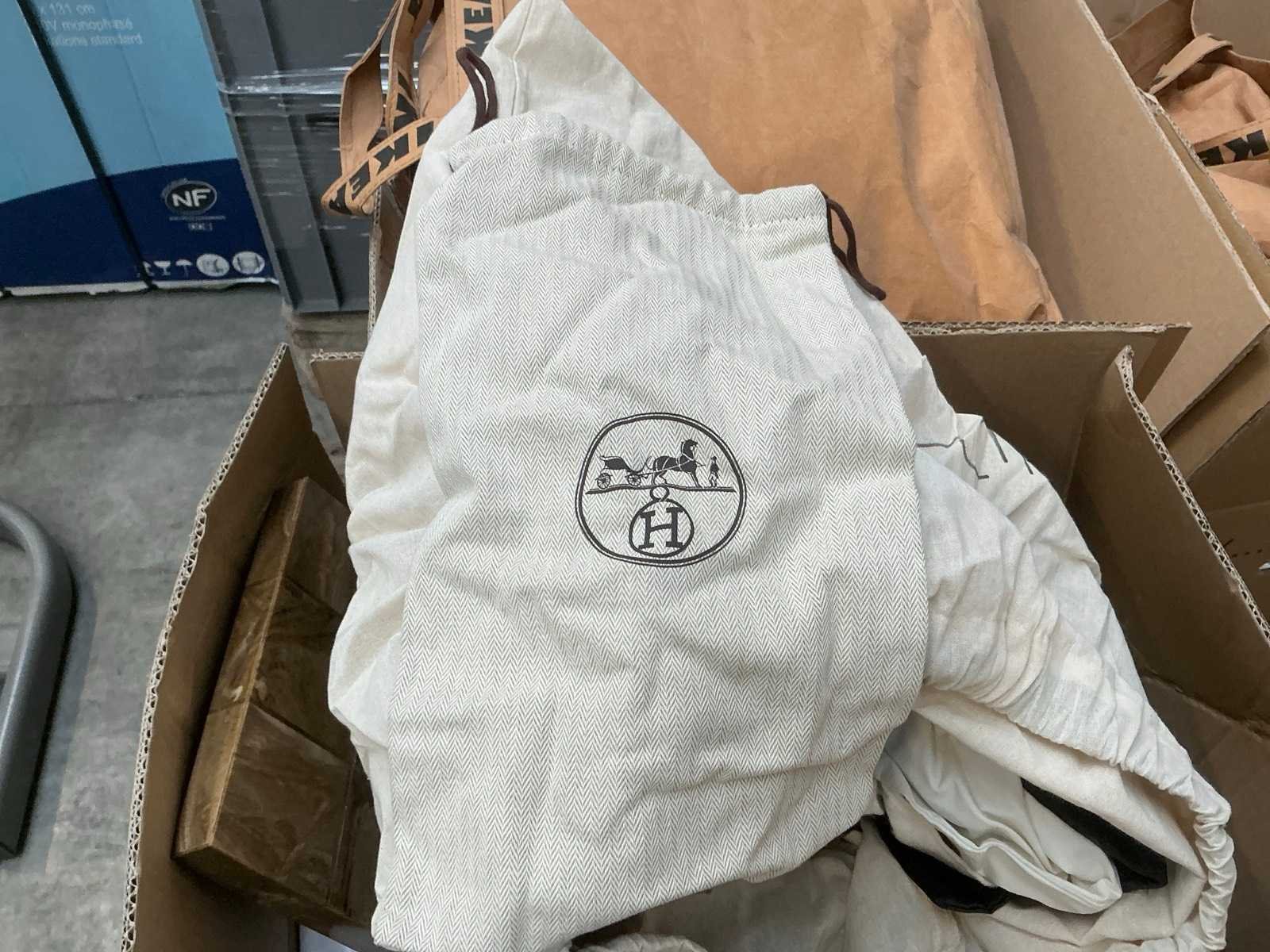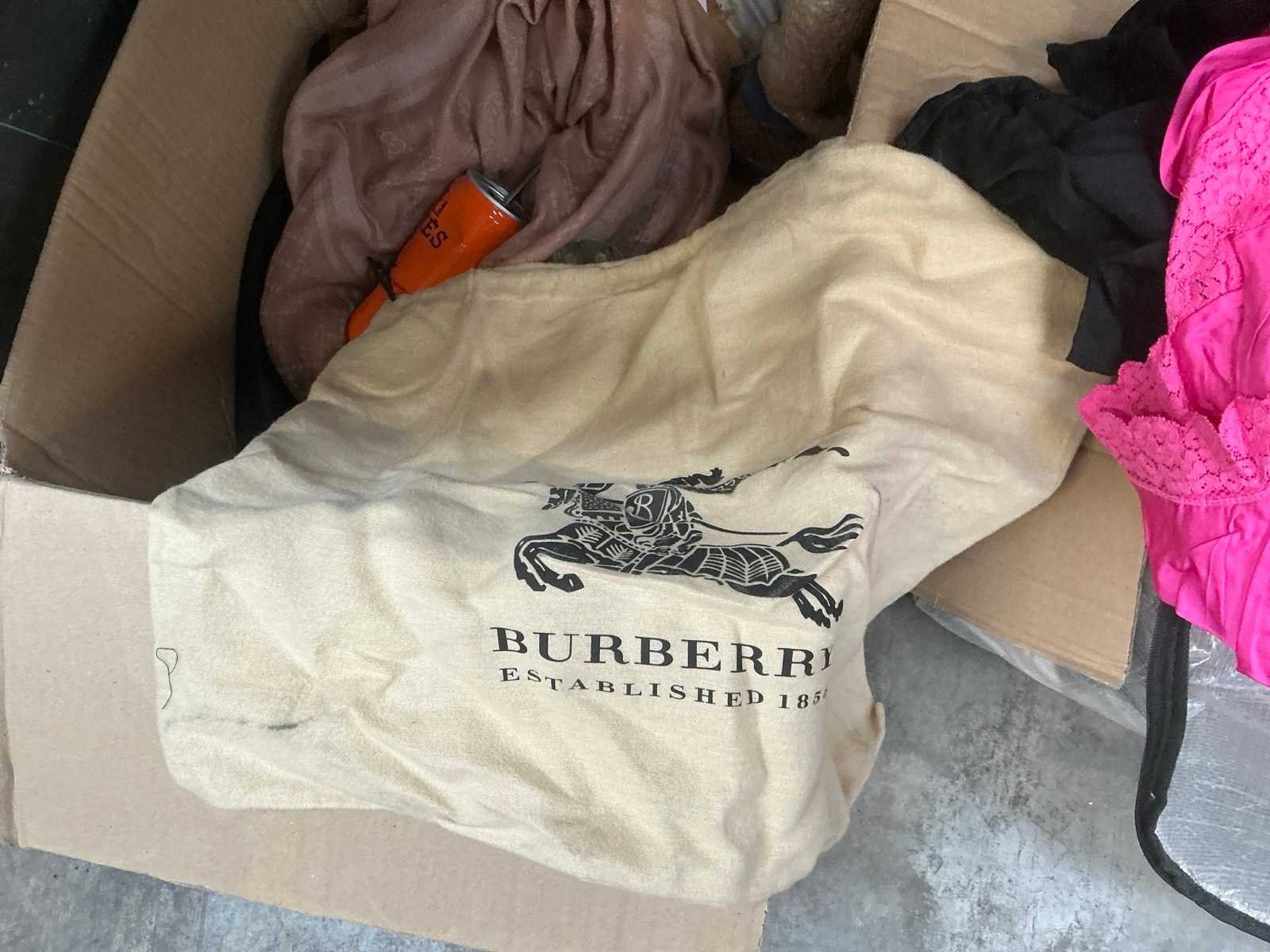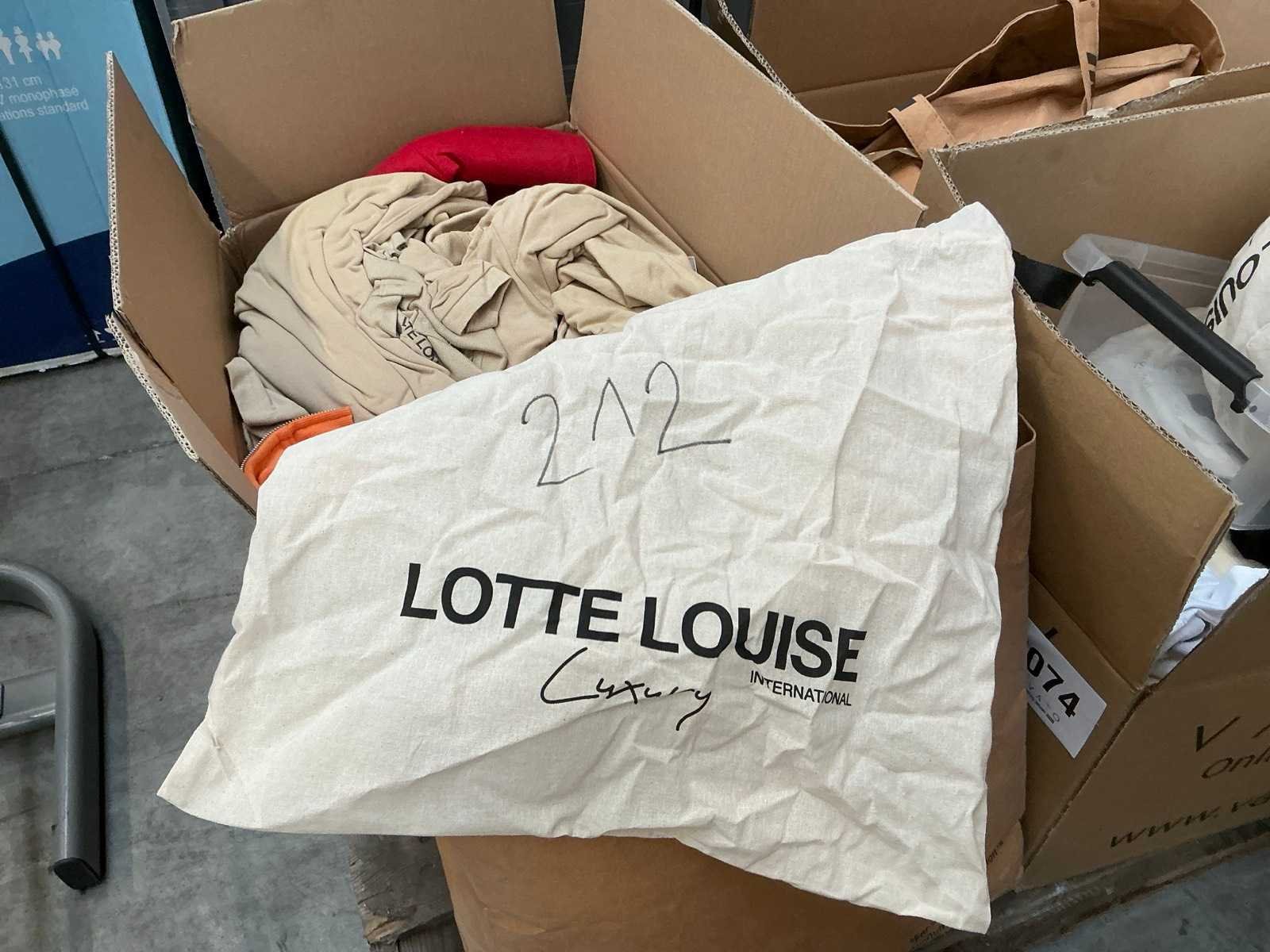 Diverse designer dummy’s waaronder sneeuwbol CHANEL, blikje HERMES, reclame paneel voorstellende vrouw met LOUIS VUITTON handtas, gift/ juwelen opbergers waaronder GUCCI, BREITELING, Instagram teller, strandtas, 2x sierkussen, doos inhoudende diverse stekkerdozen, decoratief houten kratje, diverse kleding waaronder damesbroeken, topjes, blouses, enzovoort in diverse maten, kleuren en uitvoeringen, diverse stoffen tassen getekend LOTTE LOUISE LUXURY, enz. No