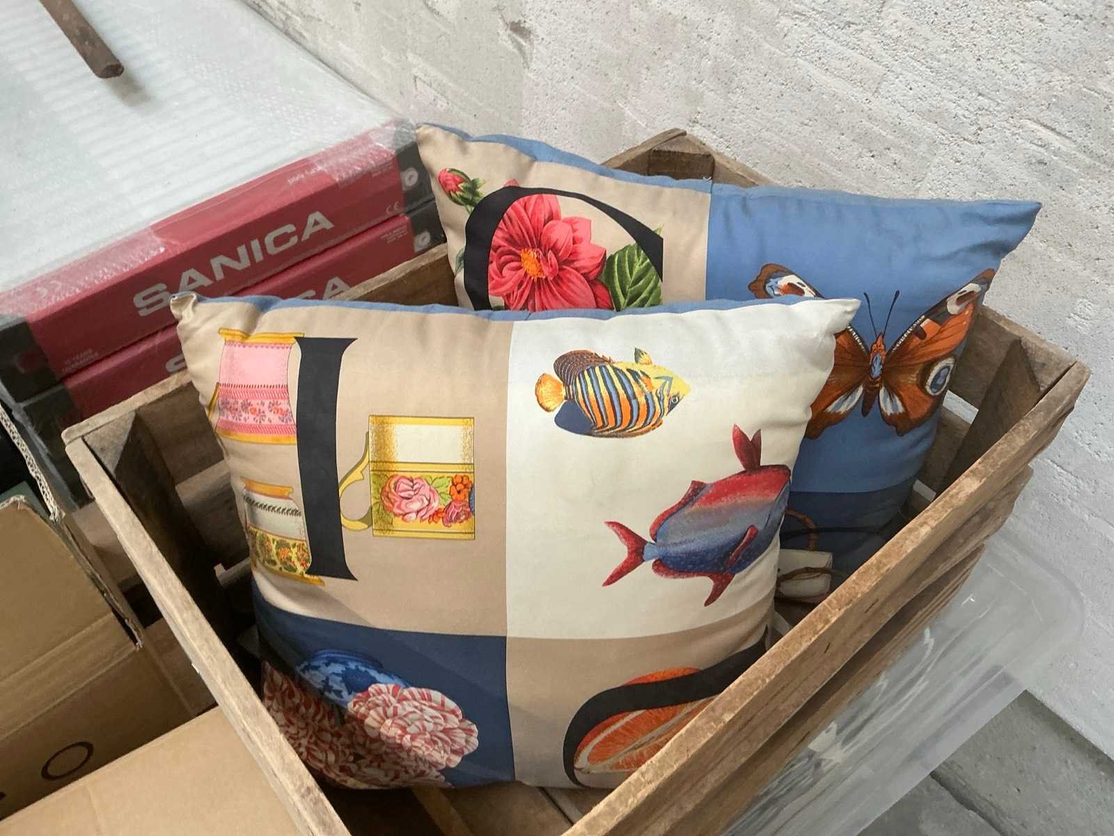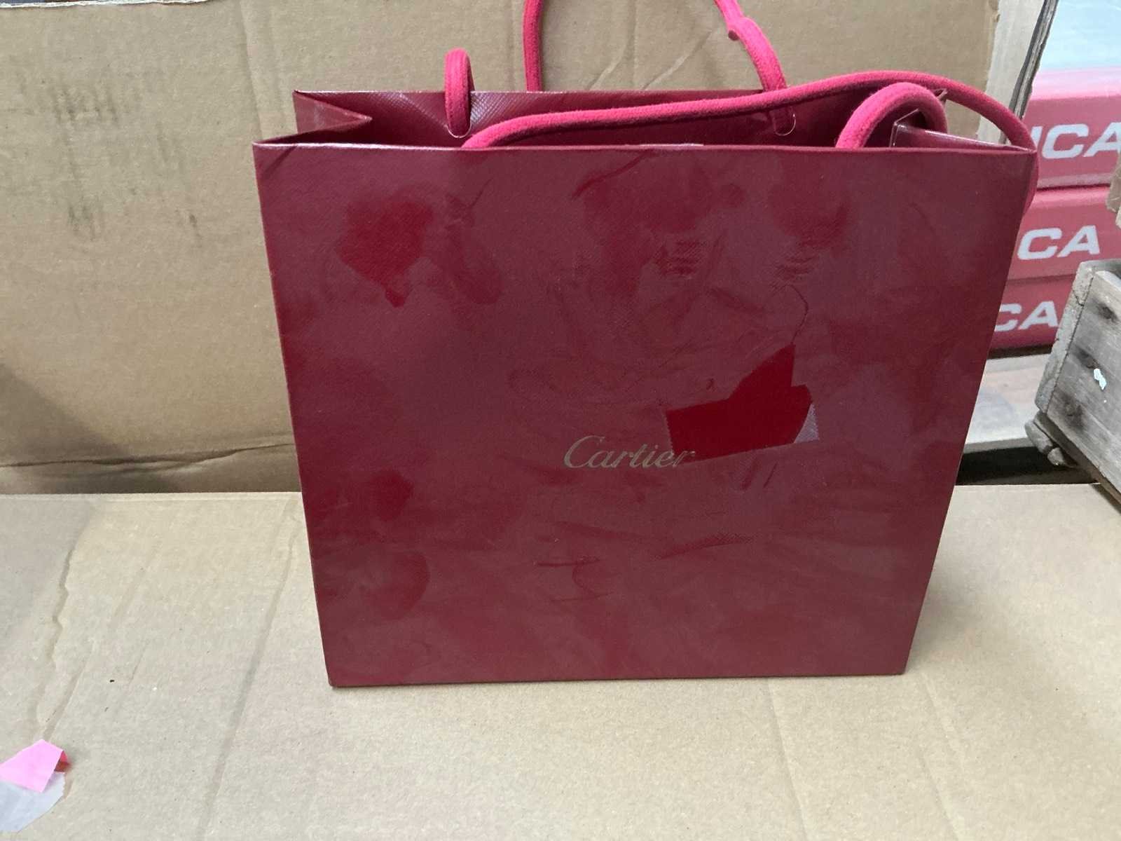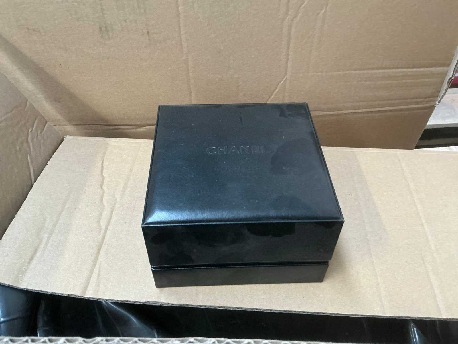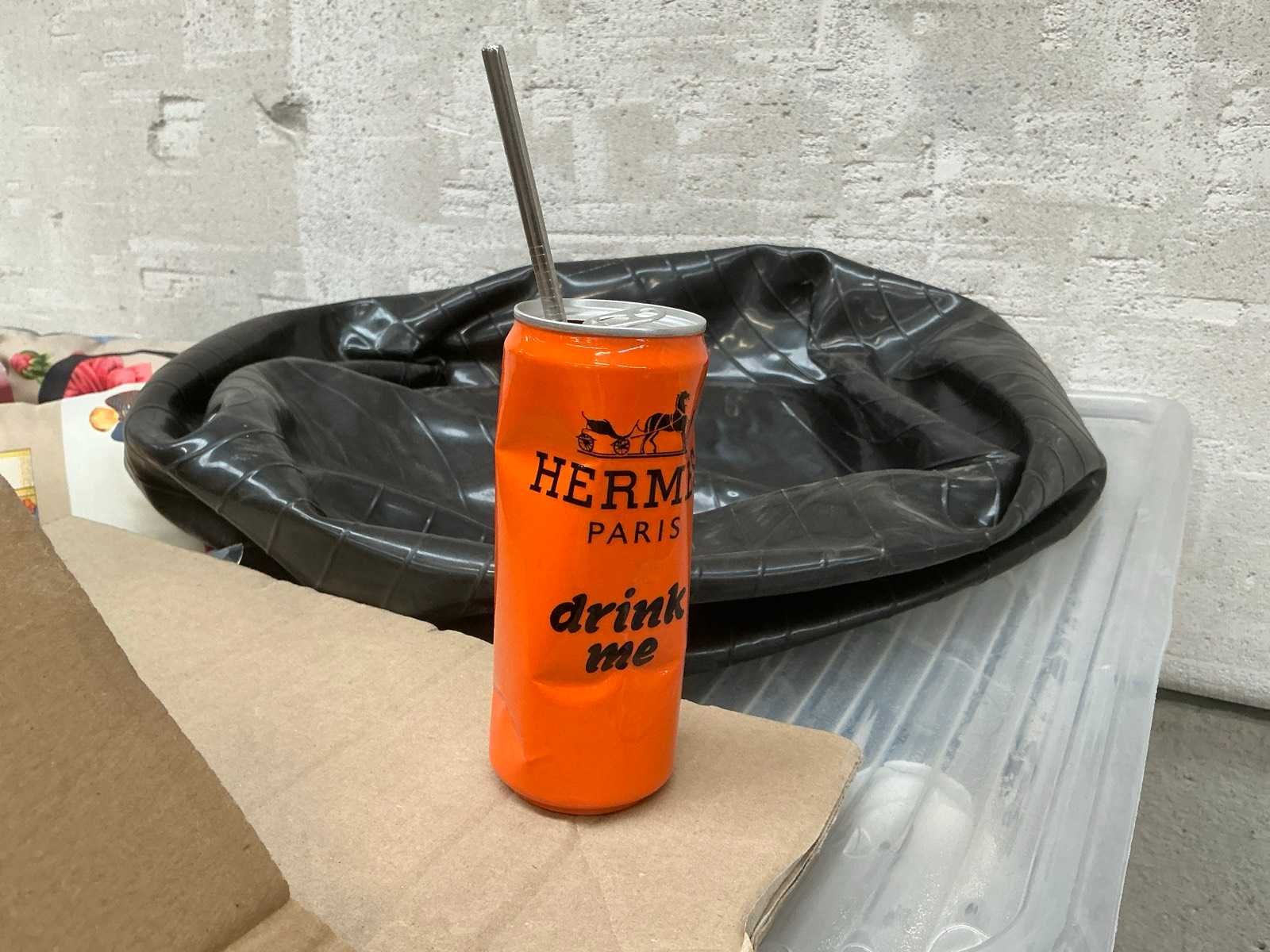 Diverse designer dummy’s waaronder sneeuwbol CHANEL, blikje HERMES, reclame paneel voorstellende vrouw met LOUIS VUITTON handtas, gift/ juwelen opbergers waaronder GUCCI, BREITELING, Instagram teller, strandtas, 2x sierkussen, doos inhoudende diverse stekkerdozen, decoratief houten kratje, diverse kleding waaronder damesbroeken, topjes, blouses, enzovoort in diverse maten, kleuren en uitvoeringen, diverse stoffen tassen getekend LOTTE LOUISE LUXURY, enz. No