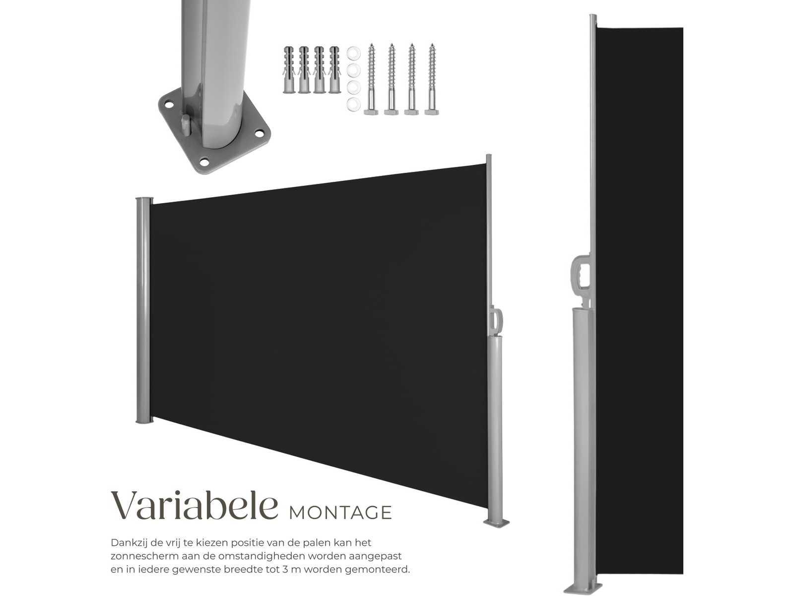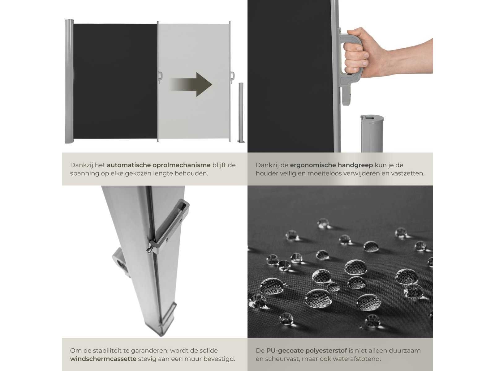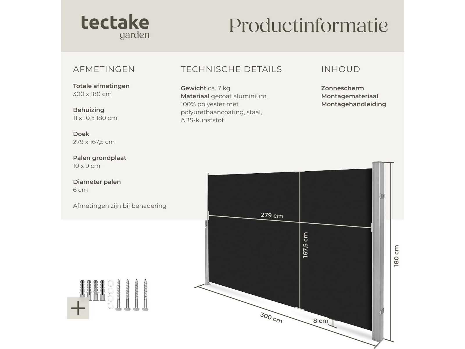 Technische details: Totale afmetingen bij uithaal (LxH): maximaal 300 cm x 180 cm (inclusief behuizing) Afmetingen behuizing (LxWxH): 11 x 10 x 180 cm Afmetingen van de basisplaatpalen (LxW): 10 x 9 cm Diameter van de palen: Ø 60 mm Afmetingen van de stof (LxH): ca. 279 x 167,5 cm Hoogte van de stof vanaf de vloer: ca. 8 cm Gewicht: 7 kg Materiaal: 100% polyester textielstof (240 g/m²), PU-coating, aluminium poedergecoate schermbehuizing en steunpalen, kunststof elementen Non
