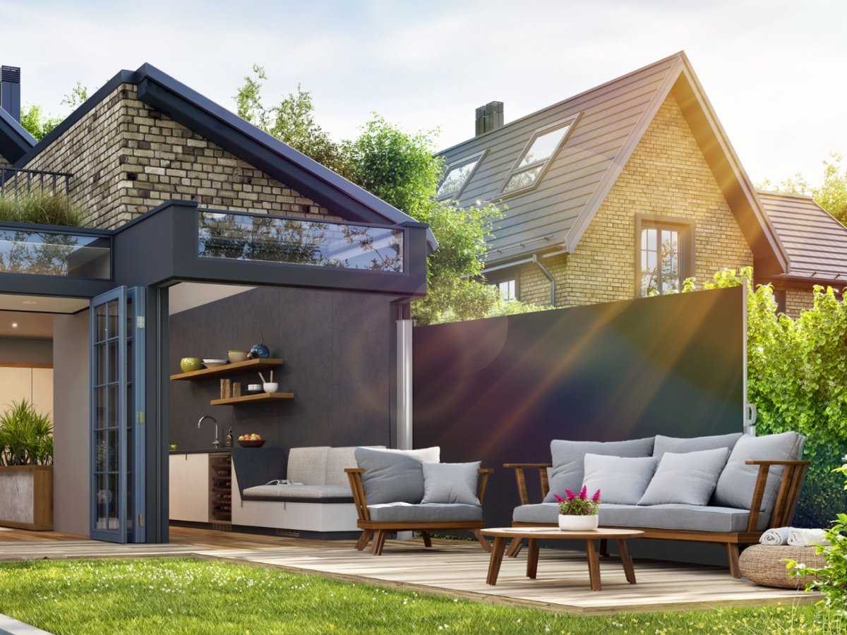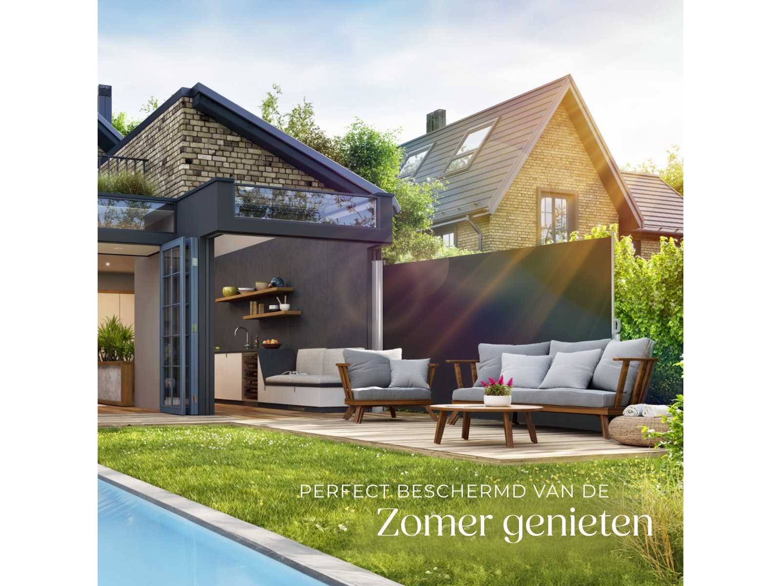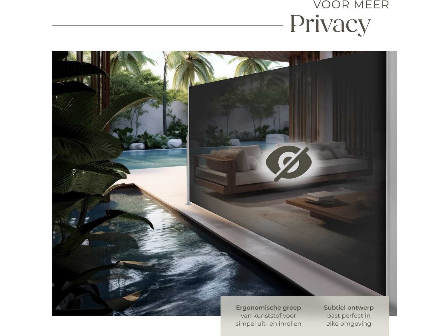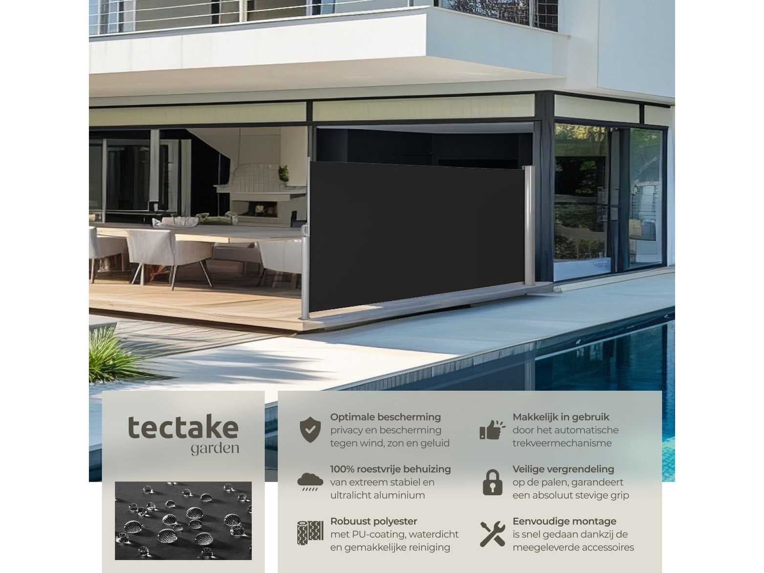Technische details: Totale afmetingen bij uithaal (LxH): maximaal 300 cm x 180 cm (inclusief behuizing) Afmetingen behuizing (LxWxH): 11 x 10 x 180 cm Afmetingen van de basisplaatpalen (LxW): 10 x 9 cm Diameter van de palen: Ø 60 mm Afmetingen van de stof (LxH): ca. 279 x 167,5 cm Hoogte van de stof vanaf de vloer: ca. 8 cm Gewicht: 7 kg Materiaal: 100% polyester textielstof (240 g/m²), PU-coating, aluminium poedergecoate schermbehuizing en steunpalen, kunststof elementen Non
