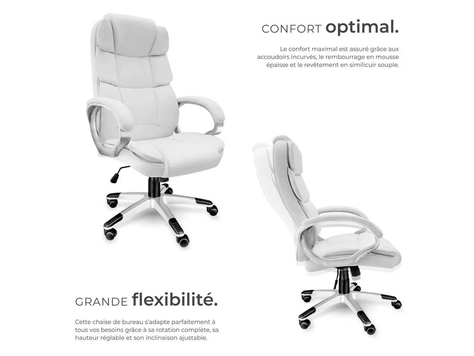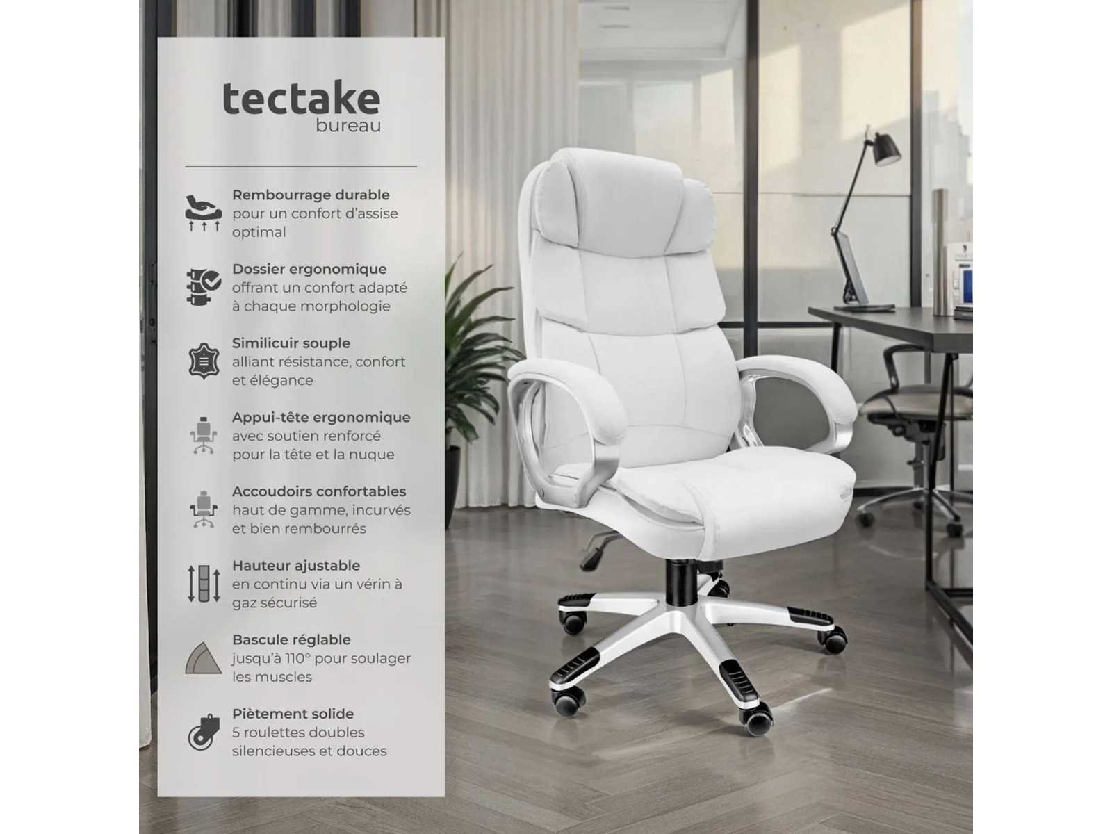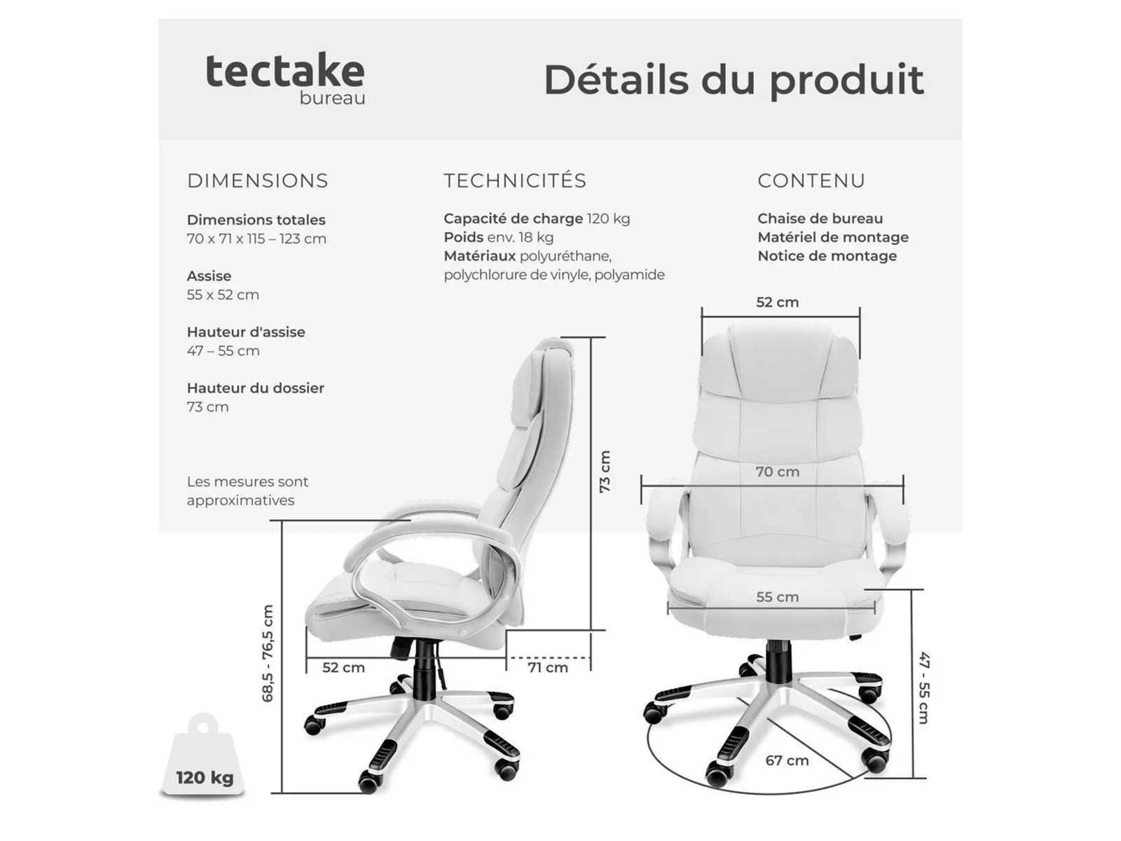 Afmetingen directiestoel (BxDxH): ca. 70 x 71 x 115 - 123 cm Zitoppervlak (Grootte x V): ongeveer 55 x 52 cm Zithoogte: ca. 47 - 55 cm Rugsteunhoogte: ca. 73 cm Armleuningen (BxD): ca. 8 x 44 cm Binnenafstand tussen armleuningen: ca. 54 cm Hoogte van armleuningen boven de vloer: ca. 68,5 - 76,5 cm Kruisbeen (LxW): ongeveer 67 x 67 cm Wielen (Øx w): ca. 5 x 5 cm Dikte van de vulling: van 8 tot 12 cm Maximaal ondersteund gewicht: 120 kg Gewicht: ca. 17,8 kg Materialen: polyurethaan, polyvinylchloride, polyamide Non